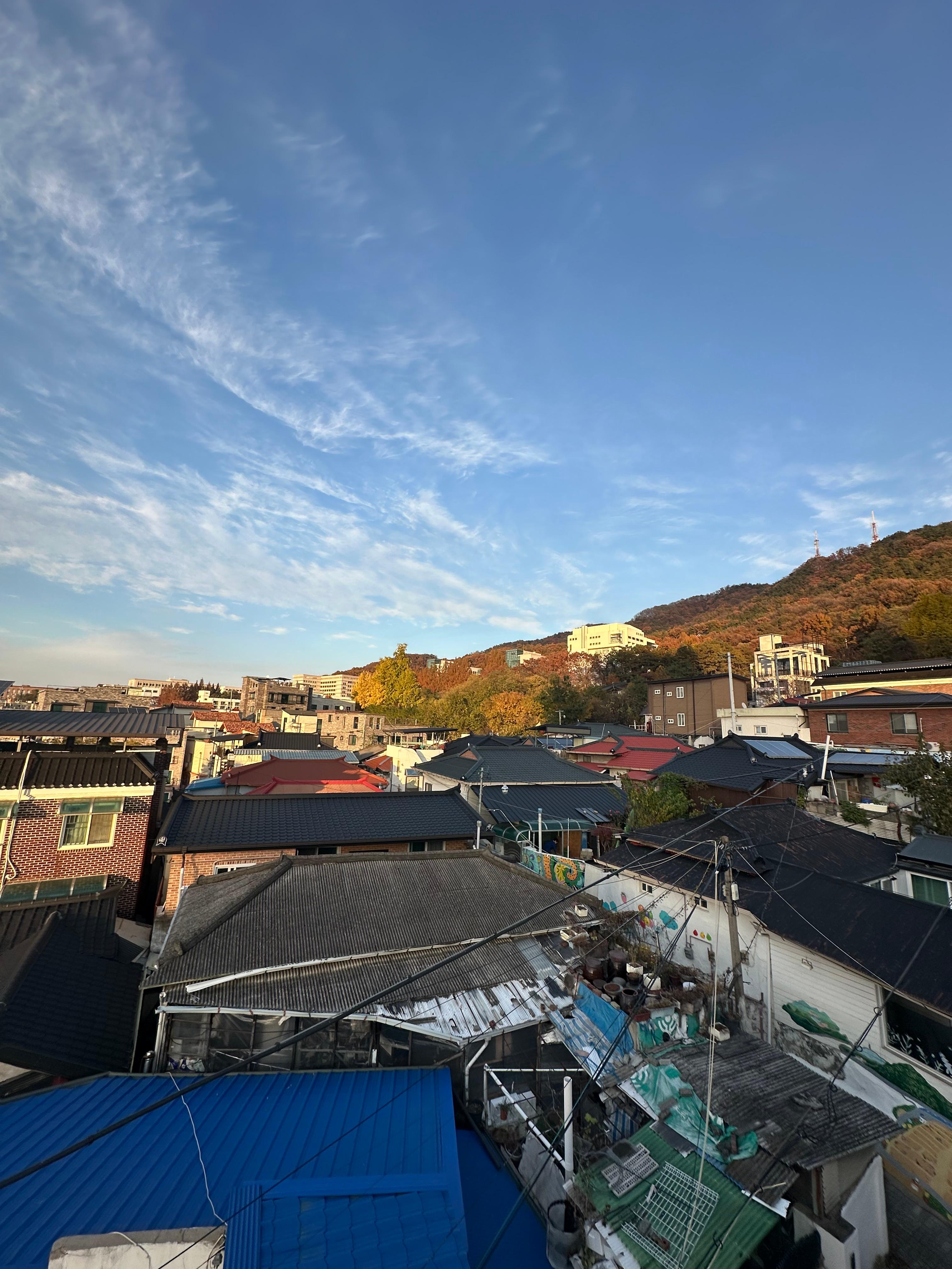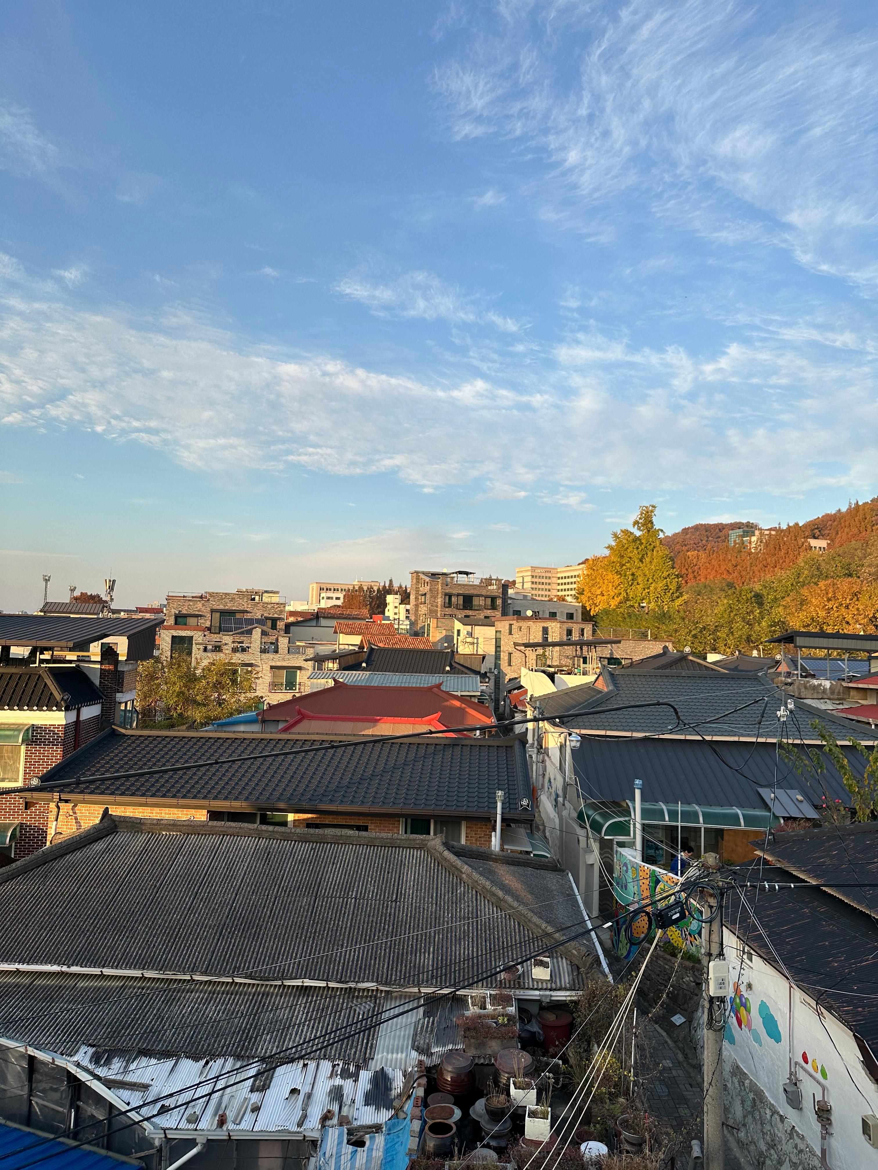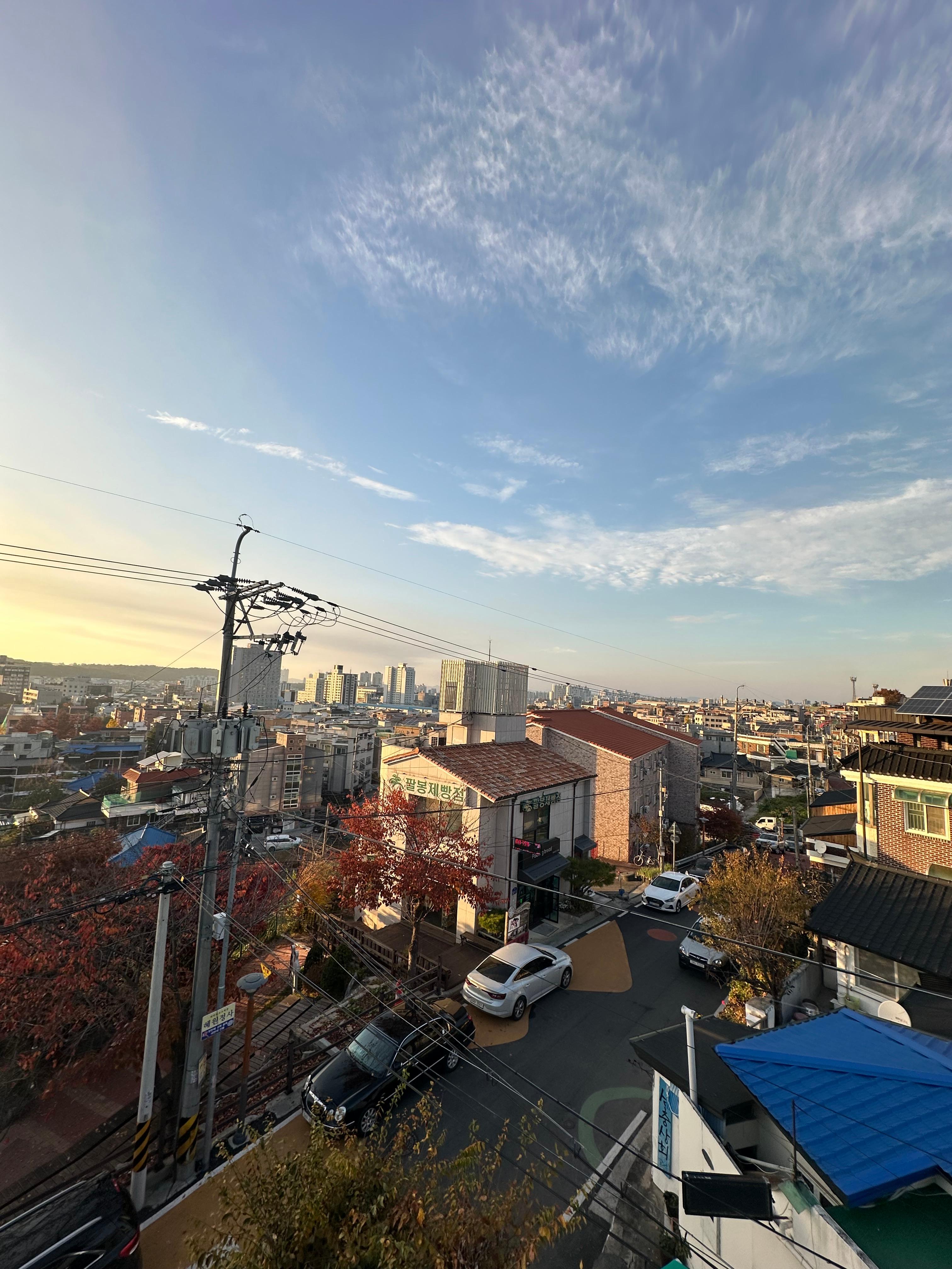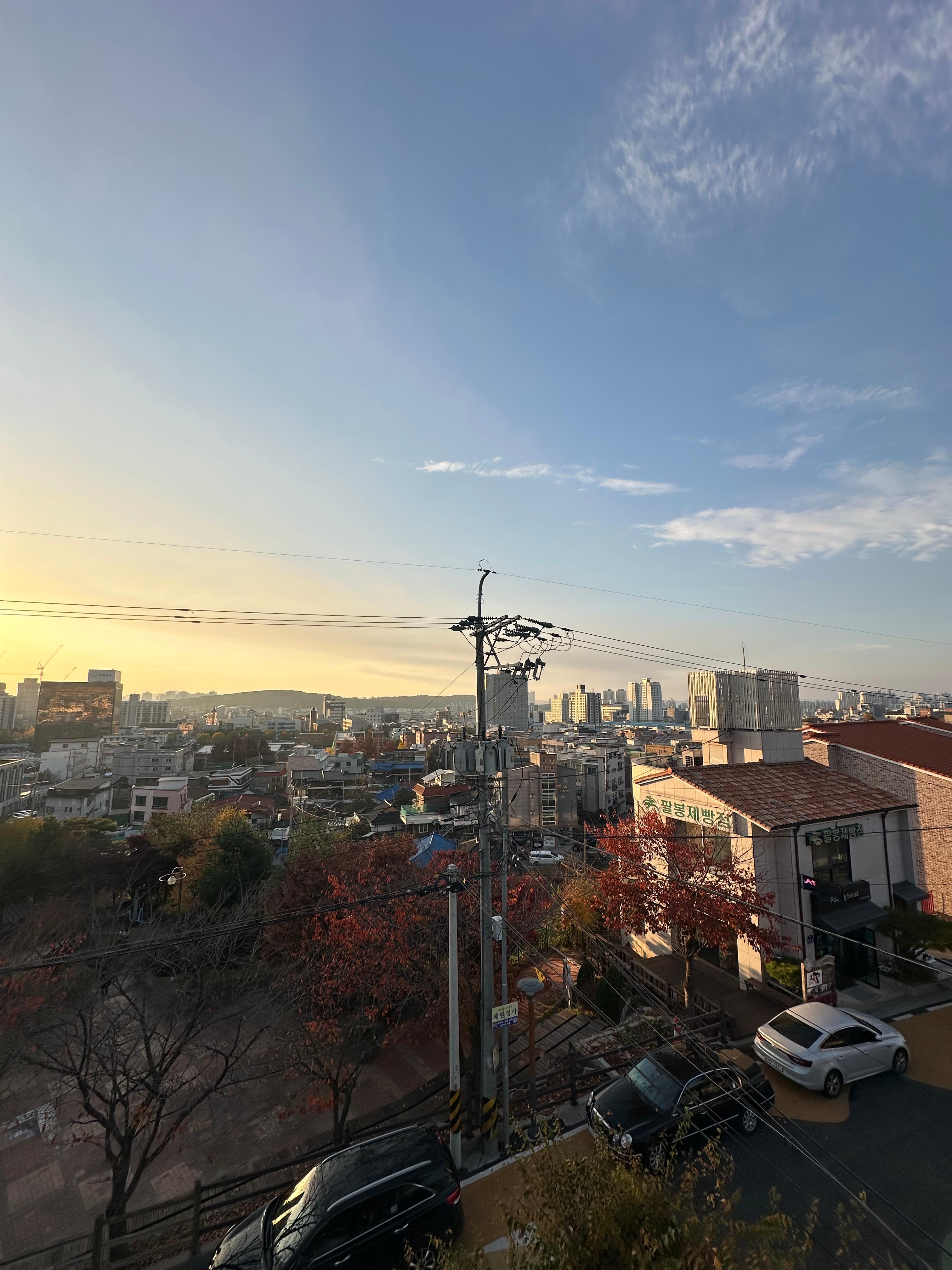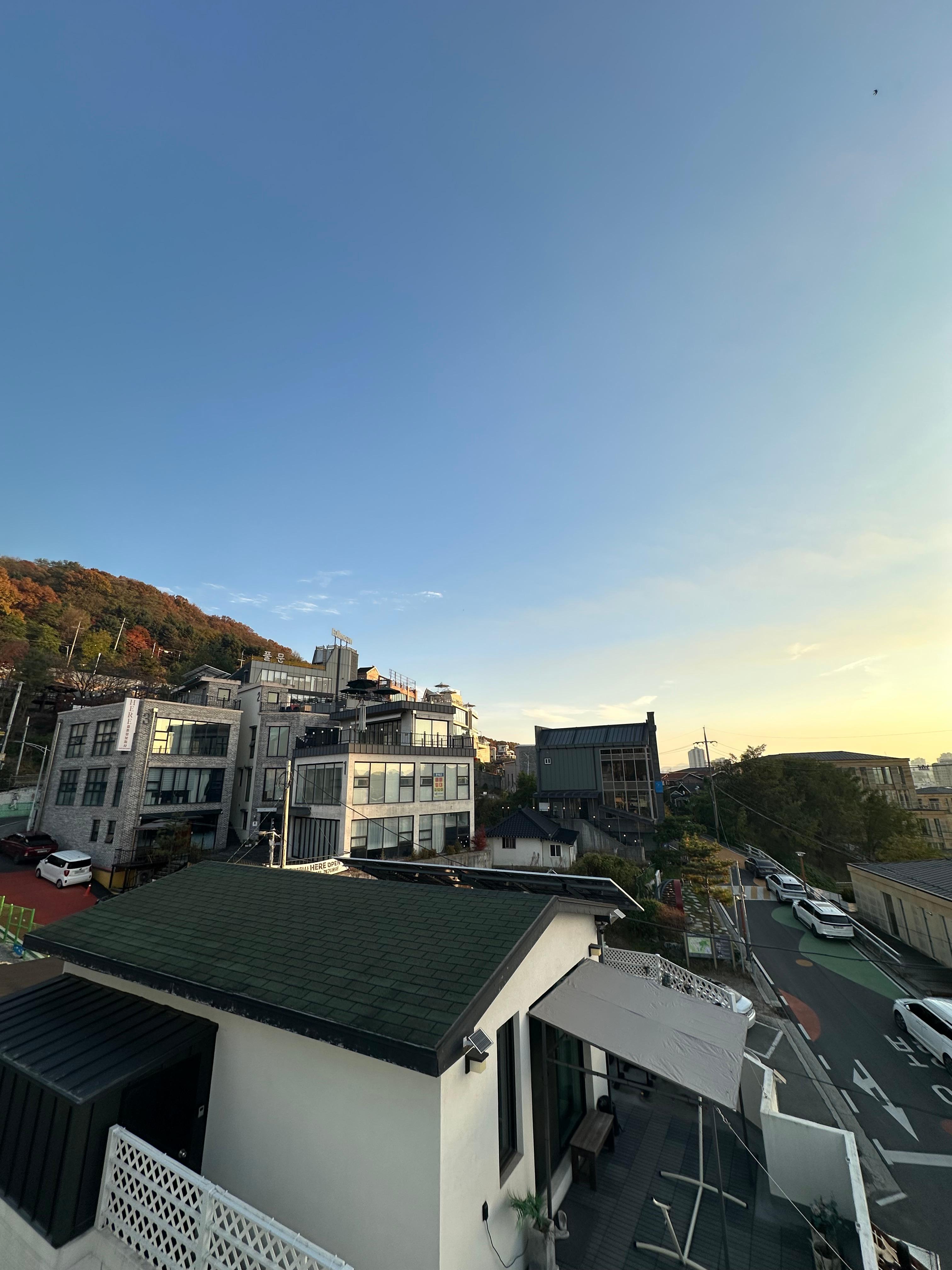 저는 3시 조금 넘은 시간이 들어와서 약 2시간동안 청주 수암골 스타로니아 카페에서 시간을 보내게 되었는데요. 1시간 30분 정도 보다가 루프탑에 올라가보고 싶어서 올라왔습니다. 아무래도 청주 시내 카페가 아니다보니 조용한 모습이었습니다. 언덕위에 있느 수암골이라 그런지 정말 청주 시내가 한눈에 보이는 풍경이구요. 루프타 덕분에 굳이 수암골 전망대 가지 않아도 될정도였습니다. 영광이네 국수 방향에도 카페가 있지만 몇년전부터 운영을 하지 않는 곳이다보니 조금 아쉽긴합니다. 경제가 어렵다보니 공실률이 늘어만 가는 것 같은데 경제가 호전이 되면 좋을 것 같습니다. 11월초라 해가 조금 빨리 지다보니까 5시가 다 되어가는 시간에 수암골에서 이렇게 일몰을 볼 수 가 있었습니다.