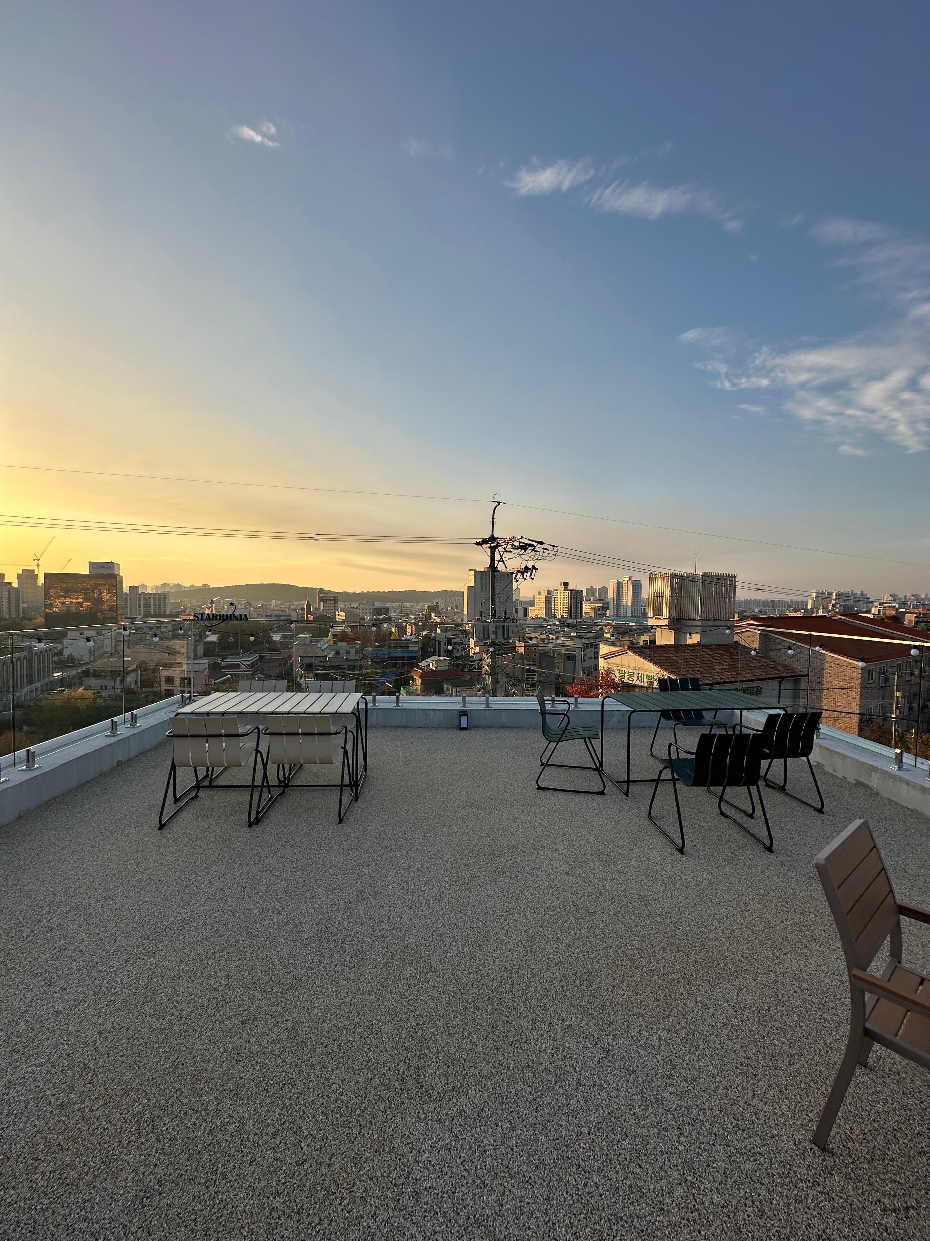 청주 수암골 스타로니아 카페는 한 건물로 3층으로 구성되어있는데요. 각 층마다 앉아서 차를 마실 수 있는 공간이 있습니다. 3층은 루프탑이 있는 옥상이었습니다. 특히 일몰 시간에 올라가면 언덕 위에 있는 수암골을 좀 더 높은 위치에서 일몰을 감상할 수 있습니다. 수암골 전망대는 가보지 못했지만 굳이 수암골 전망대 가지 않더라도 스타로니아 카페 루프탑을 이용할 수 있습니다. 루프탑이 아니더라도 2층만 하더라도 테라스가 있어서 전망을 즐길 수 있었습니다.