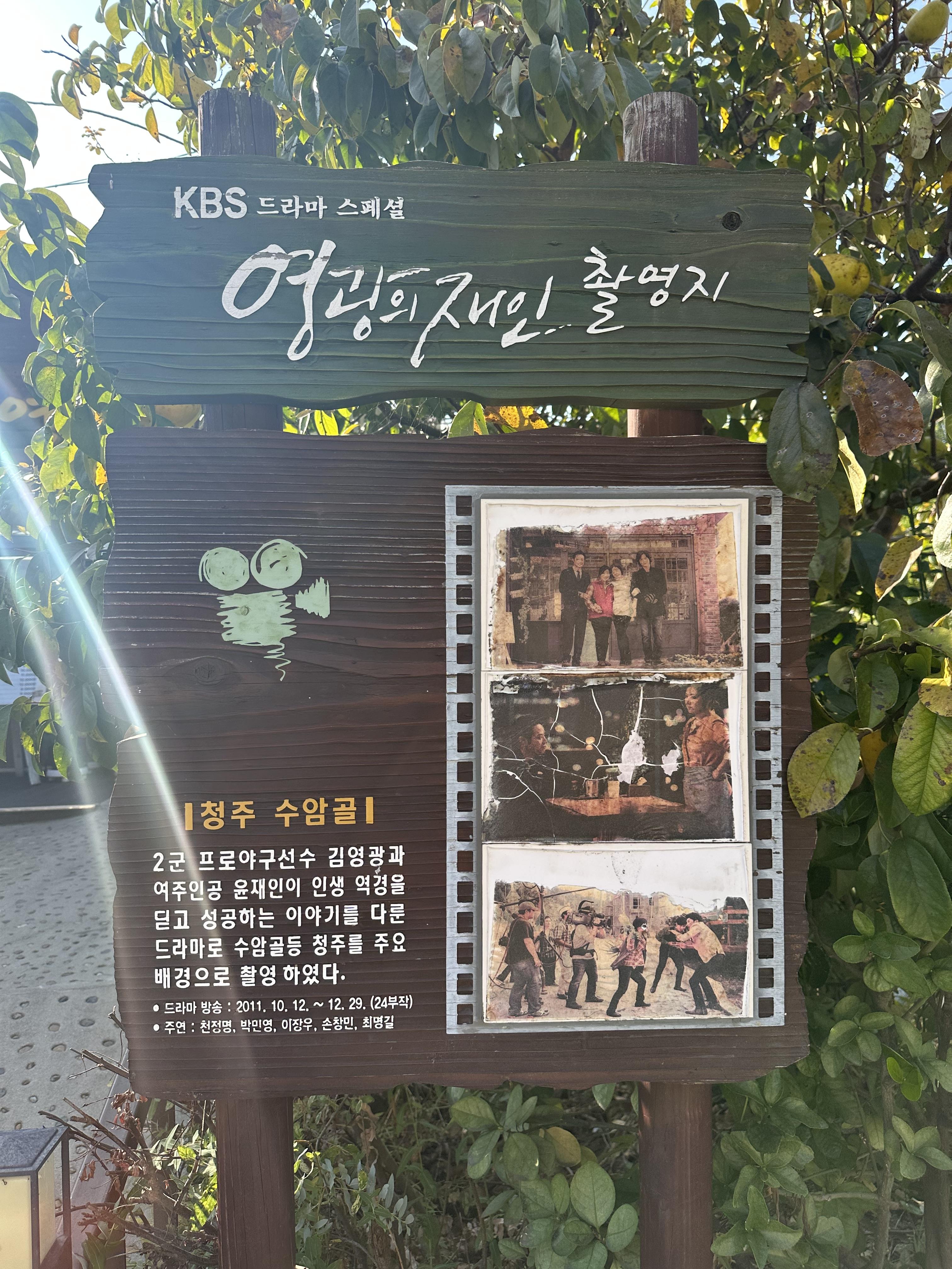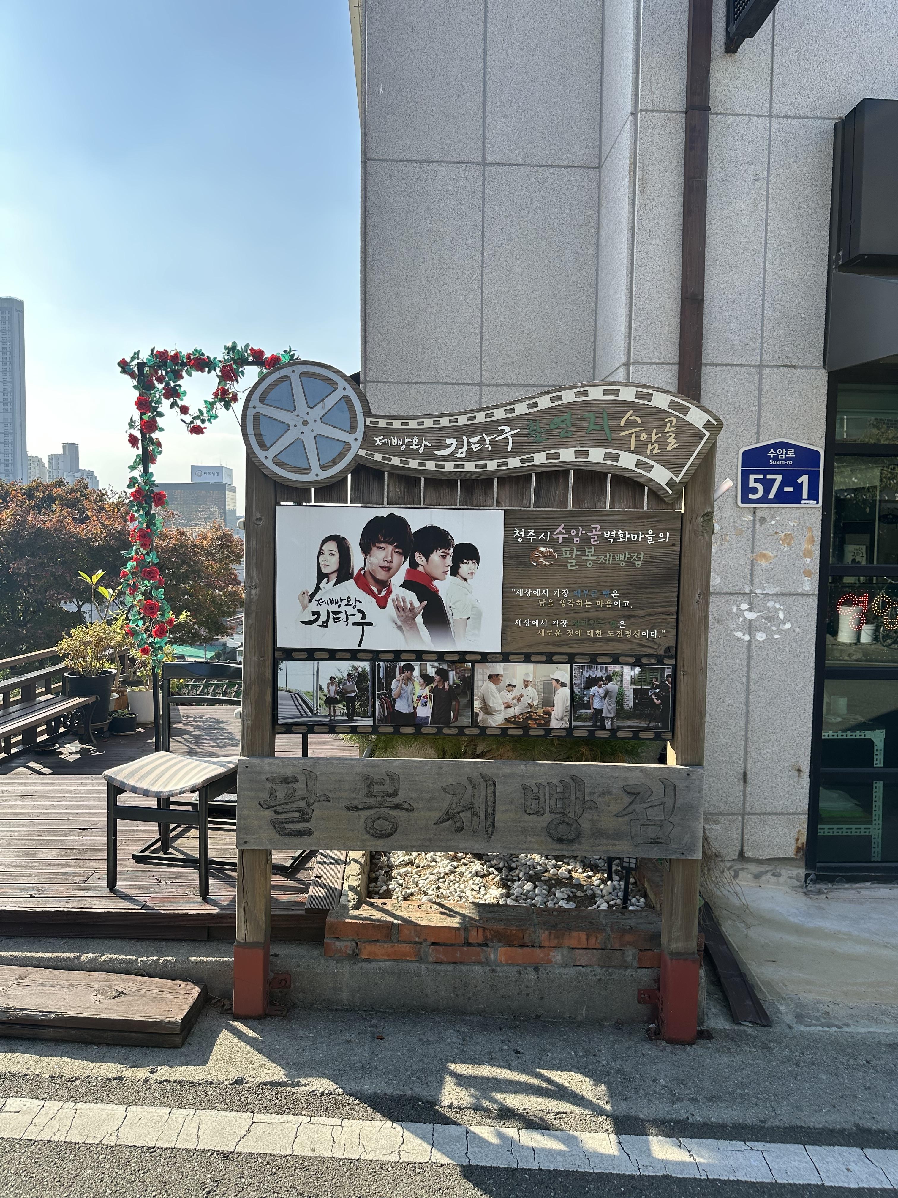 카페거리까지 구경하고 다시 팔봉제빵점으로 돌아가면서 찍은 사진입니다. 수암골 한쪽에는 드라마촬영지라는 분위기가 느껴졌는데요. 아마도 청주에서 촬영했던 드라마들을 보여주는 것 같았습니다.