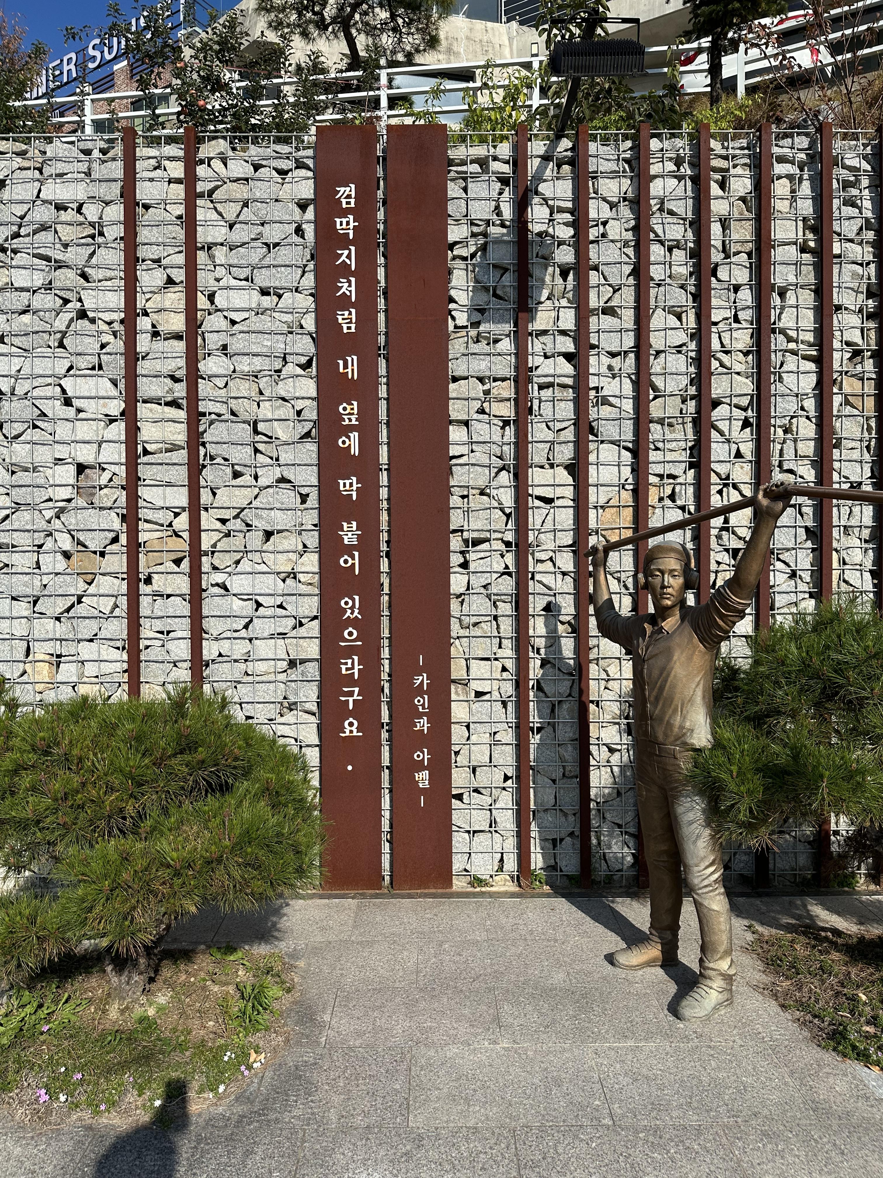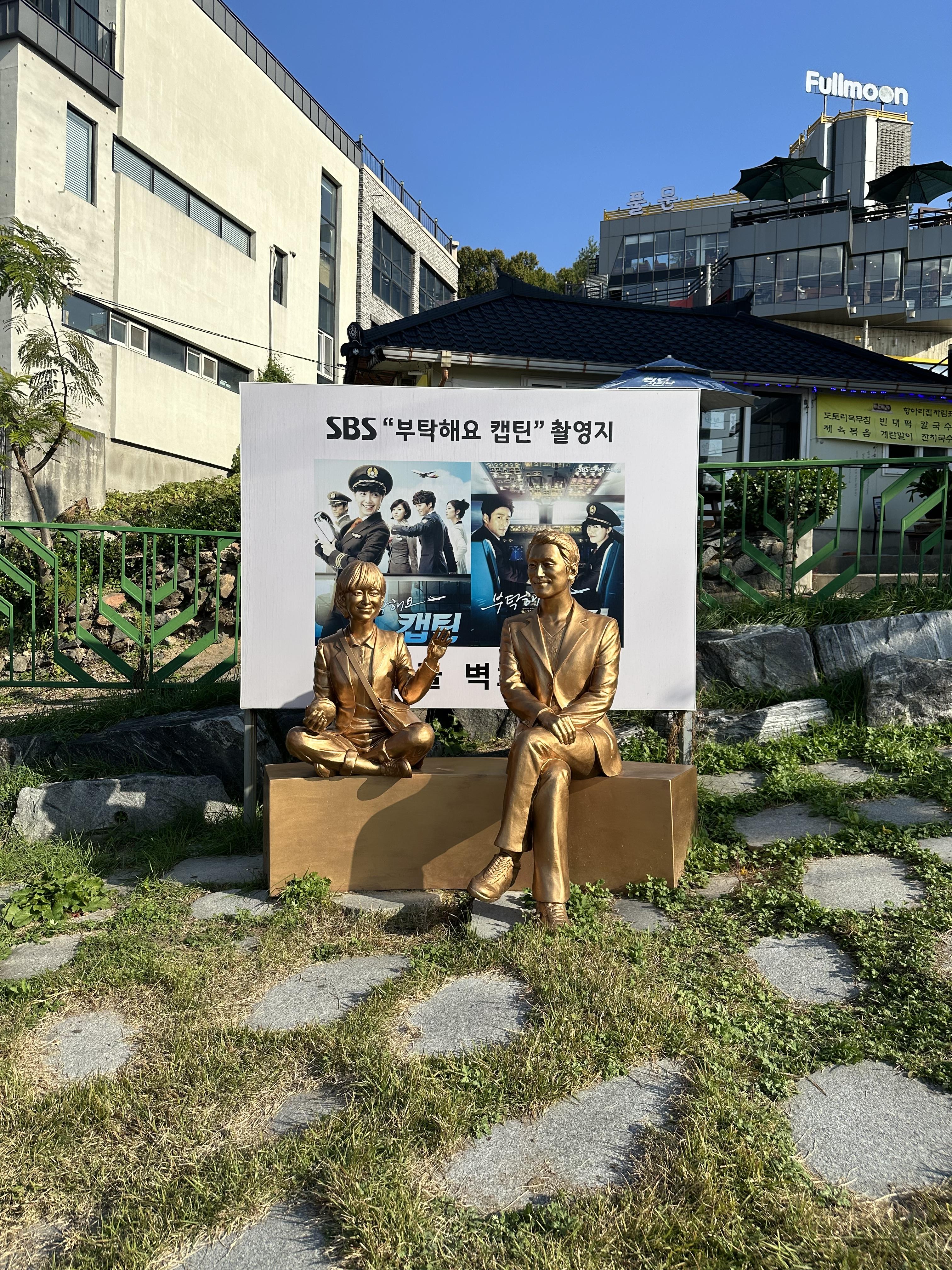 팔봉제빵점이 드라마속 건물과는 많이 달라져서 알아보기는 힘들지만, 반대편에 건물에는 극중 주인공인 탁구와 마준이, 미순이가 살았던 건물은 그대로 유지가 되고 있었습니다. 그리고 팔봉제빵점 옆에는 구마준과 신유경(배우 유진)이 키스하던 장면으로 나온 공원도 있었습니다. 드라마 촬영지에 맞게 조형물들도 설치되어있었습니다.