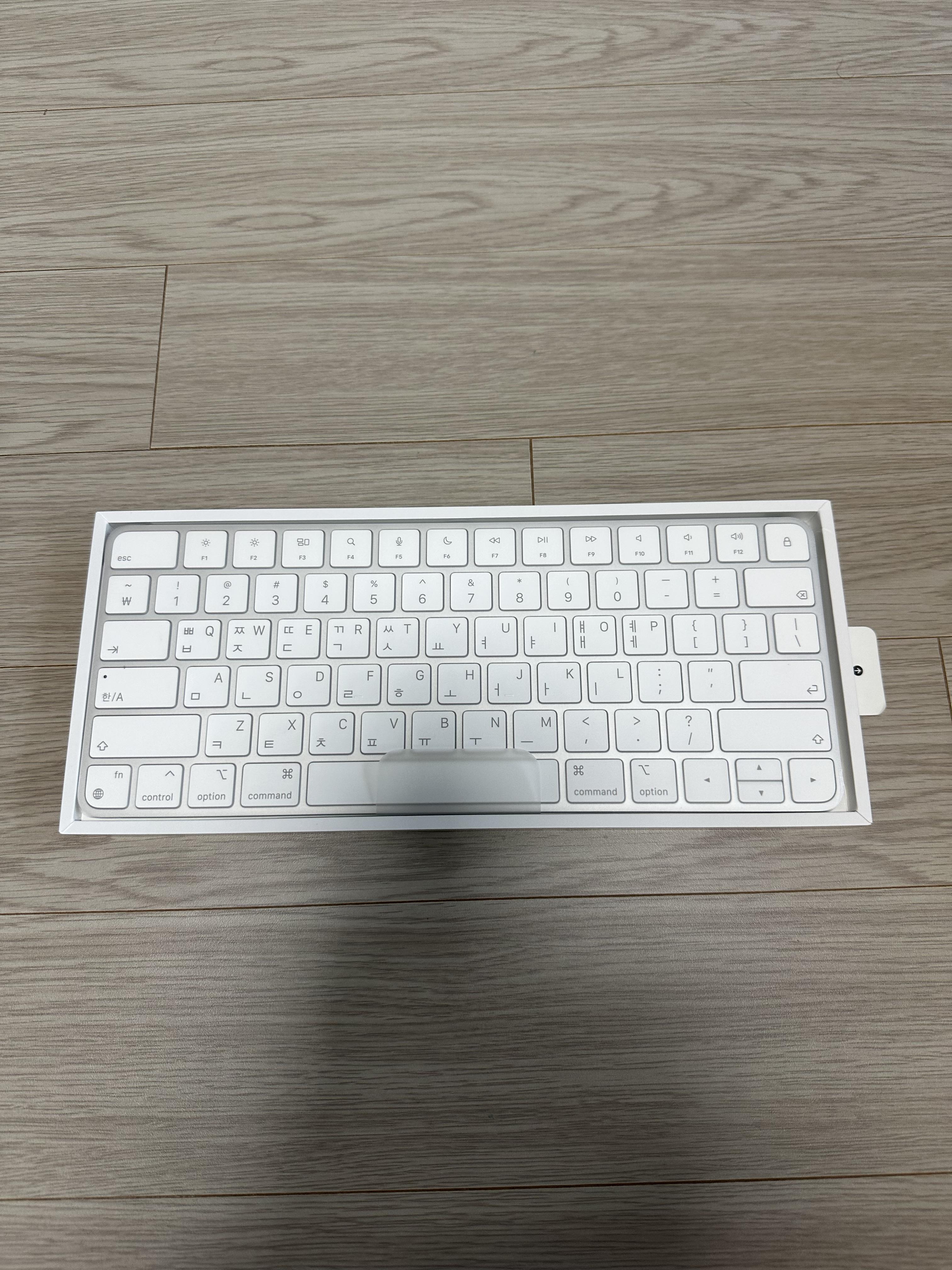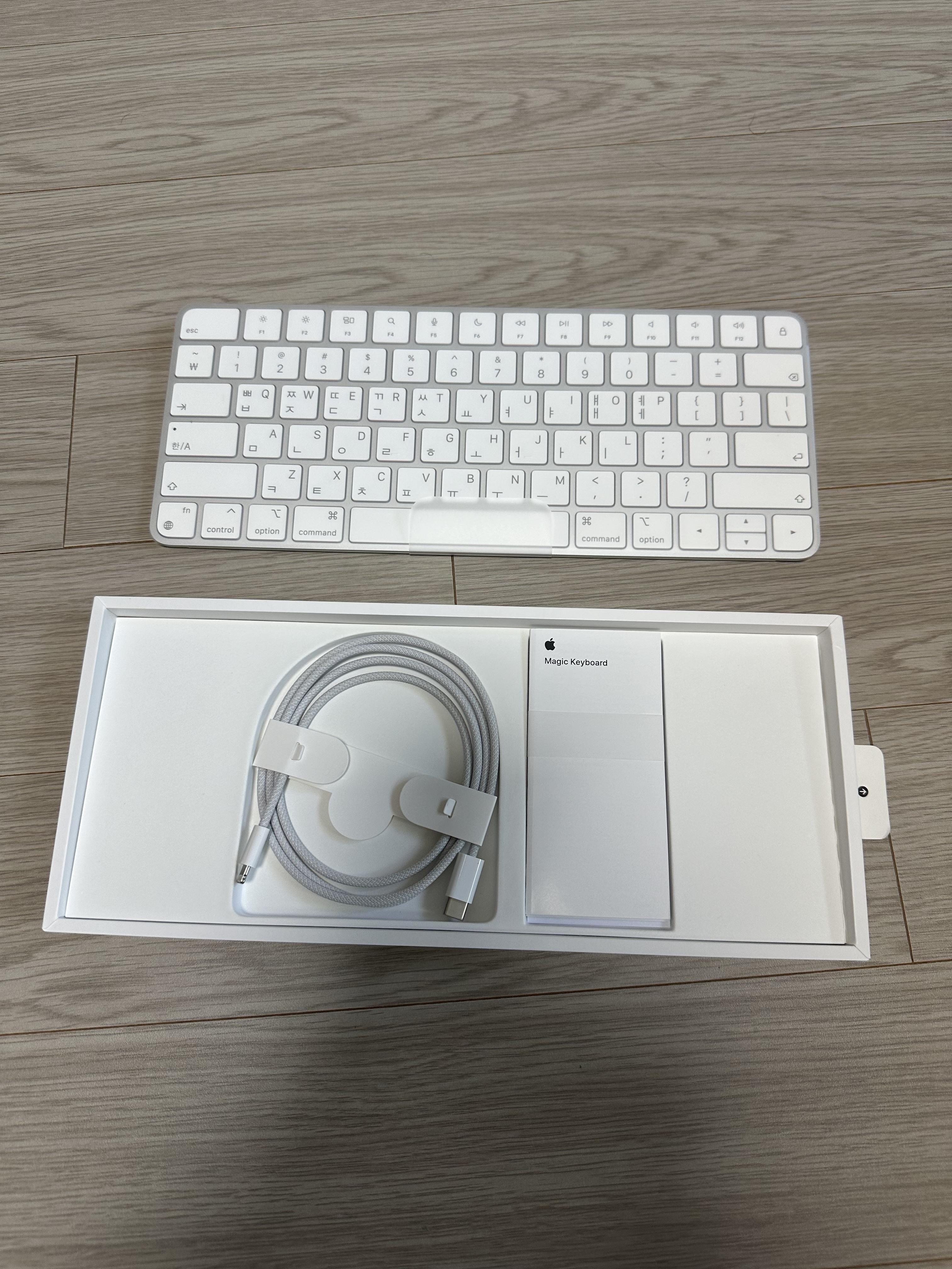 드디어 박스를 열었습니다. 하얗고 정말 가볍다는게 느껴지는데요. 아직 완전히 꺼내지 않았기에 가볍다, 얇다고는 정확하게 말할 수 없는 것같습니다. 방향키는 버튼이 작아서 사람에 따라서 누르기가 불편하다고 느낄 수도 있을 거 같아요. 장시간 이용한다면 매직키보드보다는 애플 제품 호환되는 키보드를 추천드려요.