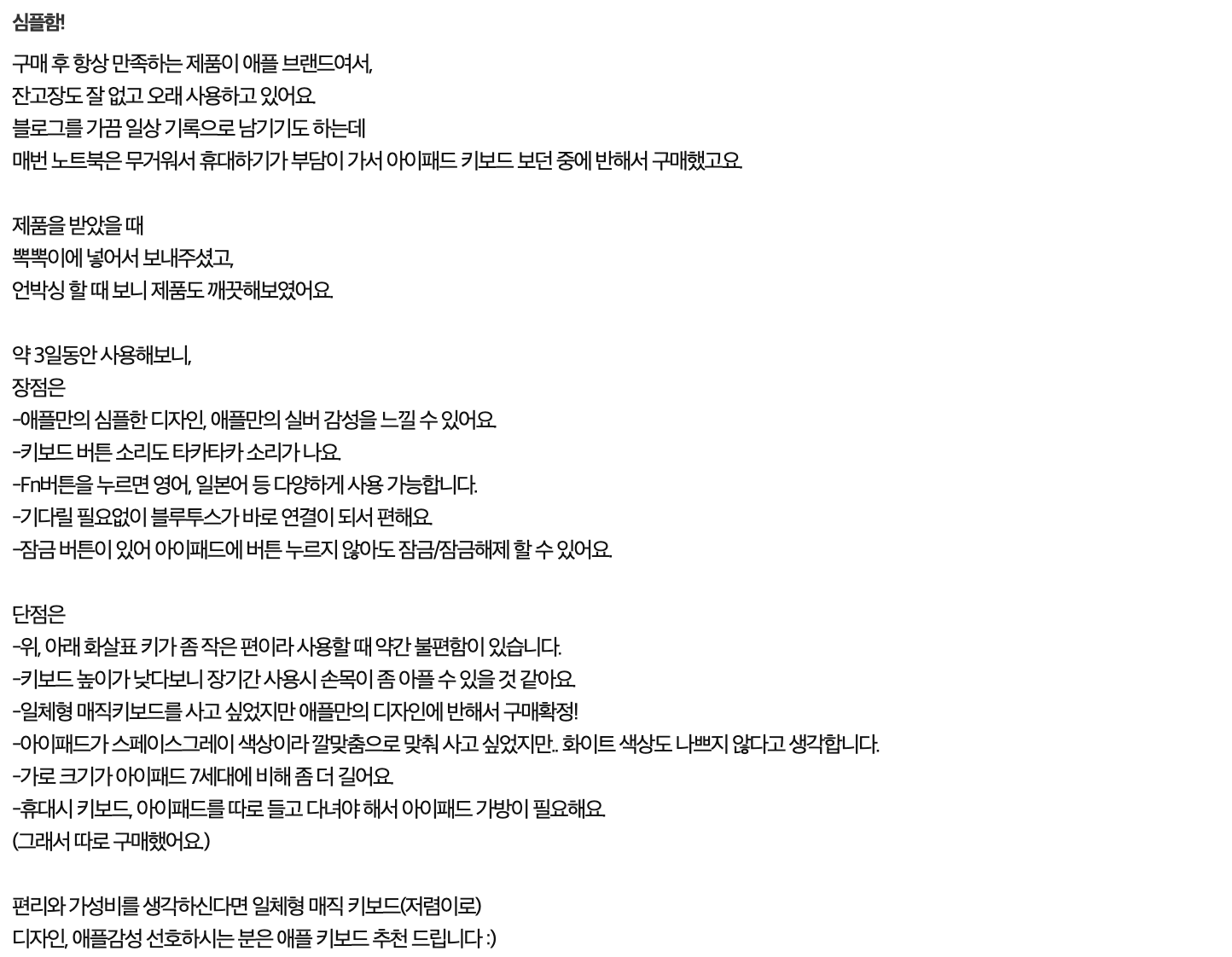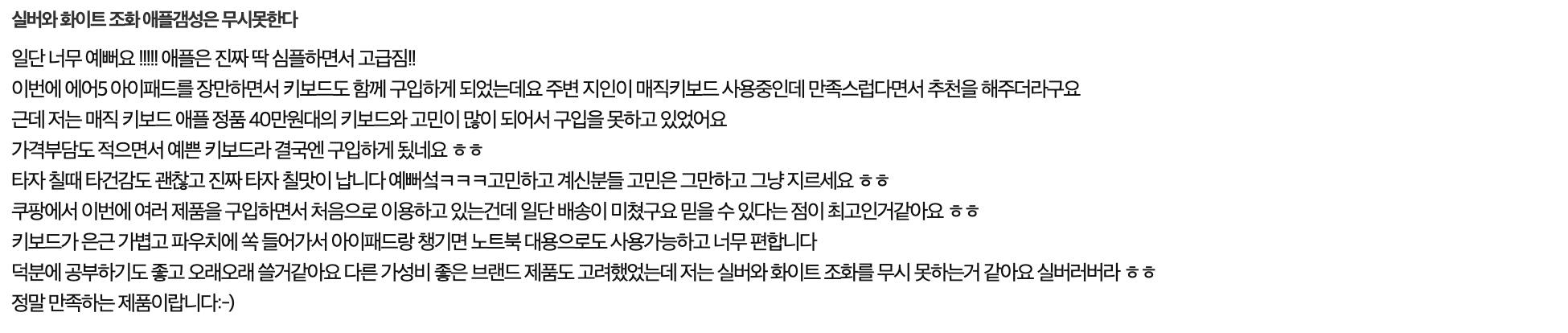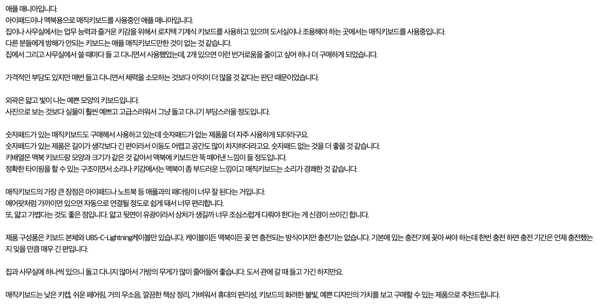 쿠팡에서 주문할 때 구매했던 사람들의 후기를 살펴보면서 구매를 하는데요. 사실 매직키보드는 애플 제품 쓰는 사람이 아니면 구매할 일이 거의 없습니다. 주문해서 사용했던 분들의 대부분은 가볍고 연결이 잘되고 그런 내용들이 많습니다.