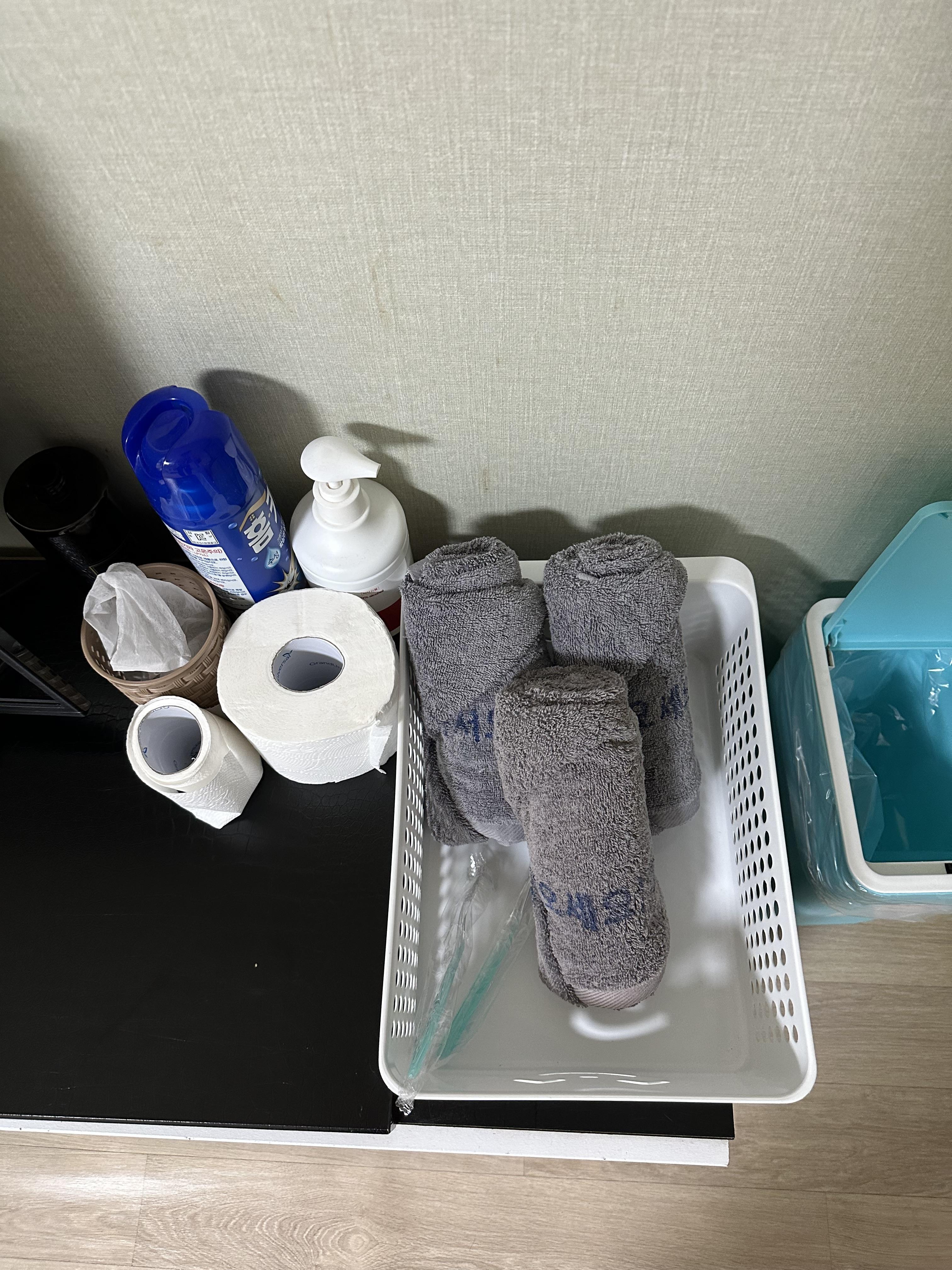 방은 하나이지만 이번에는 다른 공간도 알아보겠습니다. 기본적으로 티비와 인터넷 제공되었습니다. 수건도 부족하지 않고 충분히 제공되었습니다. 이불과 베개는 1-2명만 이용할 수 있는 객실이기 때문에 2개까지 제공이 되었습니다. 그 외 음식물 쓰레기통이 제공되어 음식먹고 남은건 체크아웃할 때 넣어두시면 되었습니다. 아무래도 바다이고 시골이기 때문에 여름에는 벌레도 있을 수 있기때문에 뿌리는 벌레약도 있었습니다.