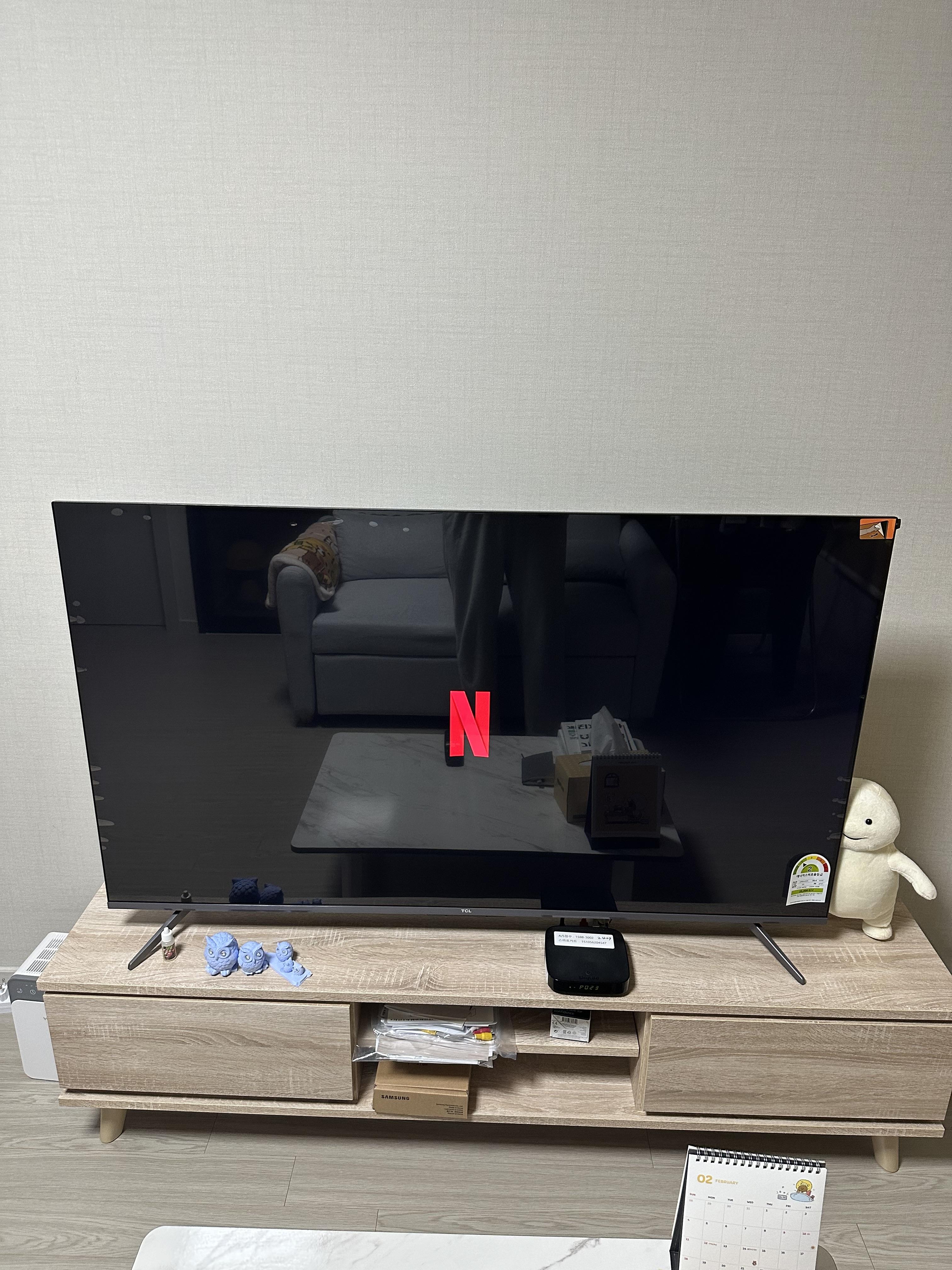 방문설치 방식이기 때문에 티비 상자와 비닐은 기사님이 직접 정리해서 가져가기 때문에 구매자는 신경 안쓰셔도 됩니다. 혼자서 본다면 충분한 크기입니다. 제가 사는 오피스텔은 그렇게 넓지 않다보니 55인치만으로도 충분했습니다.