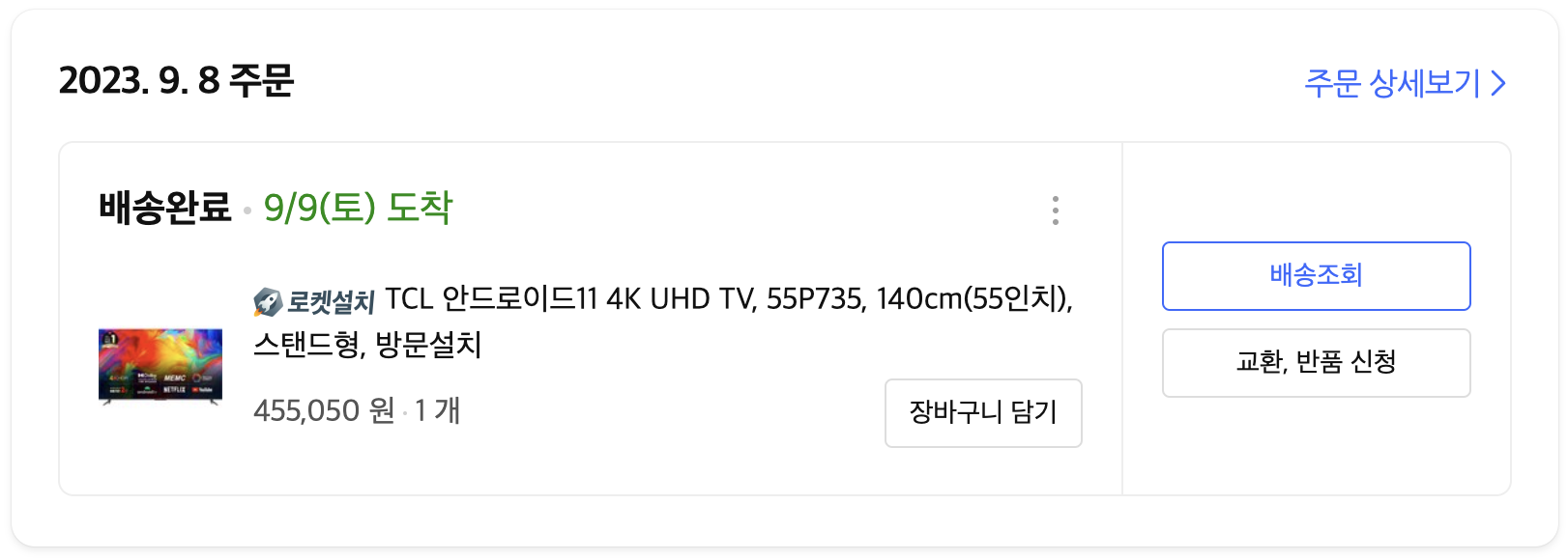 저는 스마트 티비의 경우에도 아는지인과 오피스텔 수분양자들의 도움을 받아 가성비가 뛰어난 제품을 구매하기로 했습니다. 바로 TCL 제조사에서 판매하는 스마트 티비를 구매하게 되었습니다. 쿠팡의 편리함에 빠져서 스마트 티비 역시 쿠팡으로 주문을 했습니다. 로켓배송이기 때문에 주문 후 다음날에 받아 볼 수 있었습니다.