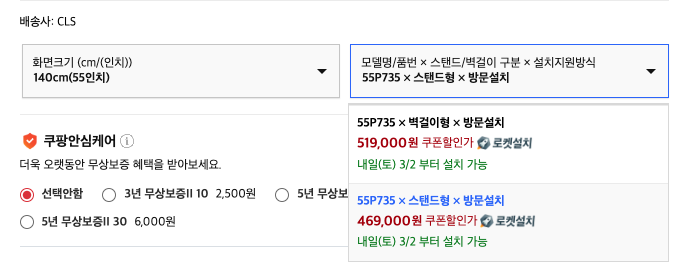 TCL 스마트 티비는 아무래도 다른 제품들과는 다르게 현관문앞에는 둘수 없구요. 그래서 로켓배송이 아니라 로켓 설치에요.만약 두고 간다고 해도 직접 들고가서 설치하는것도 번거롭겠죠? 로켓 설치도 로켓 배송과 마찬가지로 주문 시 다음날 바로 오셔서 설치해주고 가고 있습니다.