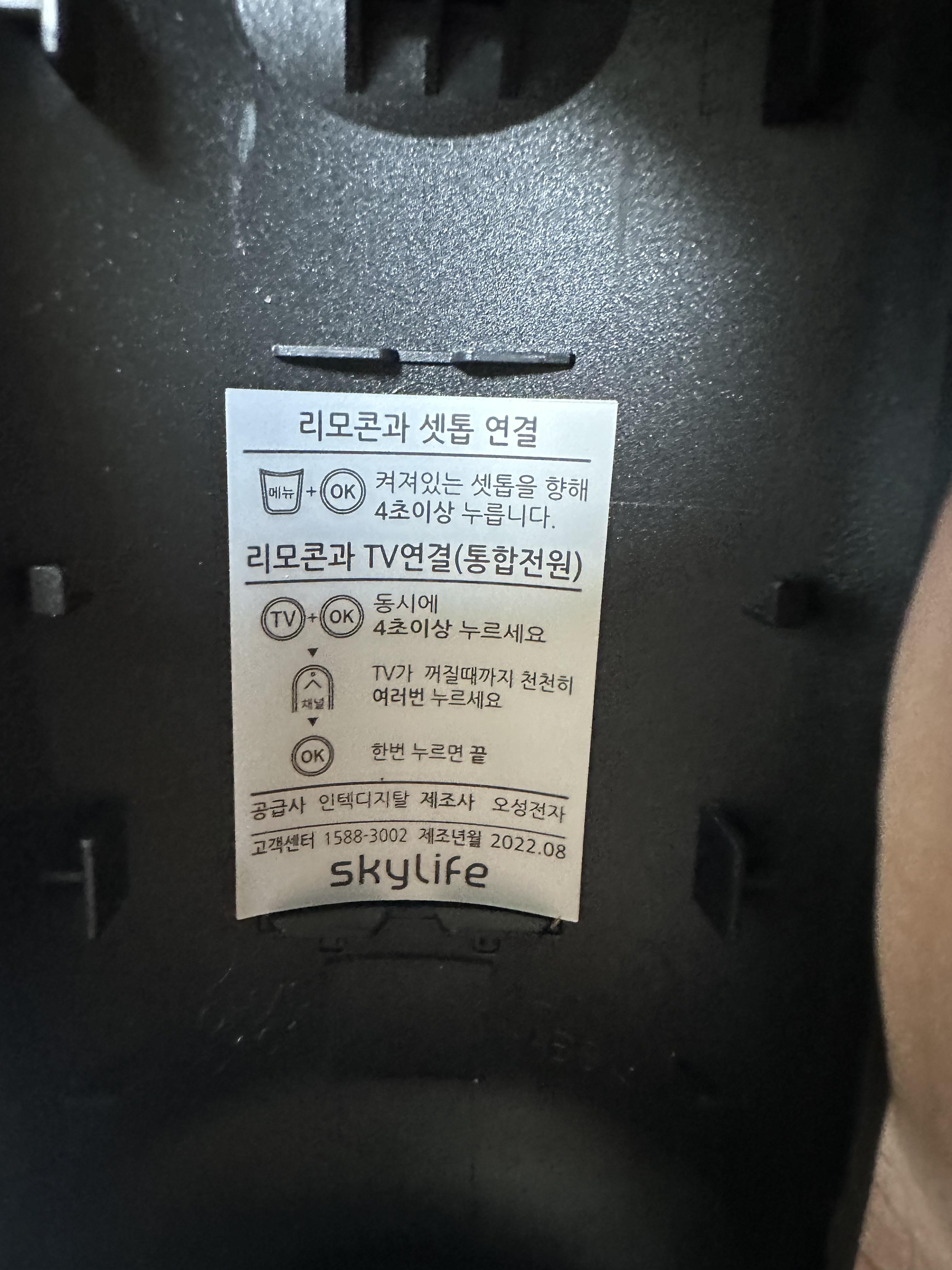 - 혹은 셋톱박스 리모컨 뒤편에 보면 건전지 넣는 부분이 있는데요. 그부분 안쪽에 보면 설명서가 있어요!
