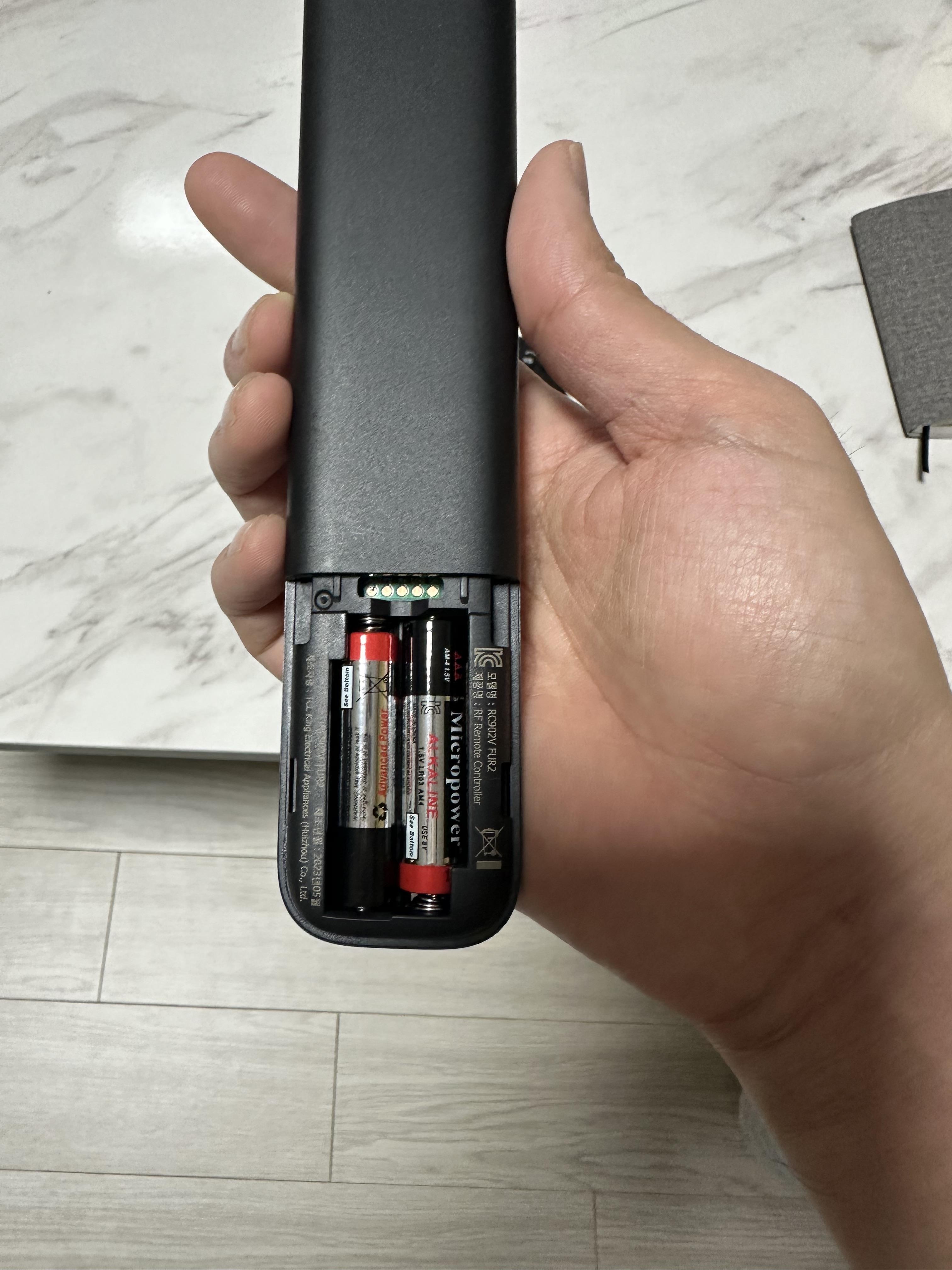좌측에 있는 리모컨이 TCL 스마트 티비를 사면서 받은 리모컨입니다. 스마트 티비 리모컨의 경우 AAA 건전지 2개가 들어가고 있습니다. 셋톱박스 리모컨의 경우 AA 건전지 2개가 들어가고 있습니다.