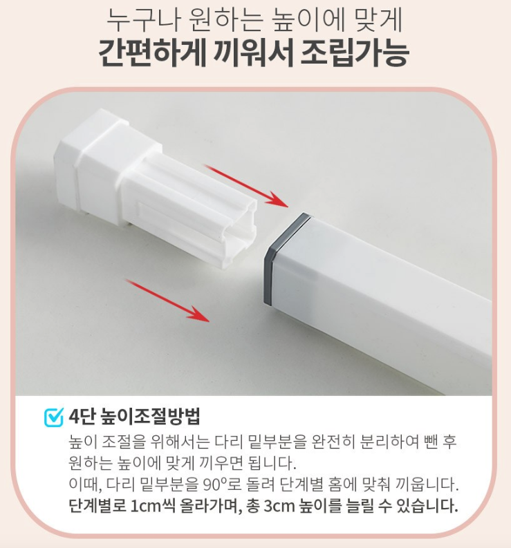- 높이 조절을 위해서는 다리 밑부분을 완전히 분리하여 빼내 후 원하는 높이에 맞게 끼우면 되요