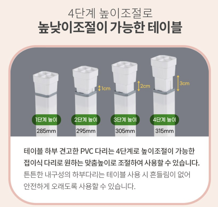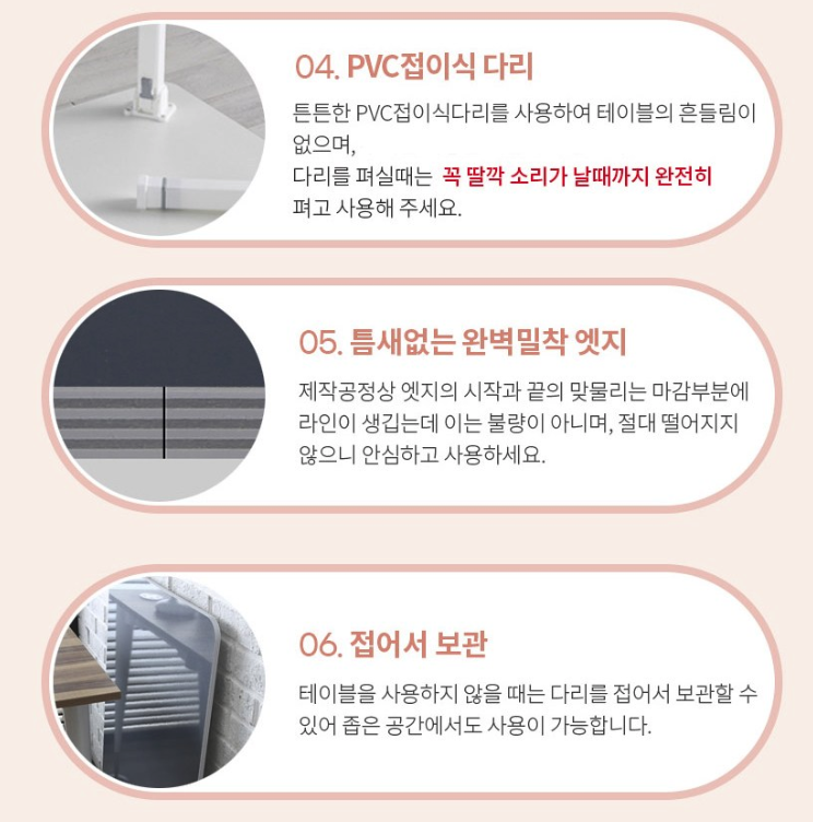 - 튼튼한 PVC 접이식 다리를 사용하여 테이블의 흔들림이 없으며 다리를 펴실 때는 꼭 딸깍 소리가 날 때까지 완전히 펴고 사용해주세요!