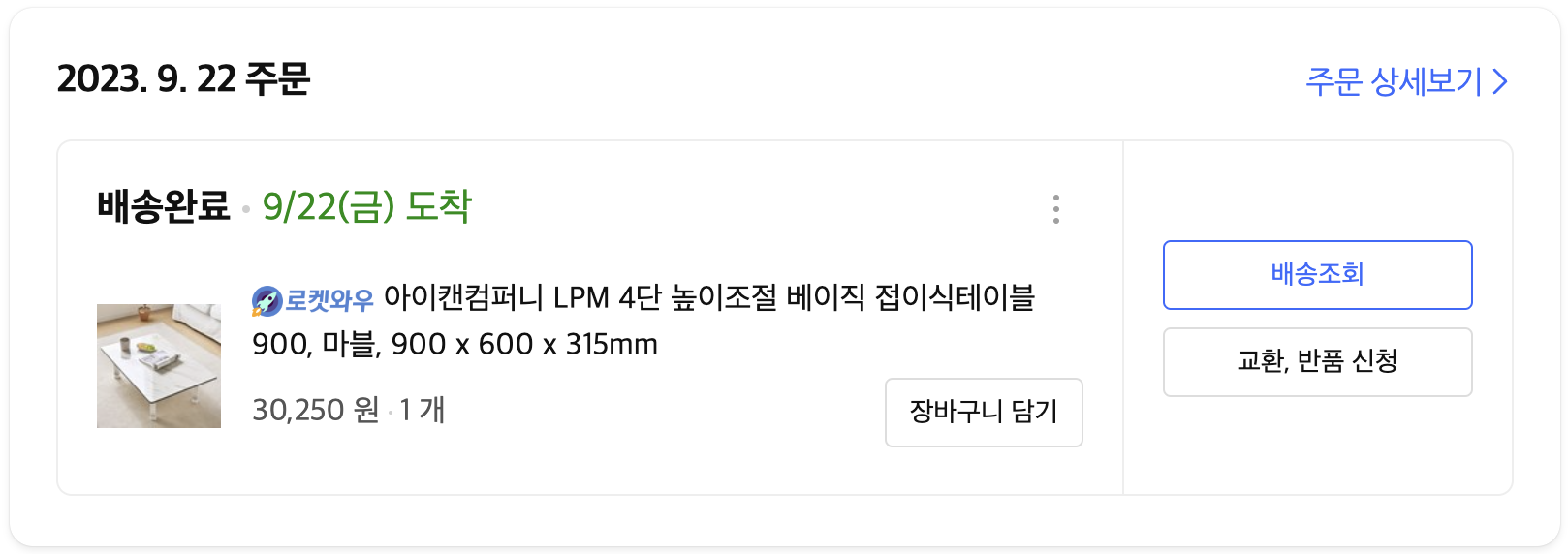 배송으로부터 제품을 받아서 포장지 제거하고 사용하는데까지 10분도, 아니 5분도 걸리지 않을만큼 빨랐습니다. 사실 테이블 하나 펼치고 접는데 5분씩 걸린다면 문제가 있겠죠