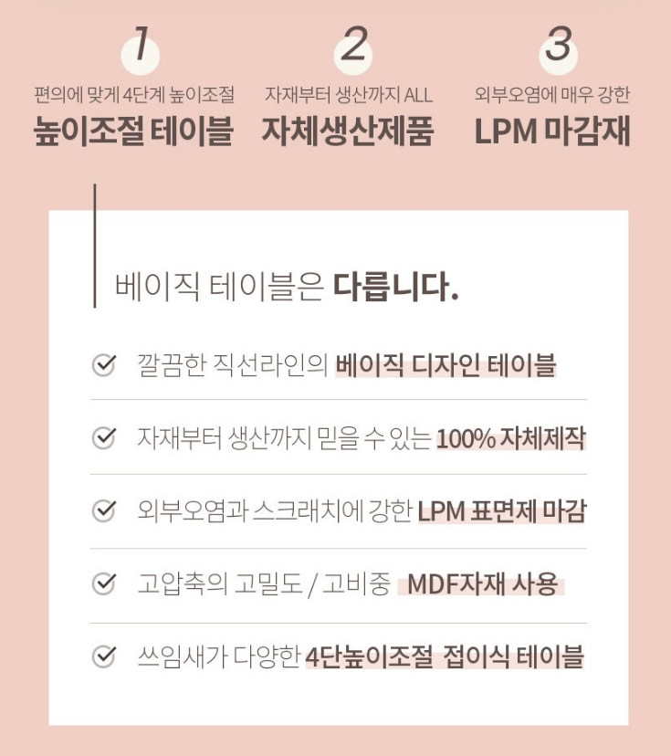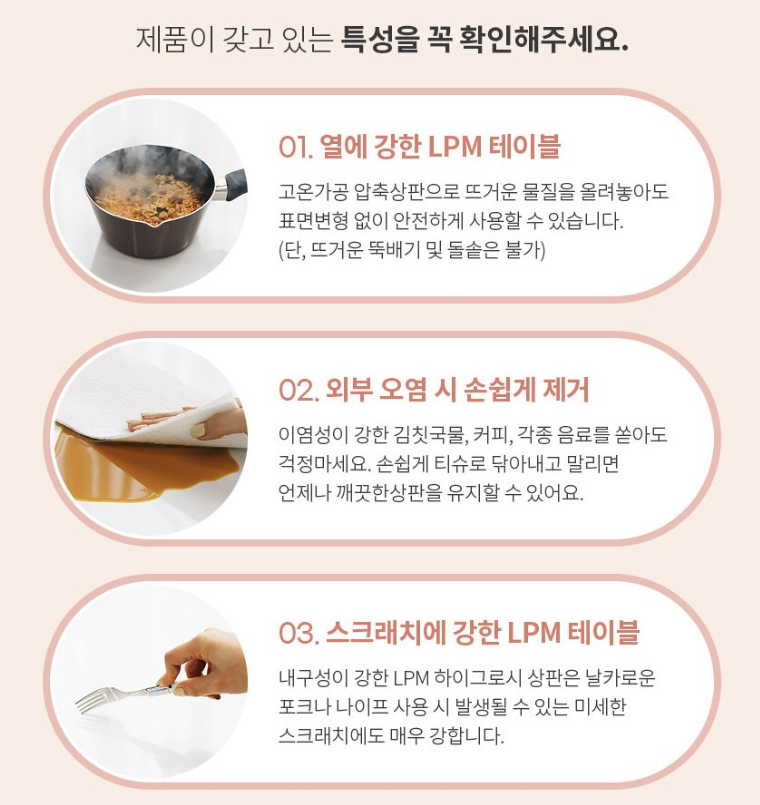 - 열에 강한 LPM 테이블 : 고온가공 압축 상판으로 뜨거운 물질을 올려놓아도 표면변형 없이도 안전하게 사용 가능! (단, 뜨거운 뚝배기 미치 돌솥은 사용 불가)