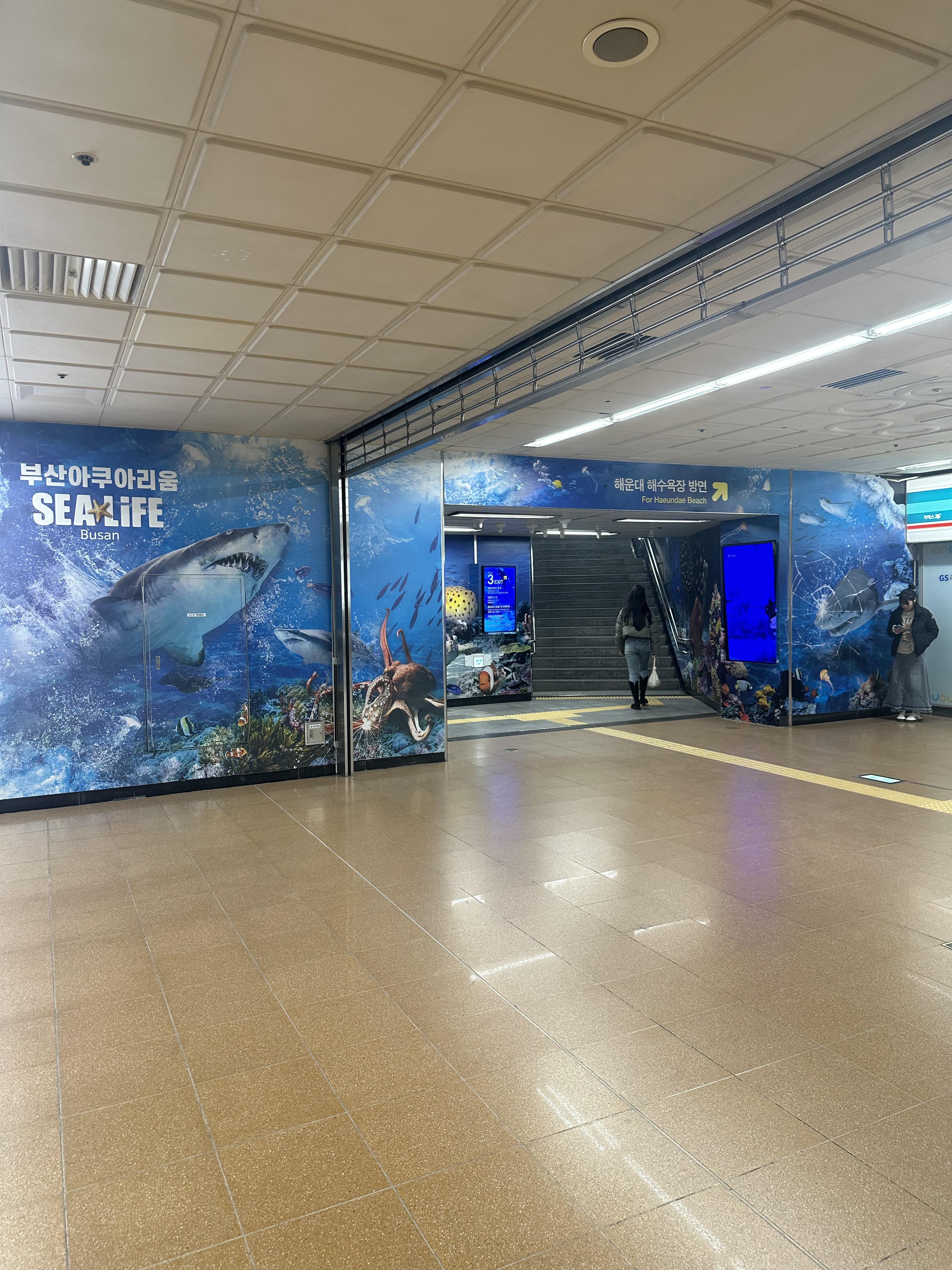 부산역에서 해운대역까지는 한번에 가는 지하철은 없습니다. 부산지하철 1호선을 타고 서면역에서 장산방향으로 가는 부산지하철 2호선을 환승하여 해운대역에서 하차하시면 됩니다. 시간은 대략 50분정도 걸립니다. 대도시인 만큼 지하철은 출퇴근 기준으로 5-10분 간격으로 자주 다니고 있습니다. 해운대역은 해변이라는 이미지와 잘 어울리게 역내에 상어 사진이 보이면서 바다의 느낌이 날 수 있도록 구성되어있었습니다.