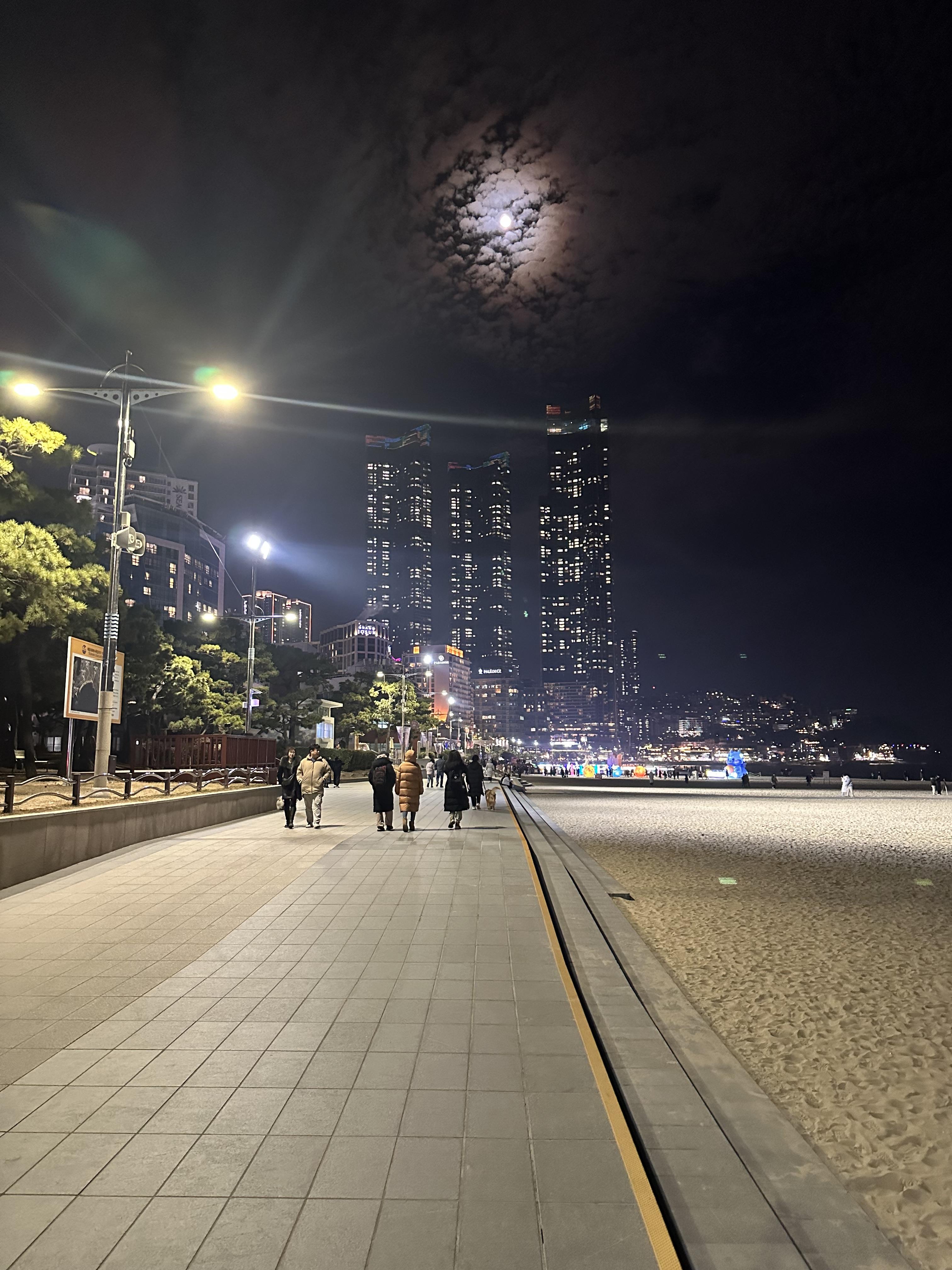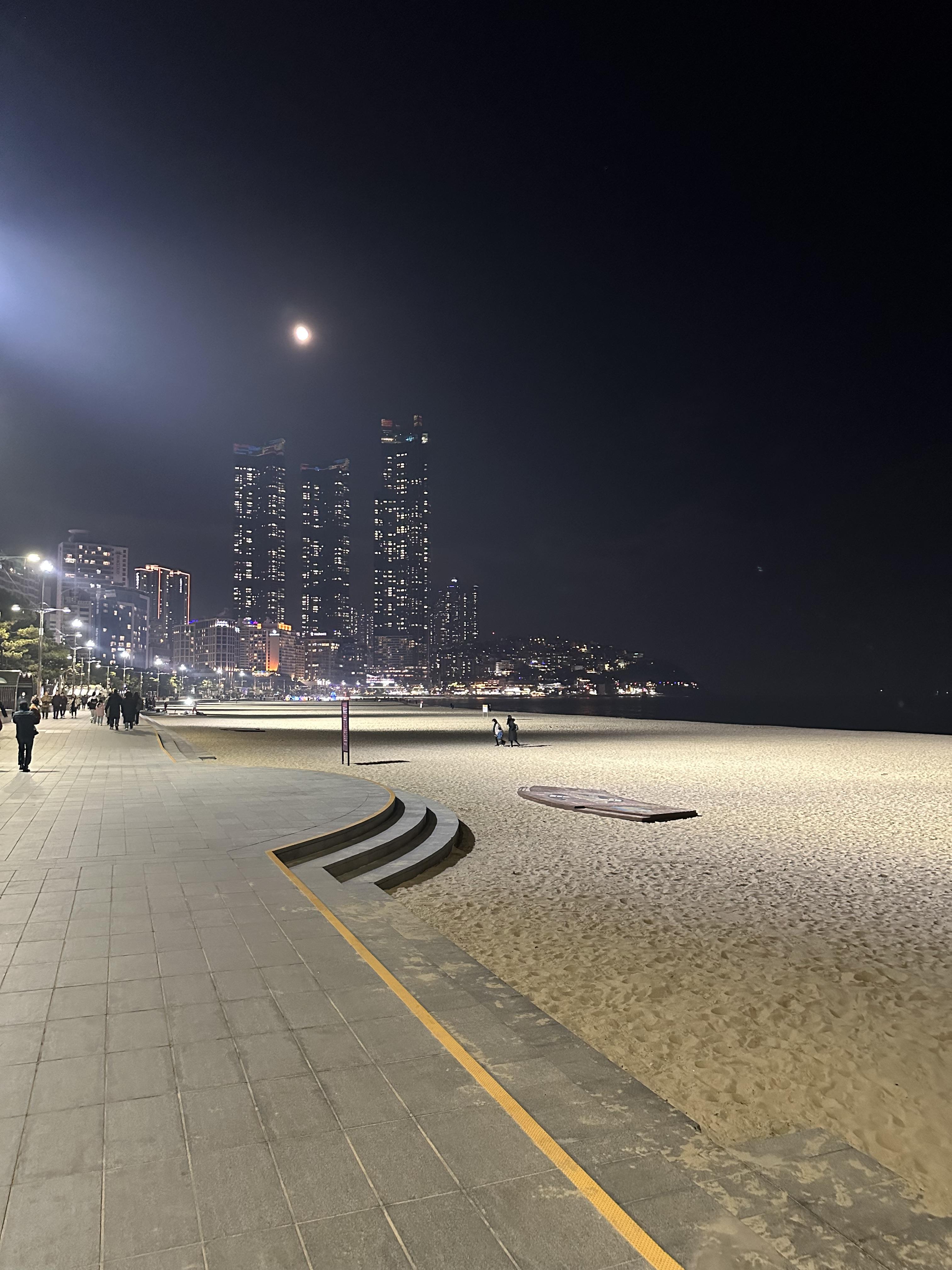 저는 해운대 밤바다를 즐기기 이전에 해운대 59년전통 국밥집에서 맛있게 먹고 미리 예약한 에어비앤비에 짐을 풀고 해운대 바다로 나오게 되었습니다. 해운대 밤바다와 여수 밤바다는 느낌이 너무 달랐습니다. 여수는 부산 해운대와는 다르게 높은 건물이 많이 없었습니다. 그리고 도시 전체가 어둡고 조용했습니다. 혼자서 즐기에는 좋아보였습니다. 그런데 해운대는 높은 고층 건물들이 많았습니다. 관광객이 여수보다는 훨씬 많았습니다. 그러나 해운대해수욕장도 입구 초반에 사람이 몰려있구, 그 외에는 시간과 상황에 따라 사람들이 붐비고 있었습니다. 사람마다 다르지만 성향에 따라서 조용한 바다가 좋다면 여수가, 상관없다면 해운대나 여수 어디든 상관없을 것 같습니다.