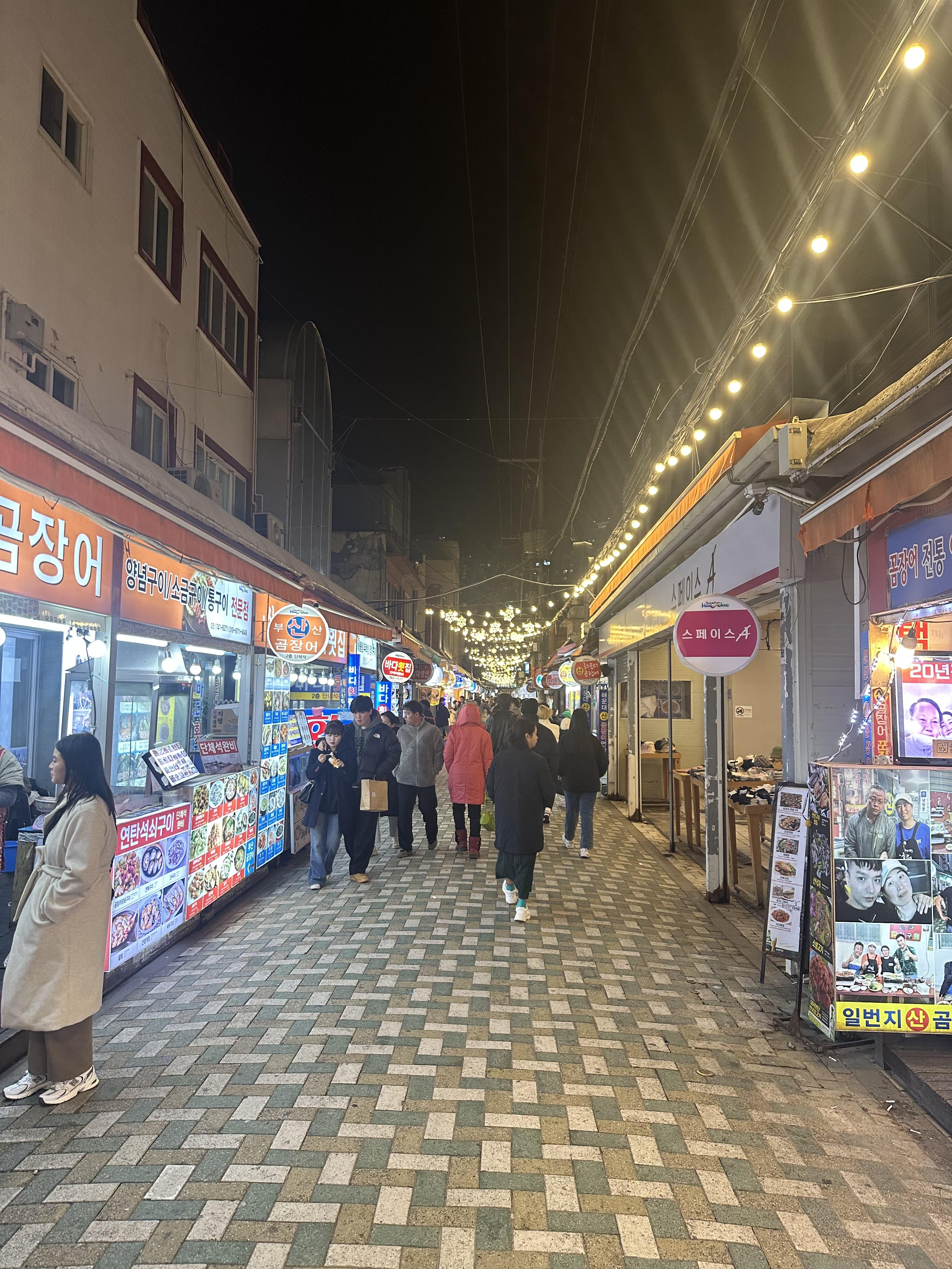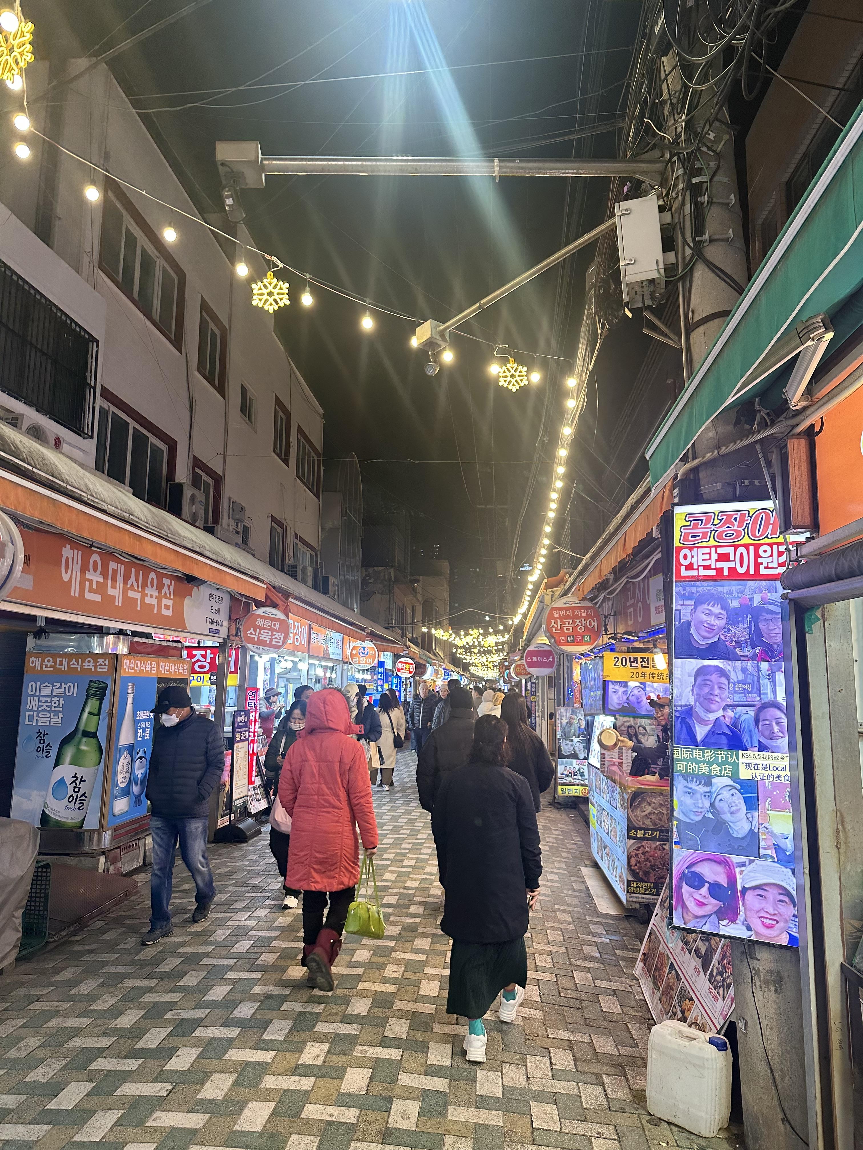 해운대 동백섬을 한바퀴 돌아보고 조선호텔을 지나 다시 해운대 해변을 걸으며 해운대 광장로로 오게되었습니다. 그리고 에어비앤비 들어가기전에 야식을 먹기 위해 해운대 시장에 왔습니다. 해운대 시장에는 다양한 회와 곰장어, 꼼장어, 족발, 라면 김밥 분식, 국밥 등 다양한 것들이 팔고 있었습니다. 아무래도 바다에 왔으면 회를 먹어야겠죠? 저는 어느 회집에서 회를 구매해서 에어비앤비로 이동하게 되었습니다.