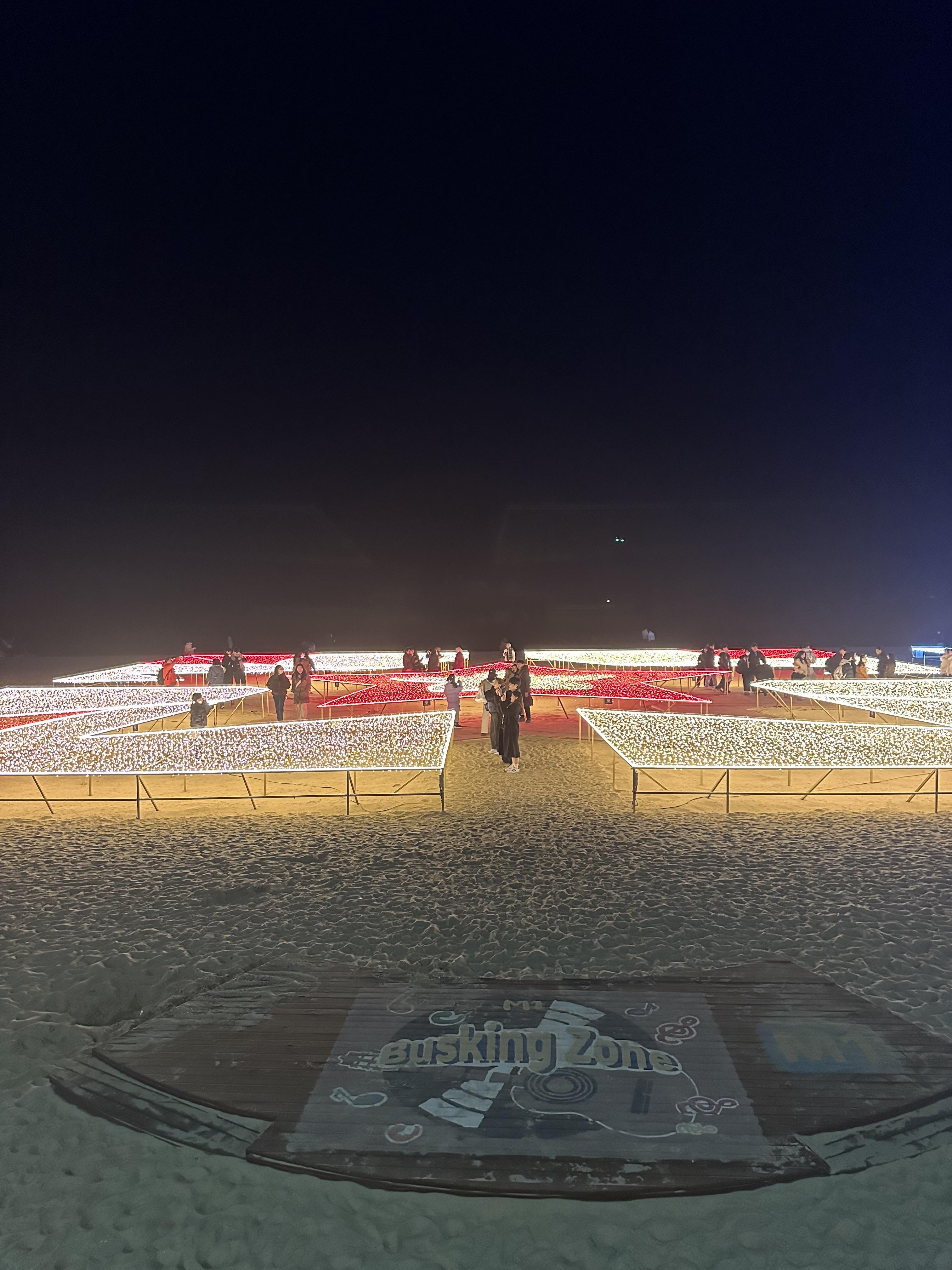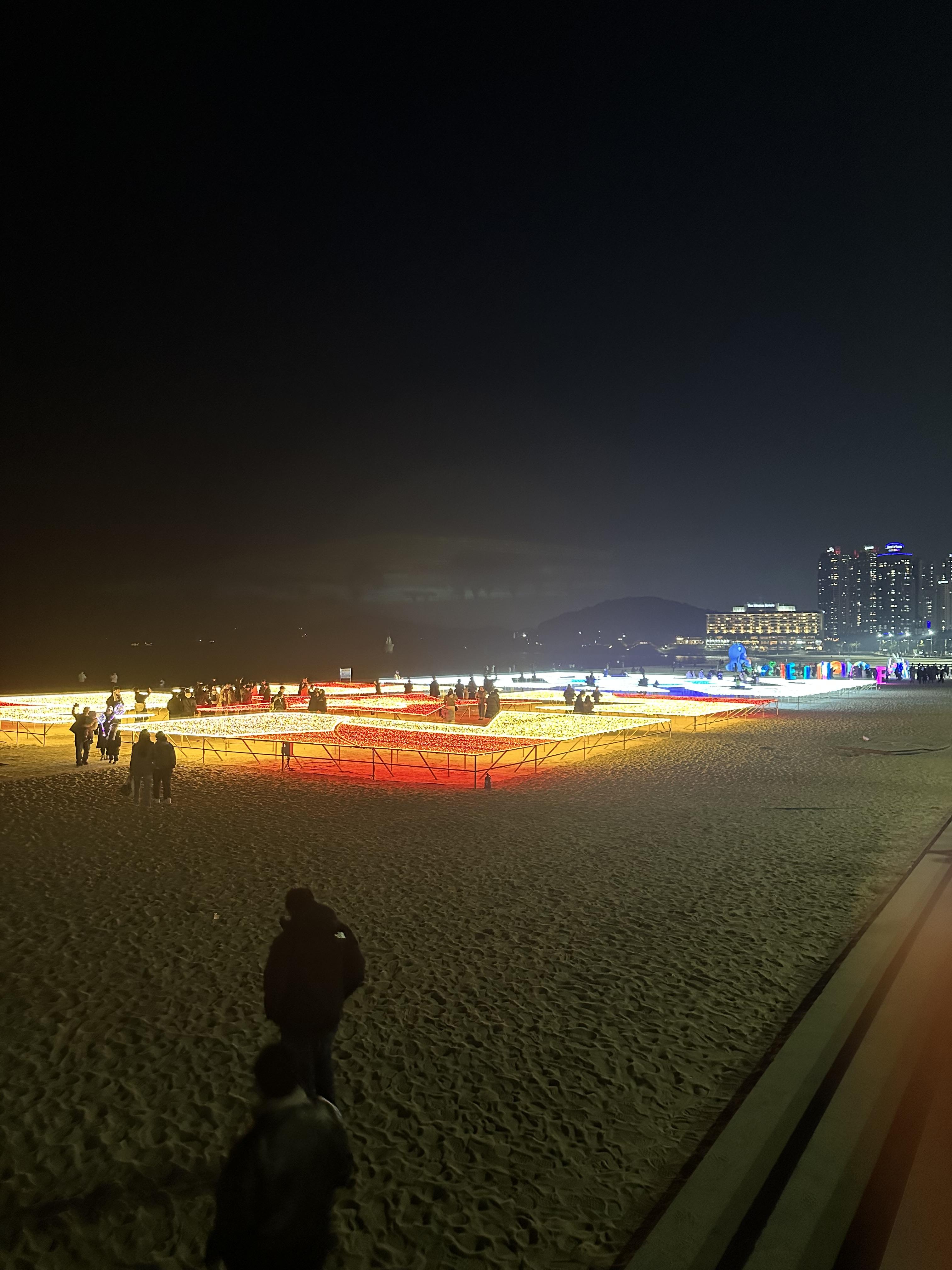 해운대 빛축제 조형물을 지나게 되면 사람이 붐비지 않는 어두운 바다를 볼 수 있습니다. 어디를 가던지 항상 사람이 몰리는 곳만 몰리는 것을 볼 수있는데요. 해운대도 마찬가지였습니다. 해운대 광장로에서 해운대 해수욕장으로 가는 신호등쪽이 가장 관광객이 가장 많았습니다.