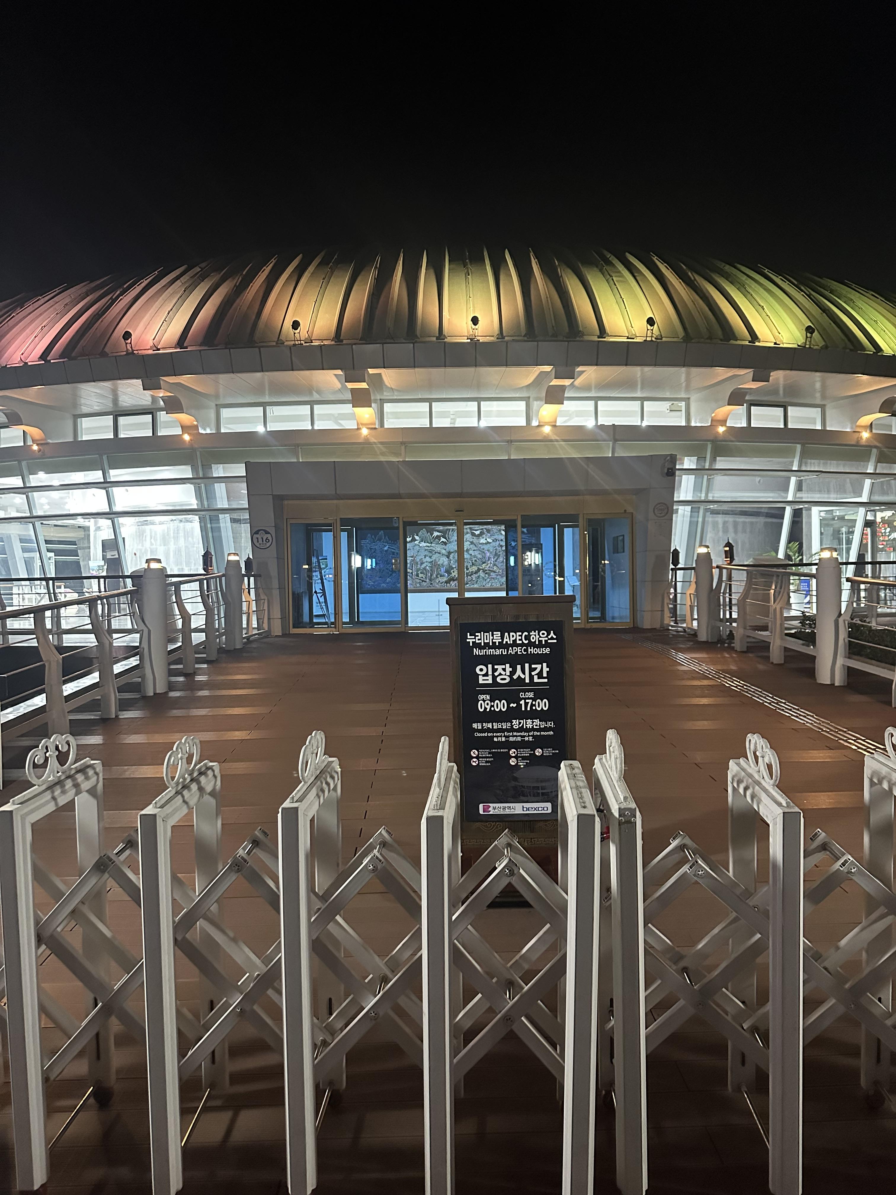 부산에서 정상회담을 개최했던 누리마루 APEC 하우스입니다. 야간에는 문이 닫히기 때문에 이렇게 아름다운 빛만 보고 가는데요. 누리마루 APEC 하우스에 대해서는 다른 후기에서 다시 설명드리겠습니다. 원래는 야간에 아름다운 빛을 보고 가려고 했으나 해운대 바다열차를 타는데까지 시간이 남더라구요. 그래서 다음날 APEC하우스까지 보게 되었습니다.