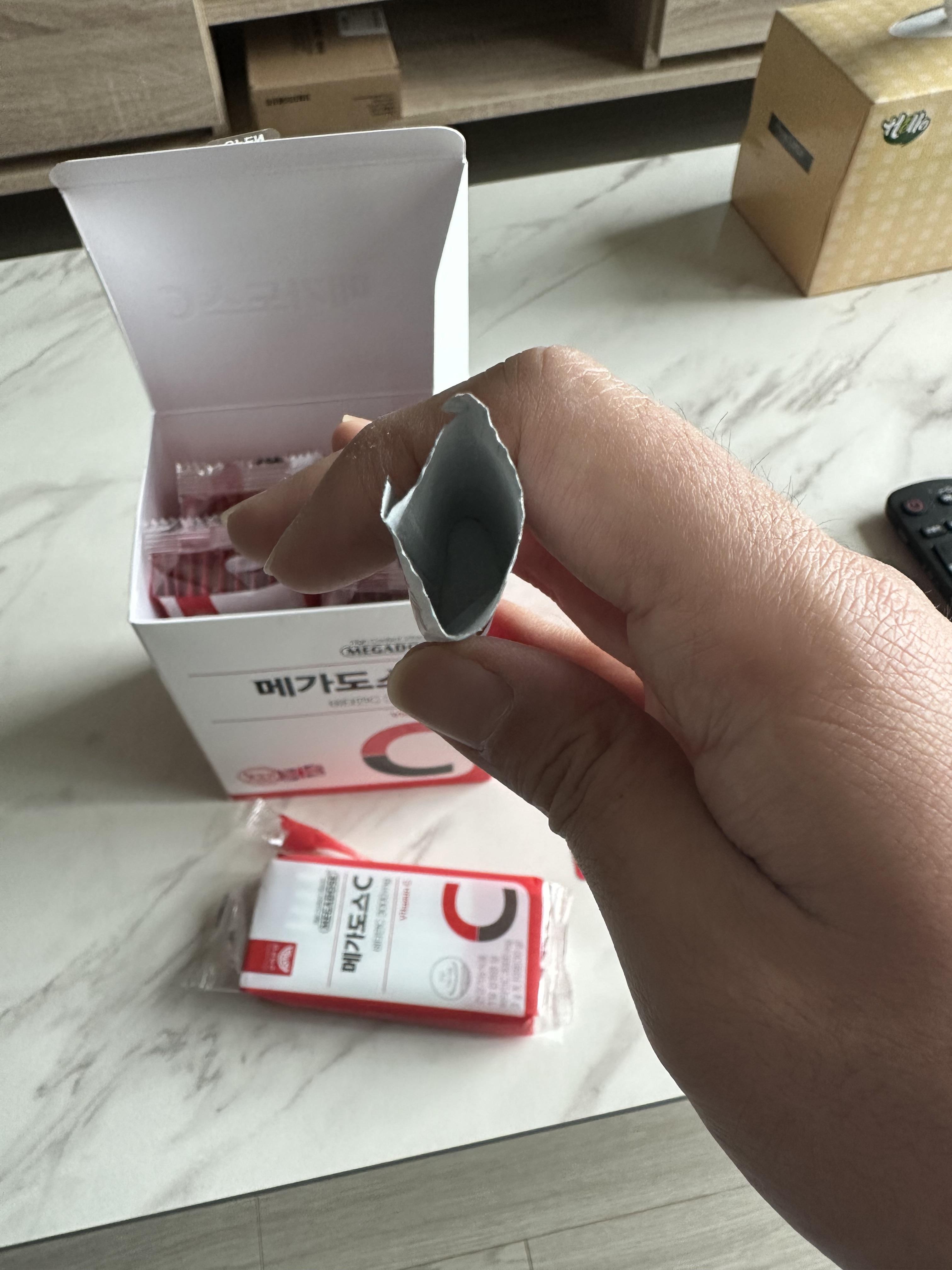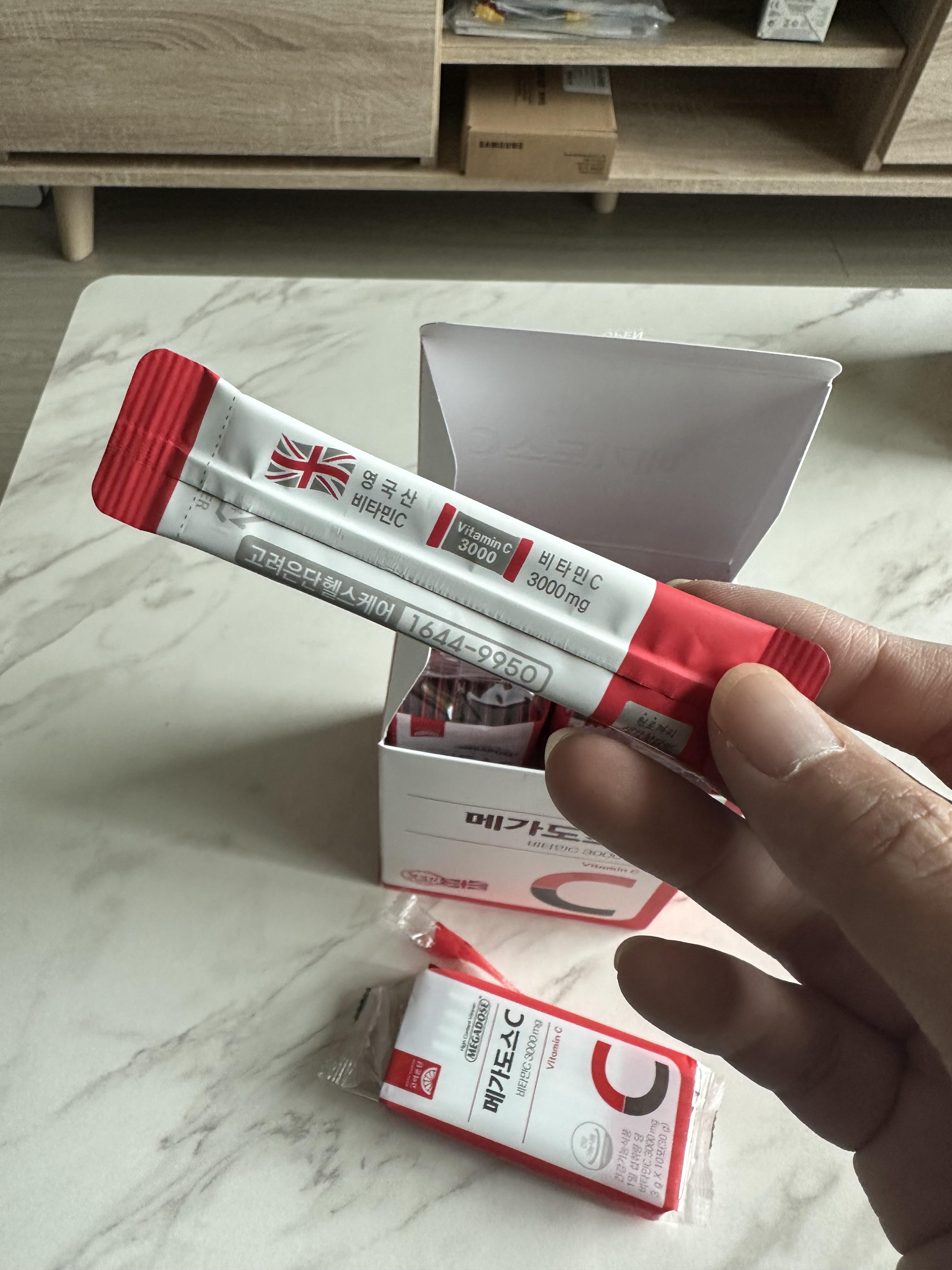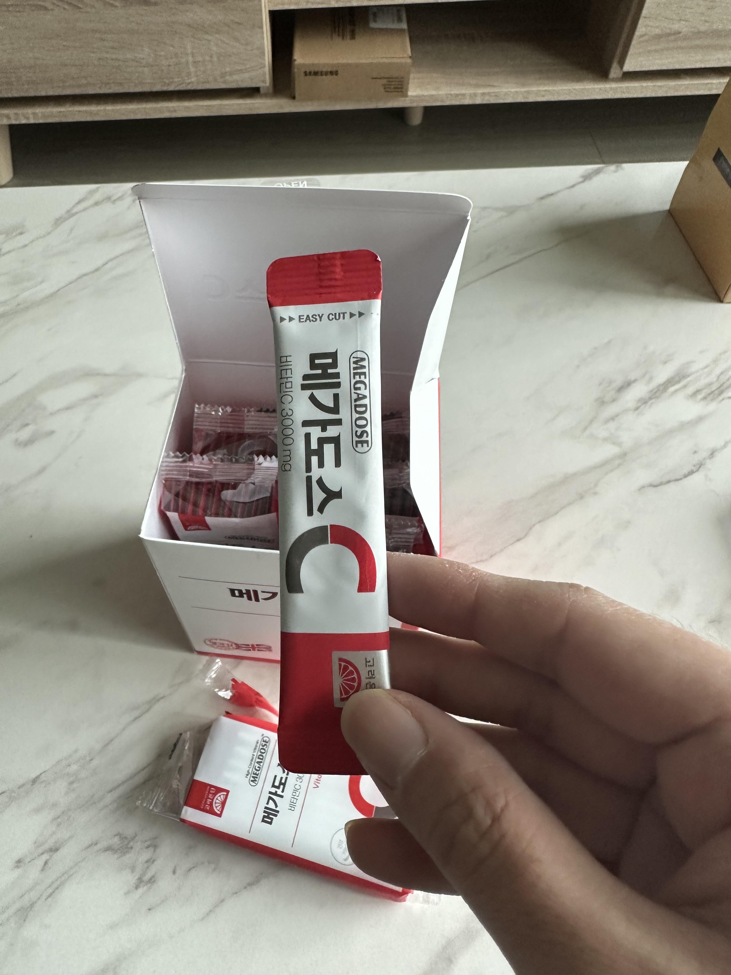 스틱 한개를 뜯어보았습니다. 사실 어두워서 잘 안보일 수 있는데요. 그래도 하얀색 가루가 들어있습니다 스틱 크기도 많이 크지도 않아서 적당하다고 할까요? 제가 예전에 올리브영에서 구매했던 비타민은 새콤보다는 달았는데요. 한번 먹을 때 2스틱씩 먹기도 했는데요. 아무리 비타민C가 달더라도 하루에 하나씩만 먹는 것은 꼭 지키시는게 좋을거 같아요! 그런데 메가도스C는 달지는 않고 엄청 새콤하기 때문에 막 먹지는 못할 것 같습니다. 아무래도 비타민C도 약이기 때문에 너무 달면 안좋은 것 같습니다.