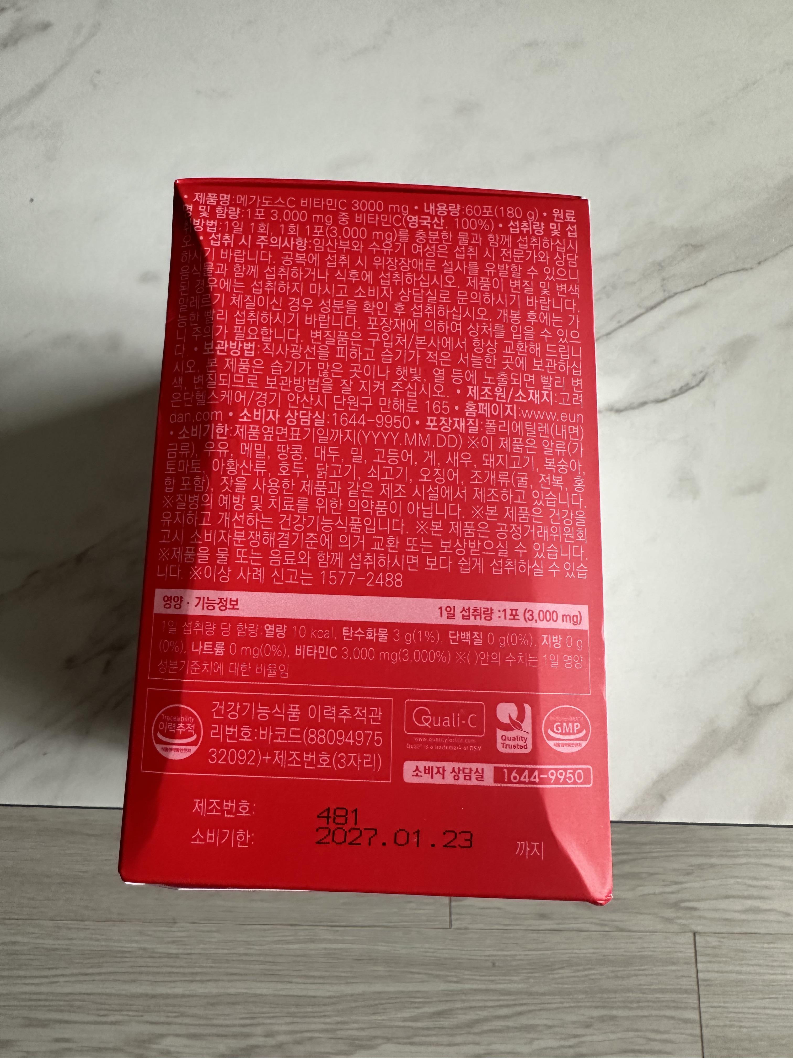 고려은단 메가도스C 박스에는 유통기한과 제품에 대한 정보가 적혀있었습니다. 유통기한은 구매 후 충분하게 먹을수 있도록 넉넉했습니다. 2027년 1월 23일까지로 설정되어있었습니다. 그러나 작년부터 유통기한 외에 소비기한이라는 부분이 생겼는데요. 소비기한은 제품을 만들경우 유통기한이 지날때까지 먹지못하거나 판매하지 못할 경우 폐기를 해야하는데요. 이럴 경우 가게 사장님과 구매자들은 음식을 버려야 하기 때문에 아깝기도 하지만 환경오염에도 피해를 주기 때문이라고 합니다. 좀 더 기간을 더 늘려서 이 기간까지는 먹어도 괜찮고 좀 더 팔 수 있도록 하는 제도라고 합니다.