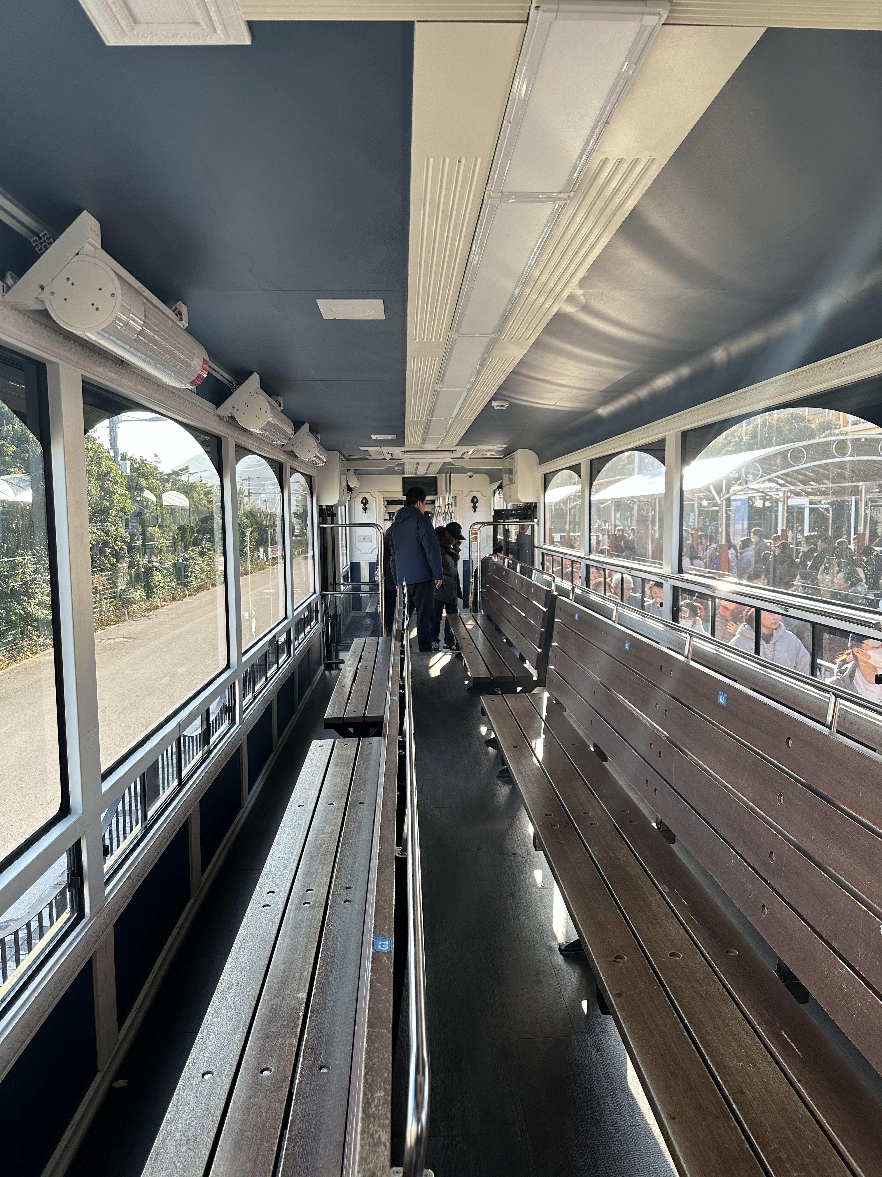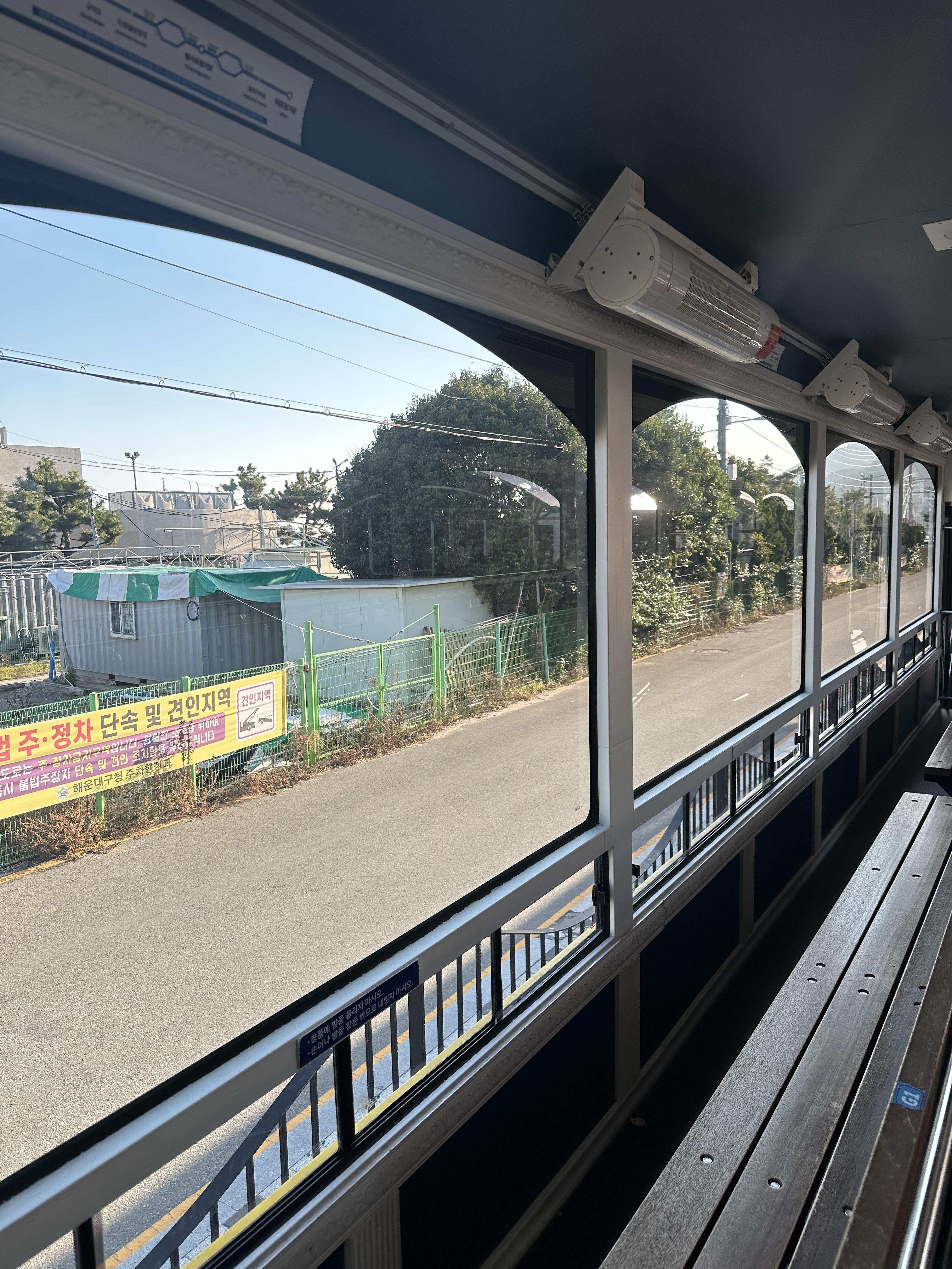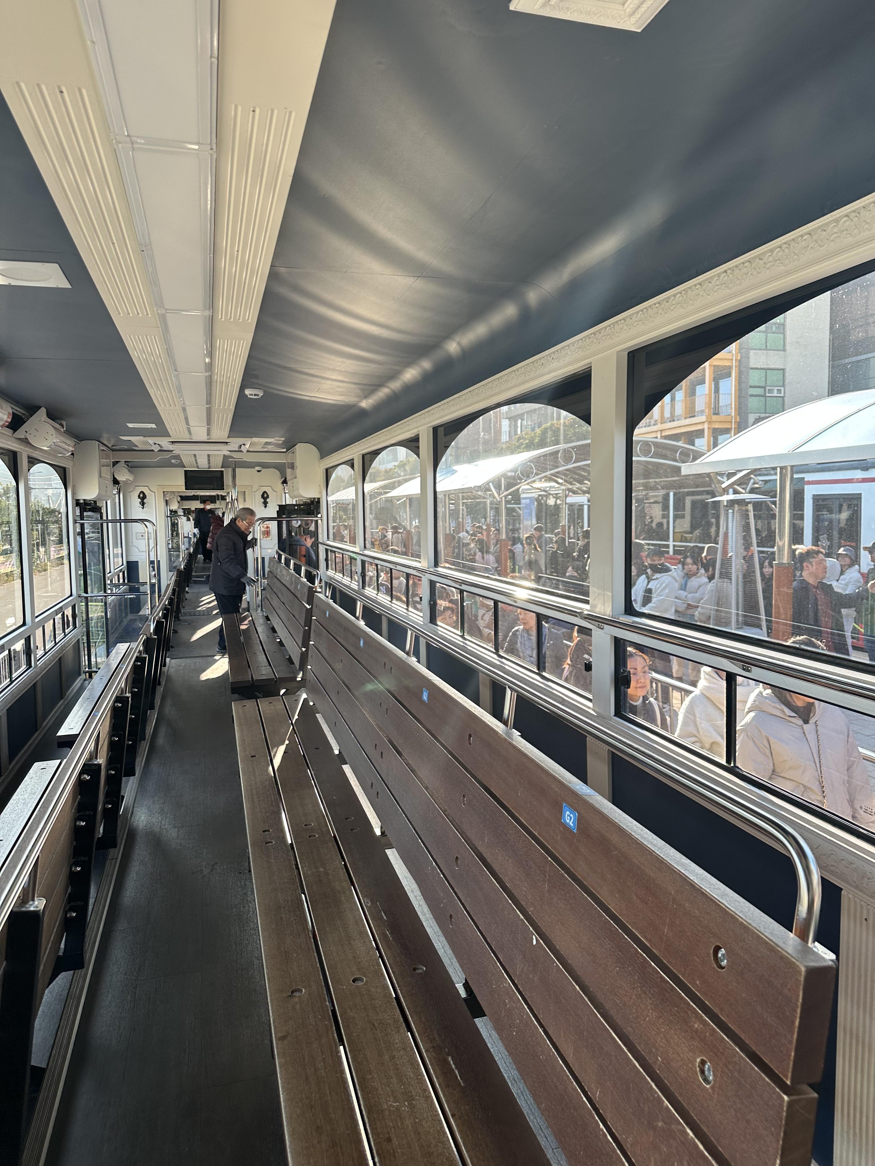해변열차는 전체 2량으로 운행됩니다. 1량은 좌석 두줄이 바다를 바라보도록 설치되어있습니다. 그리고 좌석 두줄 뒤에는 입석으로 서서 보볼 수 있도록 공간이 있었습니다. 저는 첫번째 줄에 앉아서 갔는데요. 사실 차이는 잘모르겠습니다. 그런데 영화관에서 영화를 잘보고 싶다면 맨앞이 아닌 중간보다 위쪽을 선호하는데요. 또한 가장 앞줄은 부담 느낄 수 도있구요. 보통은 맨 앞줄 보다는 두번째 줄에 않거나 아예 맨 뒤에서 서서 가는게 더 잘보이는 것 같습니다. 그러나 그렇게 큰 차이는 없으며 본인이 앉고 싶은 자리 앉는 것을 추천드려요.