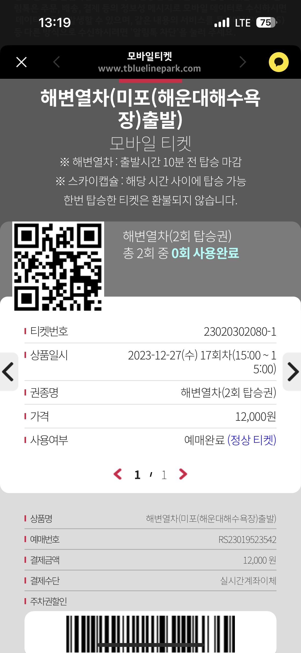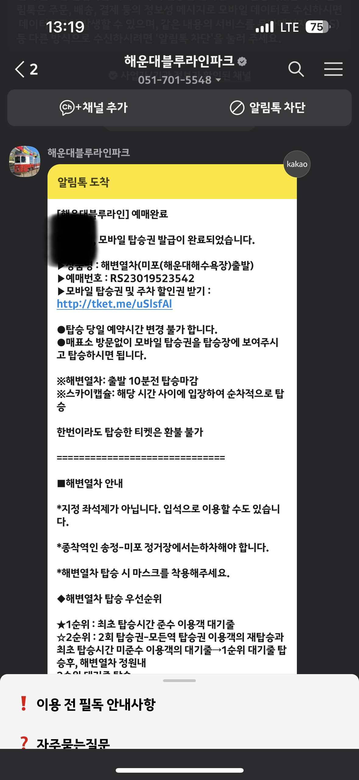 저는 몇시간 전에 해운대 누리마루에서 왠지 예약 못하면 아주 늦게 타거나 못탈거 같아서 예약을 하게 되었습니다. 예약을 하면 이렇게 바로 카카오톡 알림톡으로 보내주게 됩니다. 그리고 알림톡에 모바일 티켓 확인 할 수 있는 링크로 들어가면 QR 코드가 보이는 모바일티켓을 조회됩니다.
