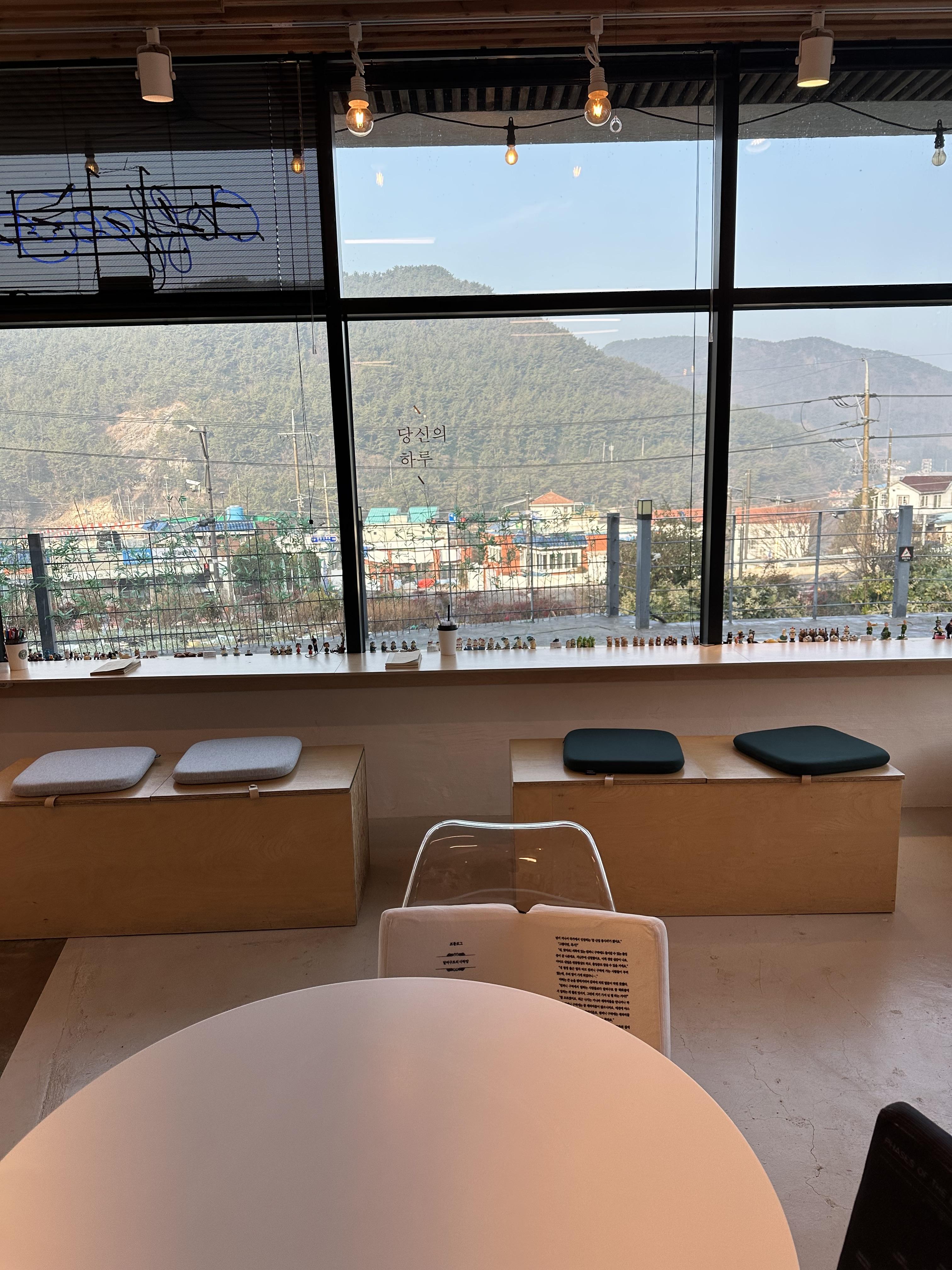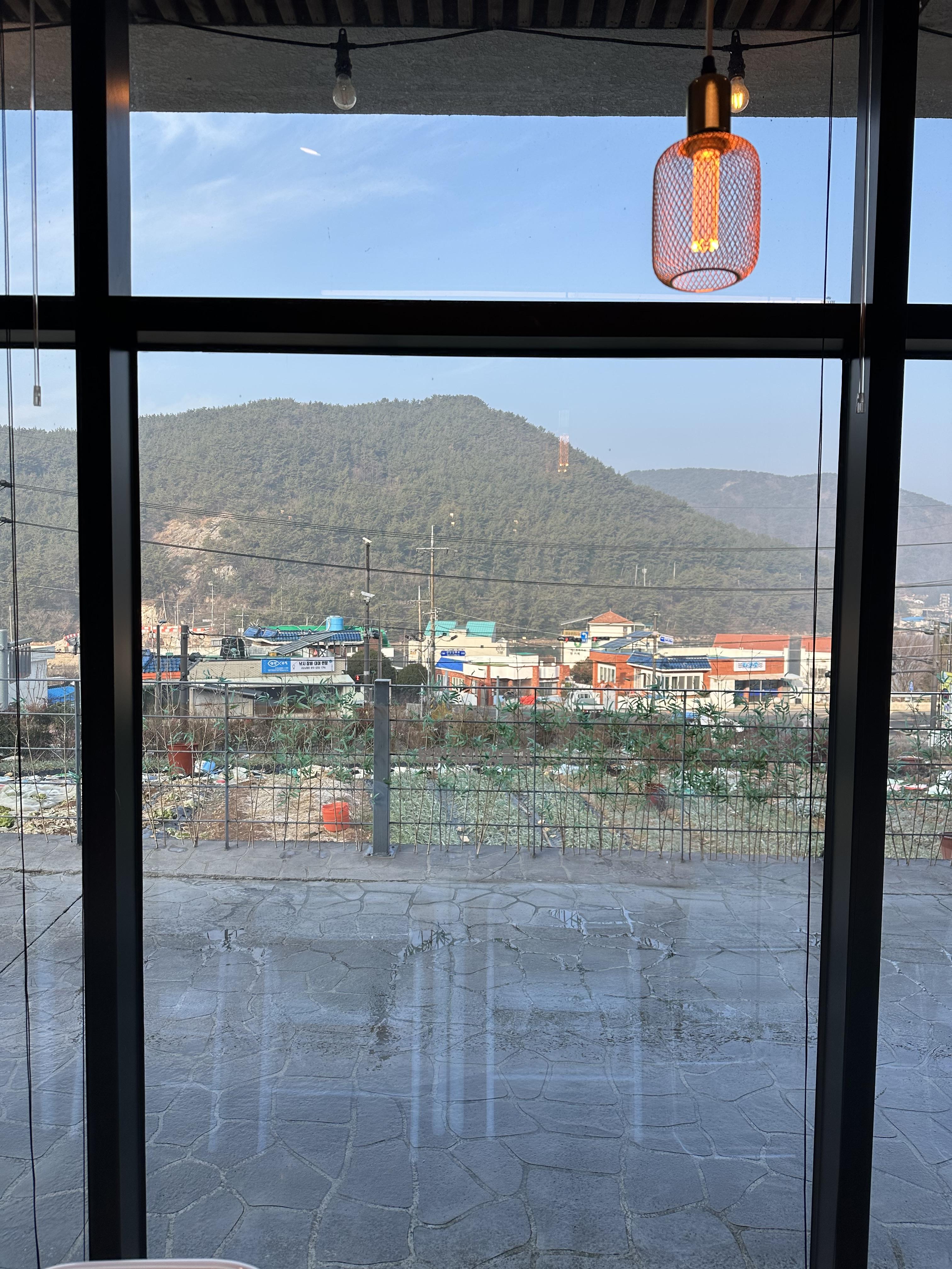 밤에는 커튼을 열어도 어두운 밤이었습니다.아침이 되어 커튼과 창문을 여니 작은 창문으로 방안에 통영의 빛이 들어오는데요. 방안에서 통영의 자연이 보이는데 힐링되었습니다. 보편적스테이 카페에서 큰 유리창문으로 보이는 산과 바다와 객실 작은 창문을 통해 보는 뷰는 달랐습니다.
