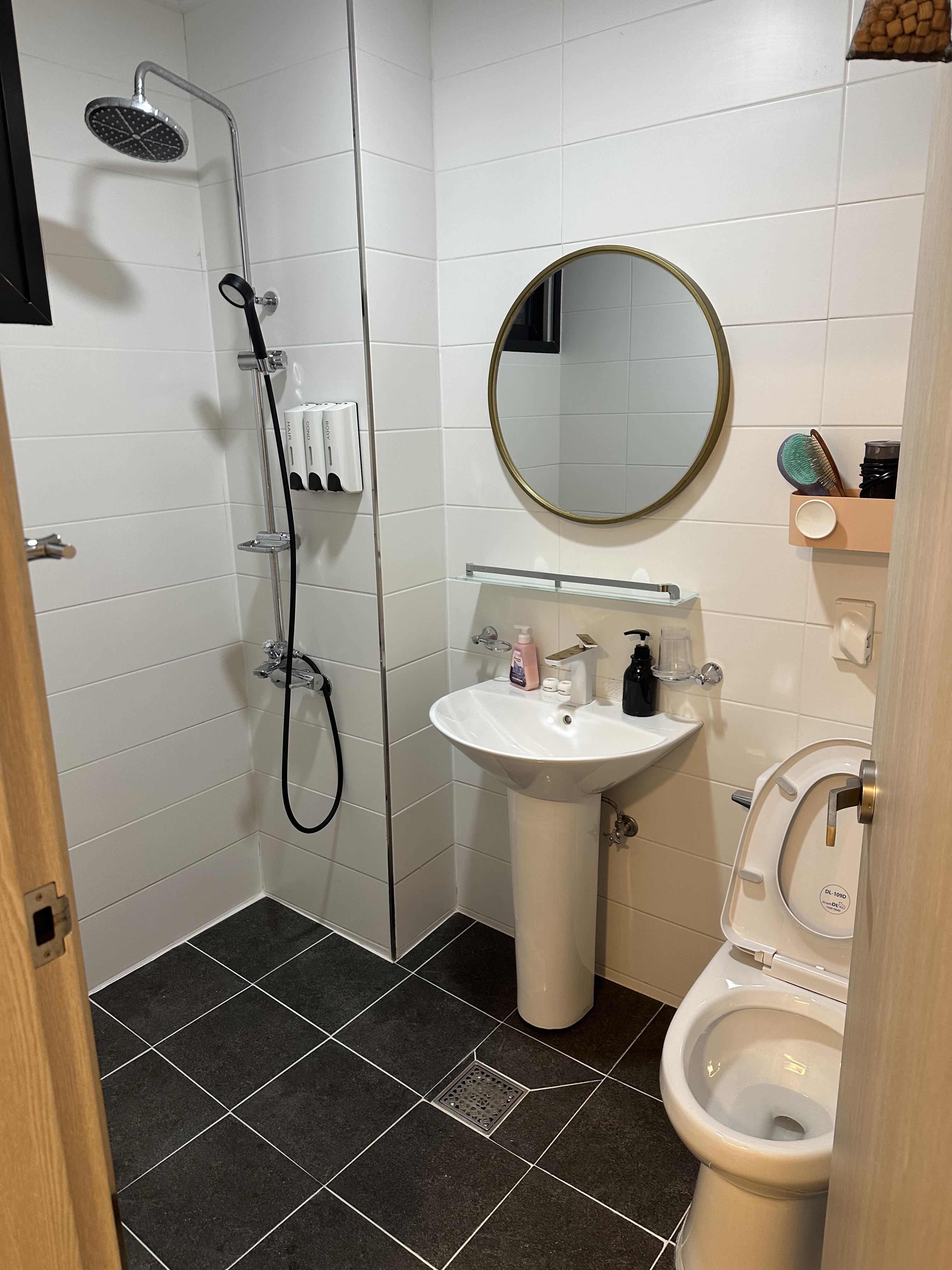 화장실은 1인실이나 2인실 모두 좁지 않은 크기였습니다. 기본적으로 치약, 샴푸, 컨디셔너, 바디워시, 핸드워시, 빗, 헤어드라이기가 제공되어있습니다. 일회용품만 제공되지 않습니다. 따라서 칫솔 미구매시 통영시내 혹은 보편적스테이 길건너 바다 쪽에 이마트24 편의점을 통해 치약 칫솔을 구매 할 수 있습니다. 저같은경우 여행다닐 때 사용하기 위해서 지난번 여수 여행 때 칫솔을 샀는데요. 일회용품을 사용 시 친환경을 위한 활동은아니기 때문에 조금 불편하더라도 여행다닐 때 들고 다닐수 있는 세면용품을 구매하는것도 나쁘지 않을 것 같습니다.