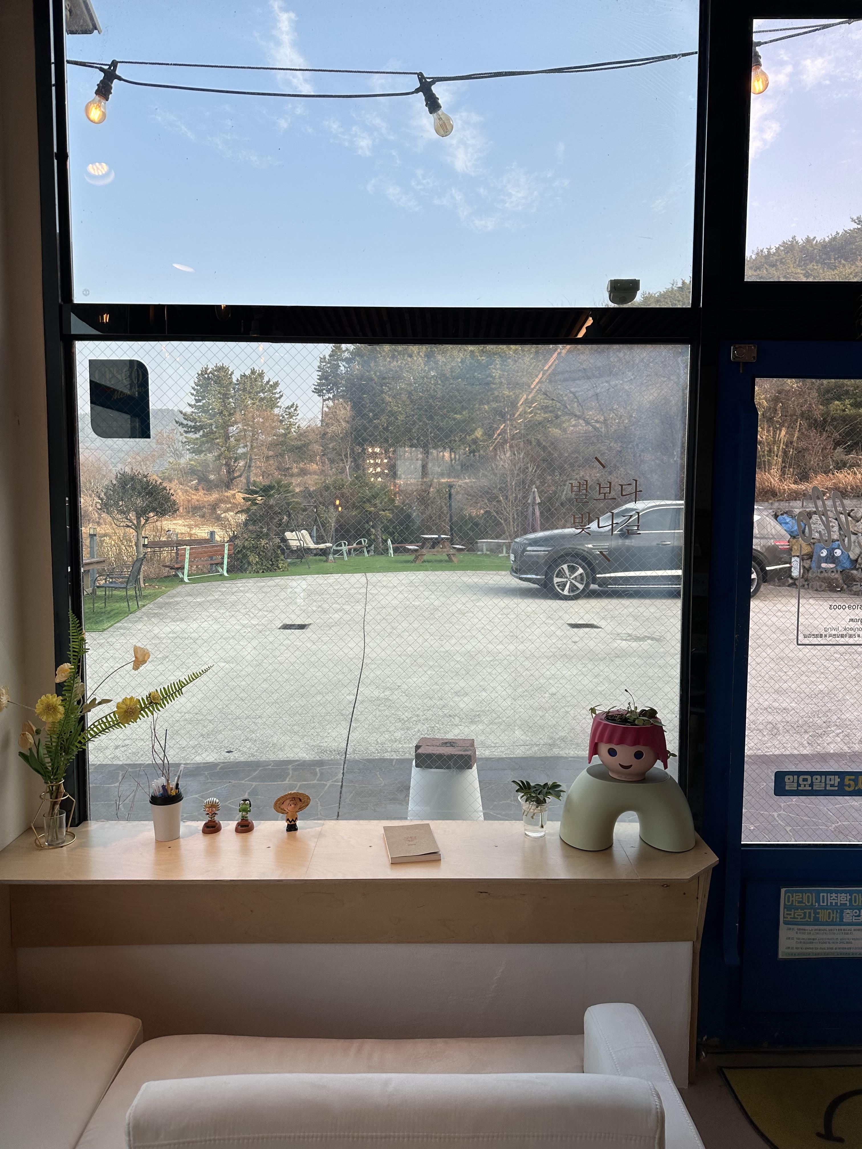 1층 보편적 카페에서 음료를 마시다보니 체크아웃 시간이 얼마 되지 않았습니다. 커튼을 열고 작은 창문을 여니까 환한 빛이 방을 비춥니다. 지난번 방문했을 때는 멀리서 바다와 산이 보이는 객실이었는데요. 이번 2인실은 바다와 산은 아니고 산이 보이는 뷰였습니다. 보편적스테이 1층에는 정원과 함께 또 다른 휴식공간이 있었습니다. 주차장 뒤에는 벽돌이 있는데요 눈코입이 그러져있는 벽돌이 참 귀여웠습니다.