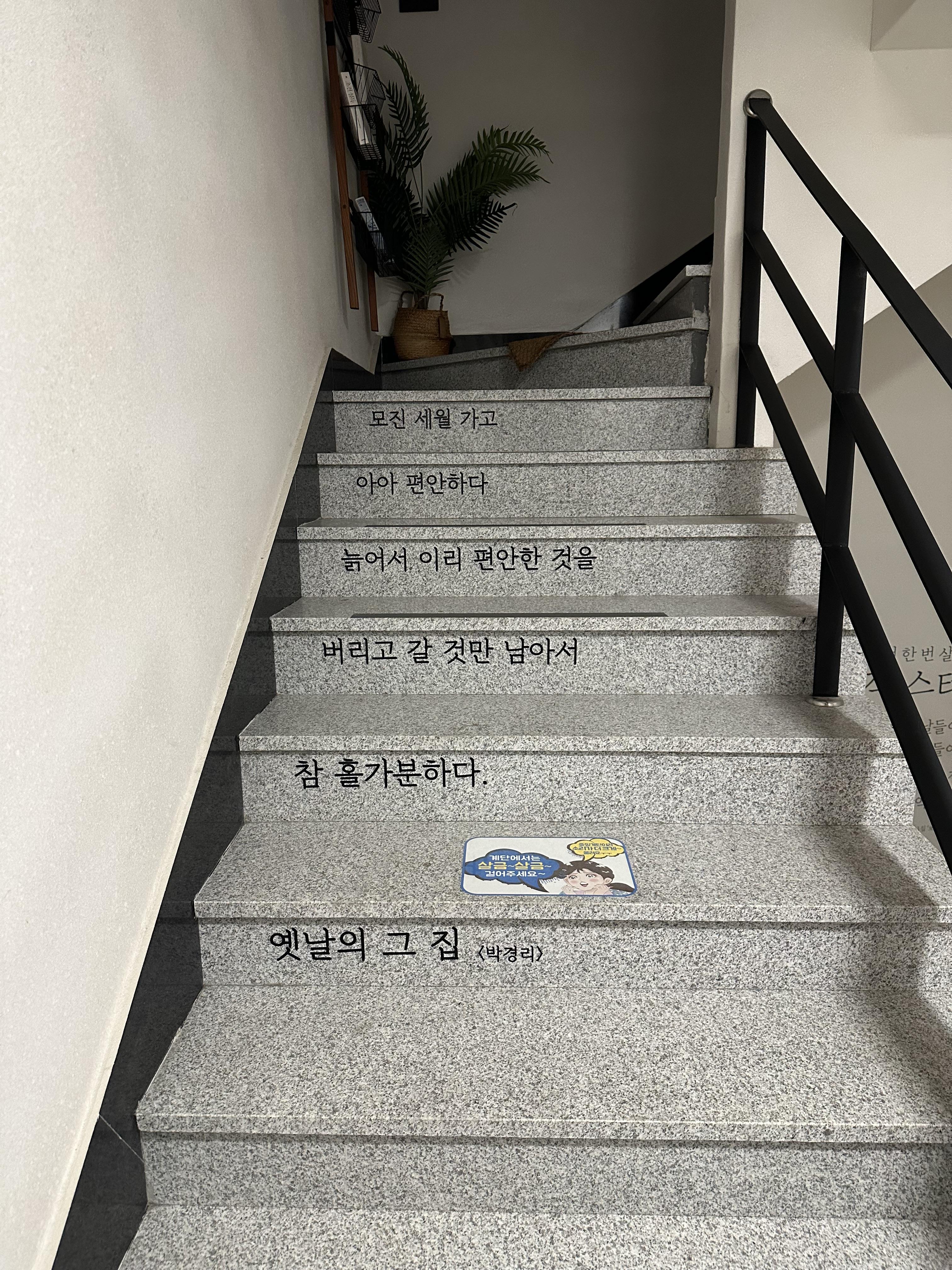 1층 카페에서 체크인을 했습니다. 그리고 객실 정보를 받아서 계산을 이용해 오르고 있었습니다. 제가 배정받은 객실은 3층이구요 303호 객실이었습니다. 슬로비게스트하우스처럼 올라가는 계단과 벽면에는 좋은 글귀가 적혀있었습니다. 그리고 정말 조용한 숙소라는게 느껴지도록 오후 10시 까지만 공용공간 이용가능하다고 부착되어있었습니다. 숙소 관리가 잘되는지 정말 조용합니다. 특히 시끄럽게 떠들면 건물구조상 소음이 들리기 때문에 저녁에는 주의 하는게 다른 게스트(손님)들을 배려해주는 것이겠죠