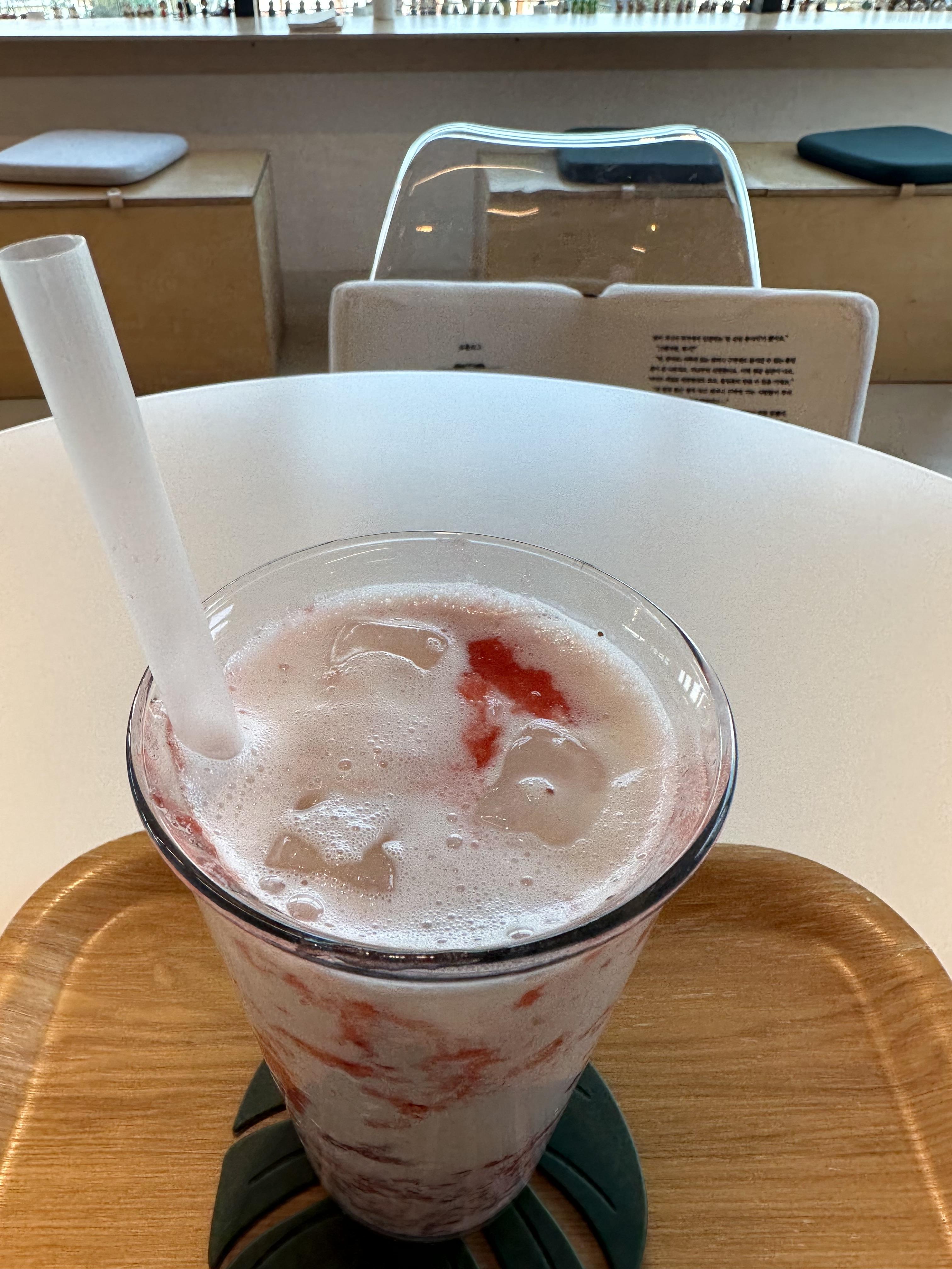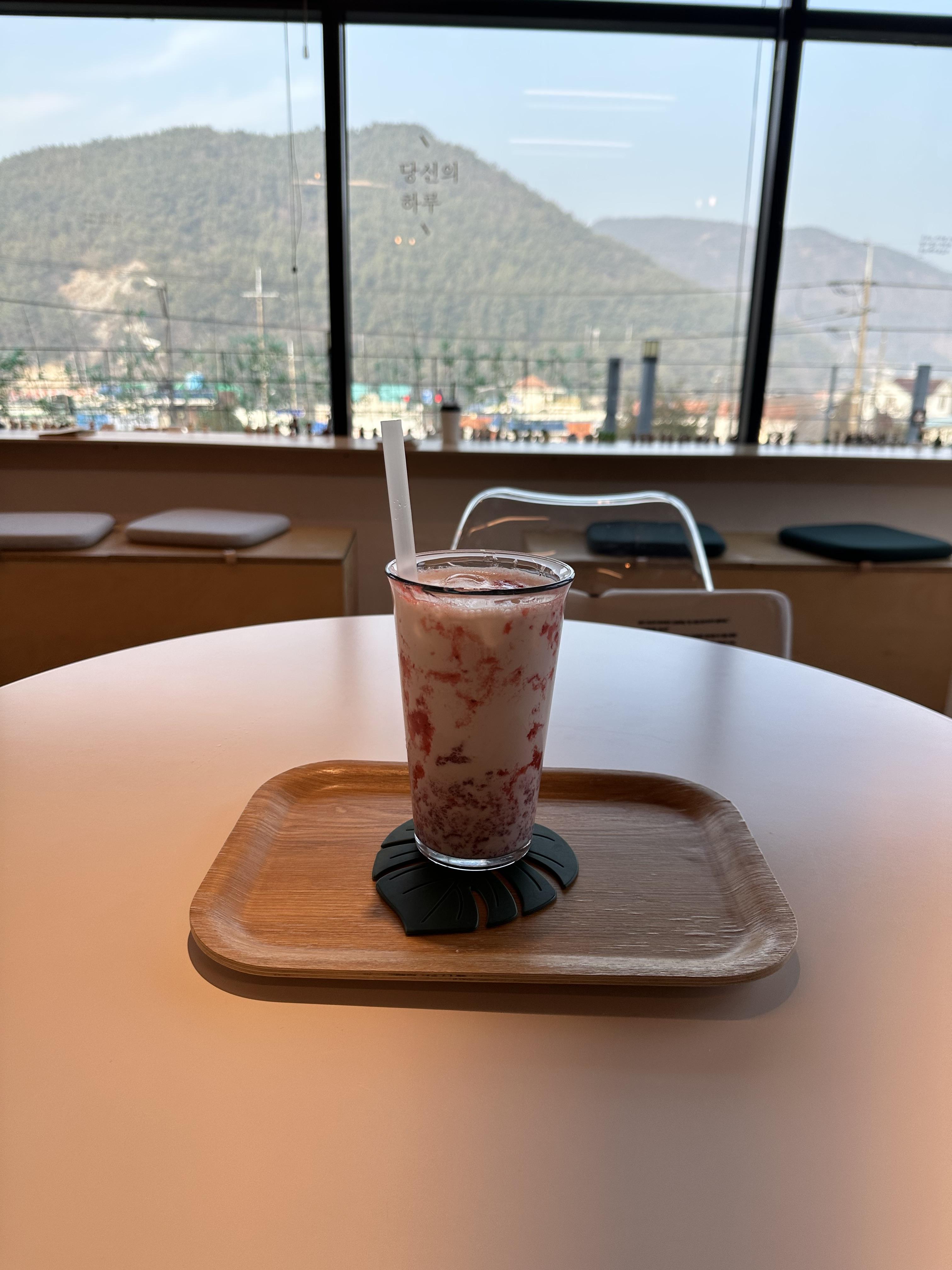 작년 6월에는 네이버에서 보편적스테이 숙소 예약 시 조식도 함께 시켜서 바로 먹을 수 있었는데요. 사실 이번 통영 여행은 슬로비게스트하우스 2박할 예정이었으나 전날 슬로비게스트하우스 방문후 1박 더 예약하려고 했으나 예약이 차버렸더라구요. 그래서 지난번 보편적스테이의 좋은 느낌을 이어받아 예약을 했는데요. 이번엔 좀 더 다양한 음료를 마치기 위해 딸기청라떼를 주문했습니다. 정말 큰 유리창앞에서 산과 바다를 보며 음료를 마시는데 정말 힐링되는 느낌 좋은 느낌이었습니다. 도시에서 살다가 가끔 산과 바다가 보이는 곳에 오면 정말 좋더라구요.