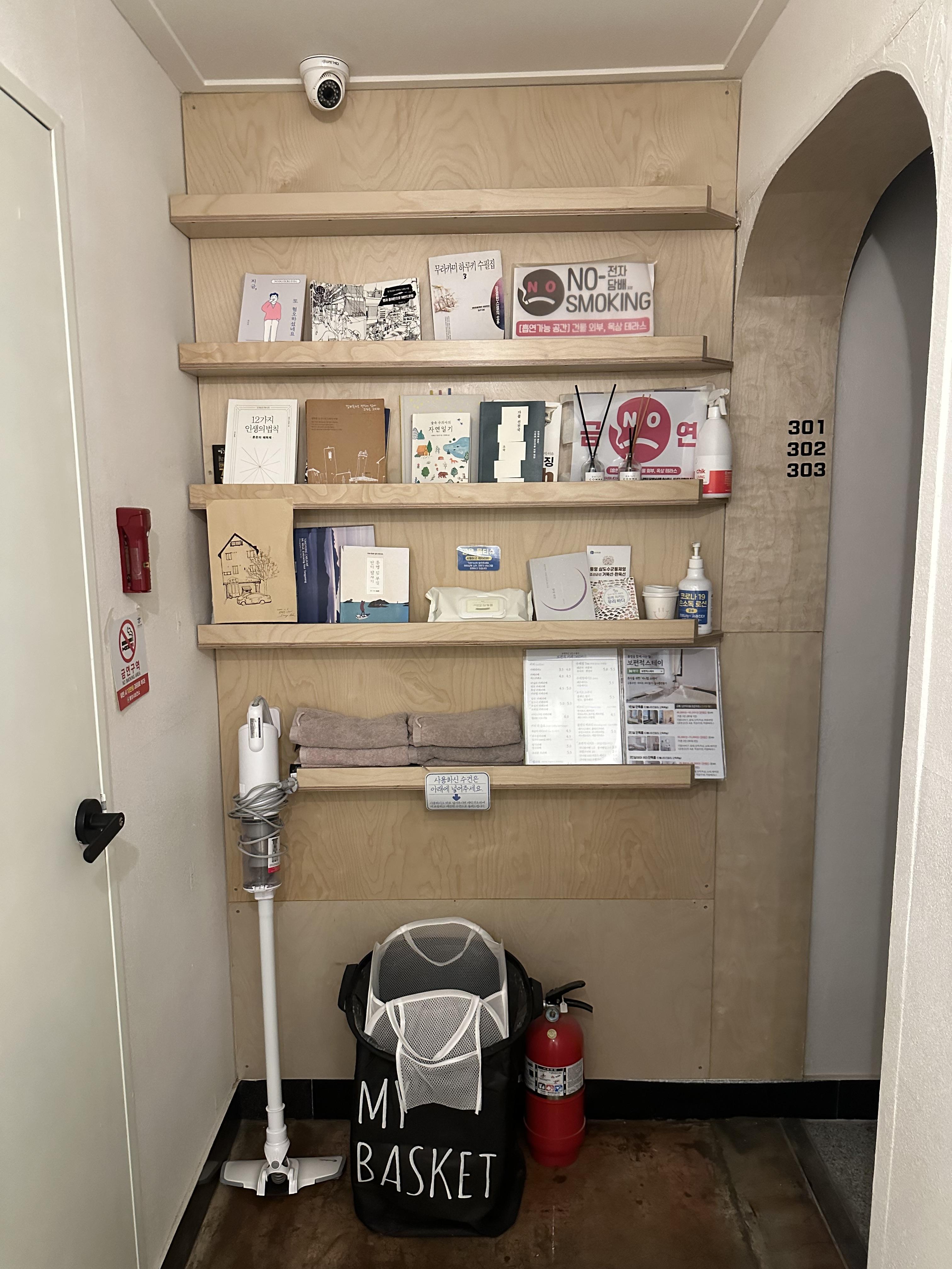 제가 배정받은 객실은 3층 303호 였습니다. 도어락은 번호키 방식이었습니다. 정말 조용한 숙소이고 방음이 잘안되다보니 늦은시간 정적이 흐를때는 비밀번호도 누르기 미안할정도로 크게 들렸습니다. 코로나 이후에는 게스트하우스의 파티가 사라졌는데요. 코로나 이전부터 게스트하우스 사건 사고가 많았습니다. 그래서 요즘은 파티 안하겠지만 파티를 하는 게스트하우스나 호텔, 모텔, 호스텔만 보더라도 보통 여행오는 분들으 대부분 놀러오기 때문에 늦게까지 노는분들이 있어서 시끄러운데요. 보편적스테이숙소는 대부분 장기숙소로 이용하는 손님도 있고 정말 쉬러오는 분들이 있어서 저녁에도 정말 조용하고 쉬기에 좋았습니다. 정말 휴식을 위해 이용할 수 있느 숙소가 국내에 있을까 생각이 들어요