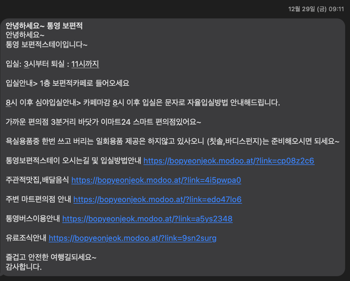 보편적스테이 숙소 사장님과 슬로비게스트하우스 사장님이 가족이다보니 보편적스테이도 예약 후 당일 또는 전날에 사장님께서 정리하신 맛집과 주변 식당, 찾아오는 길, 유료조식 등등 정보를 전달해주고 있습니다. 보편적스테이 사장님은 대부분 링크로 주시더라구요. 슬로비게스트하우스 사장님은 장문의 문자를 보내주시는데요. 그게 두분의 차이점같은데 장단점은 있는것 같습니다. 보편적스테이 사장님의 문자방식은 필요한 정보만을 골라서 볼 수 있게 해주시는 것 같습니다. 슬로비게스트하우스 사장님은 정말 하나하나 친절함과 손님들의 대한 진심이 담겨져 나와요. 이 포스팅이 보편적스테이 포스팅이기는 하지만 그래도 제 포스팅을 통해 좀 더 맞는 곳을 이용하시는 게 좋을 것같습니다. 저는 두 곳 모두 맘에 들고 한번씩 각각 이용해보면 좋으실거 같아요.