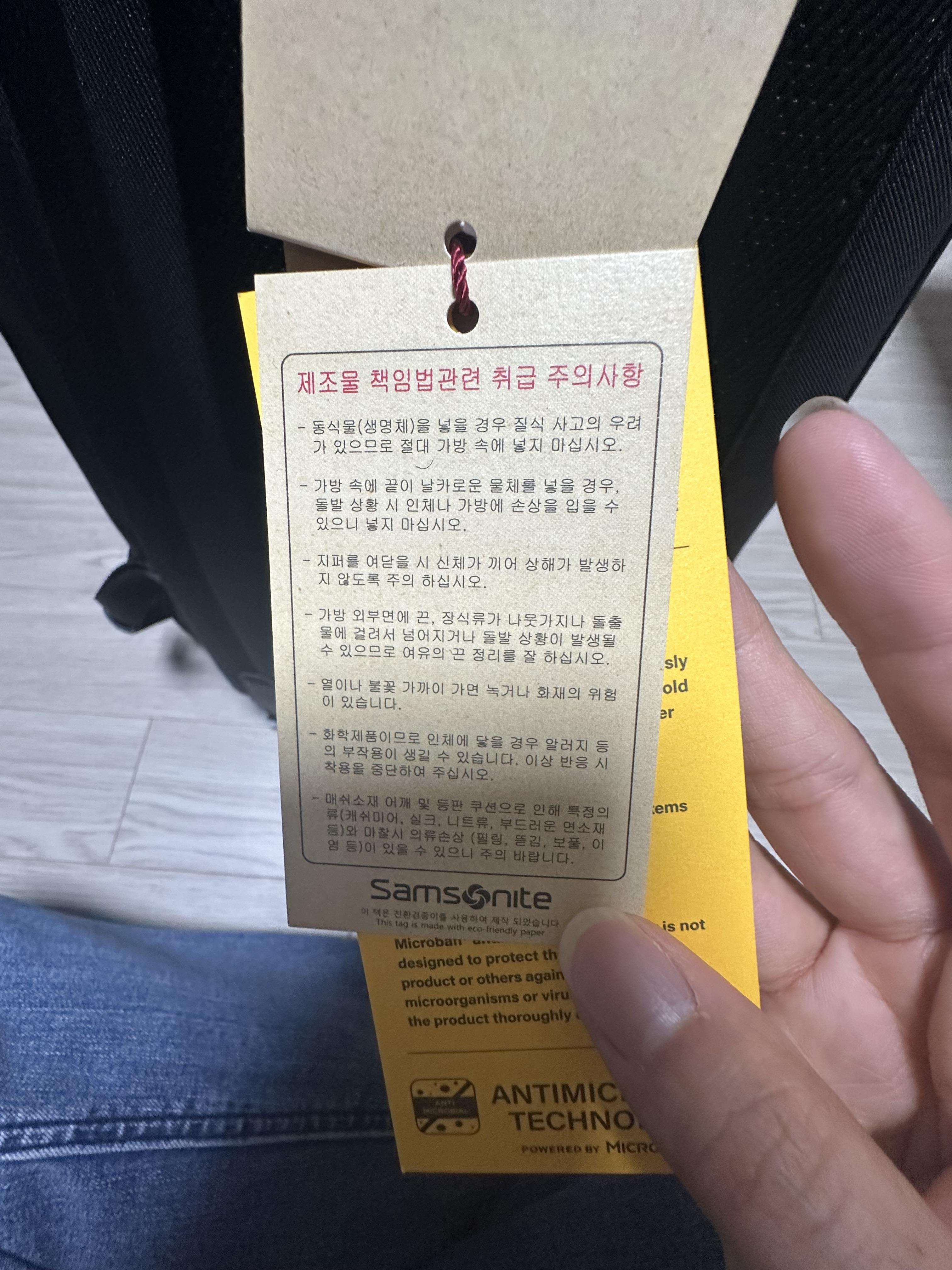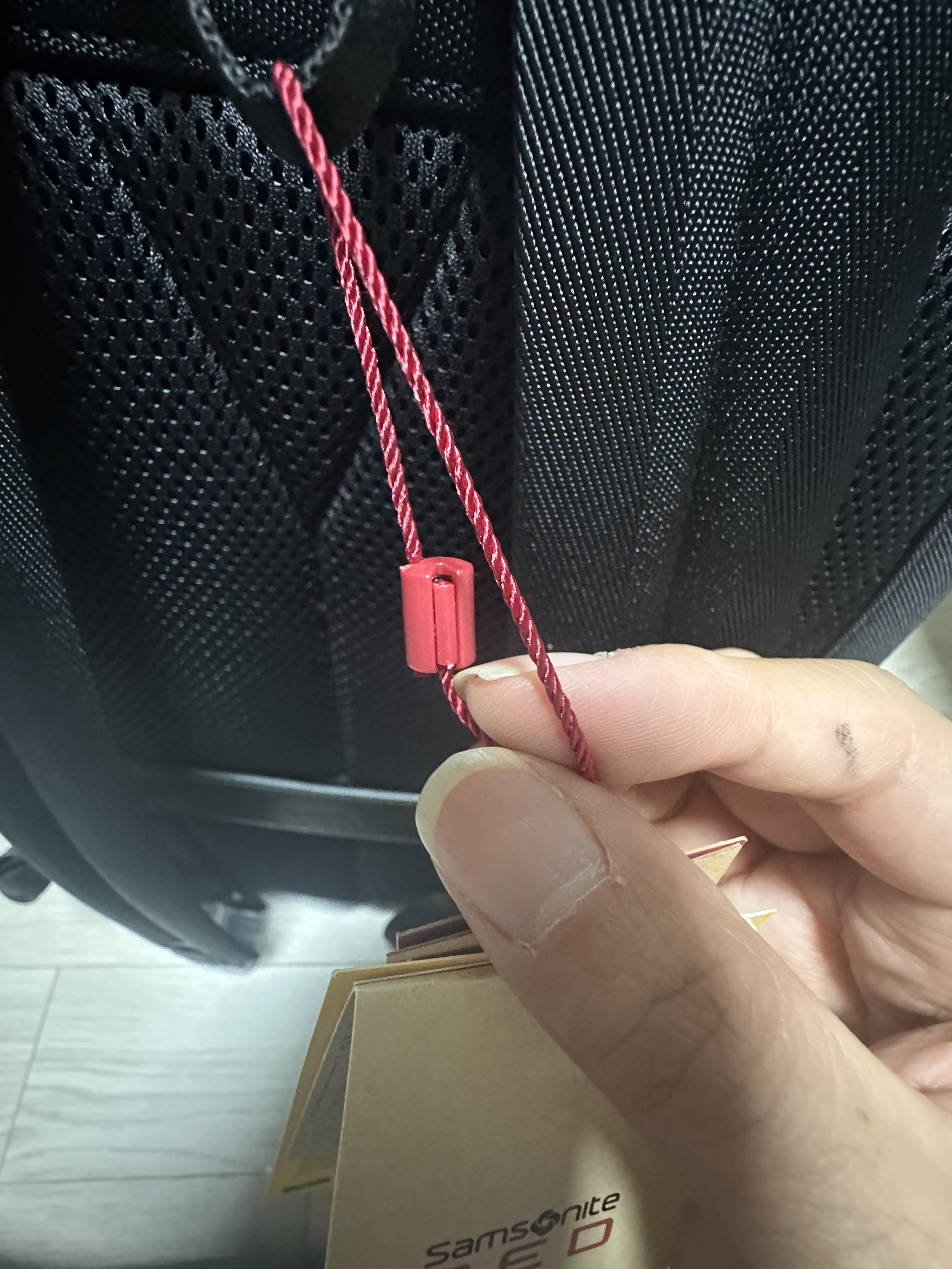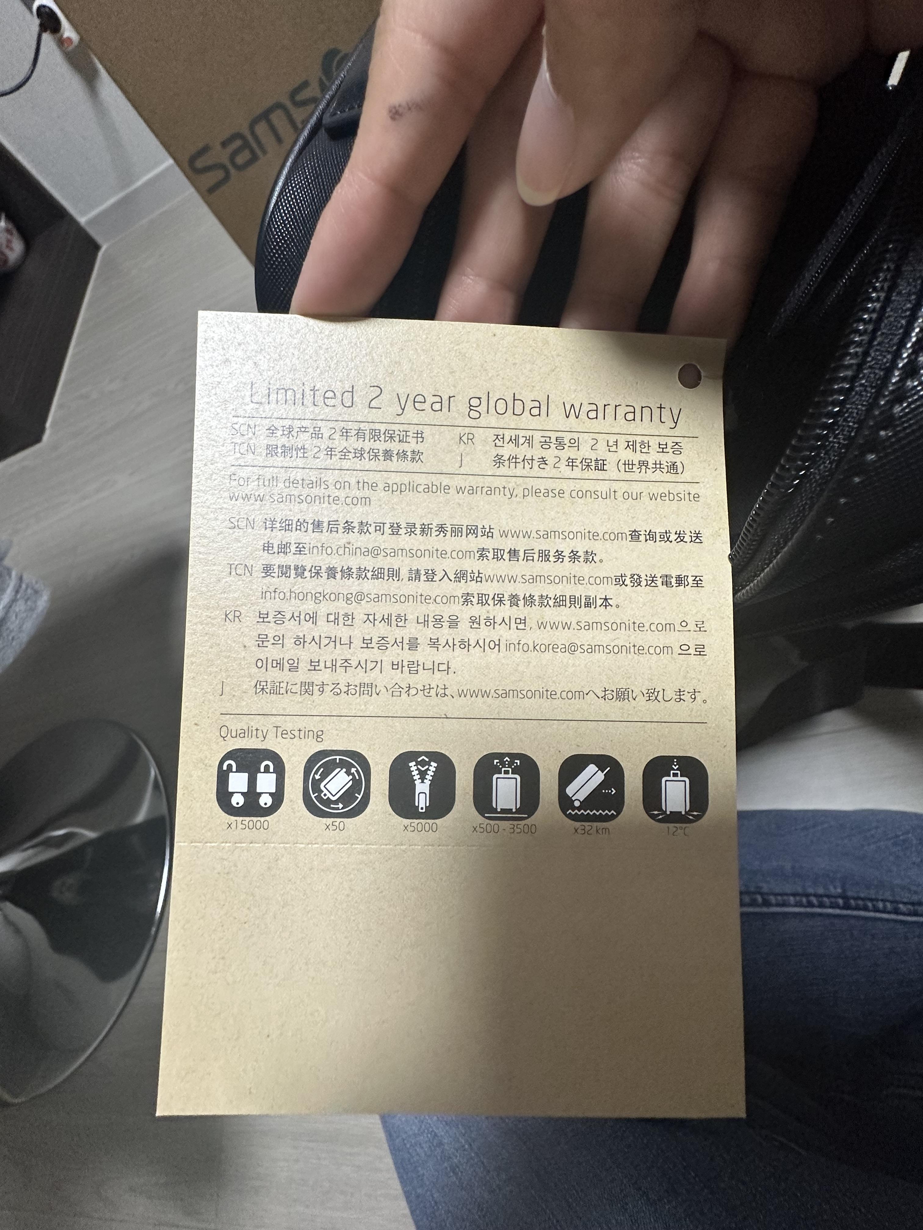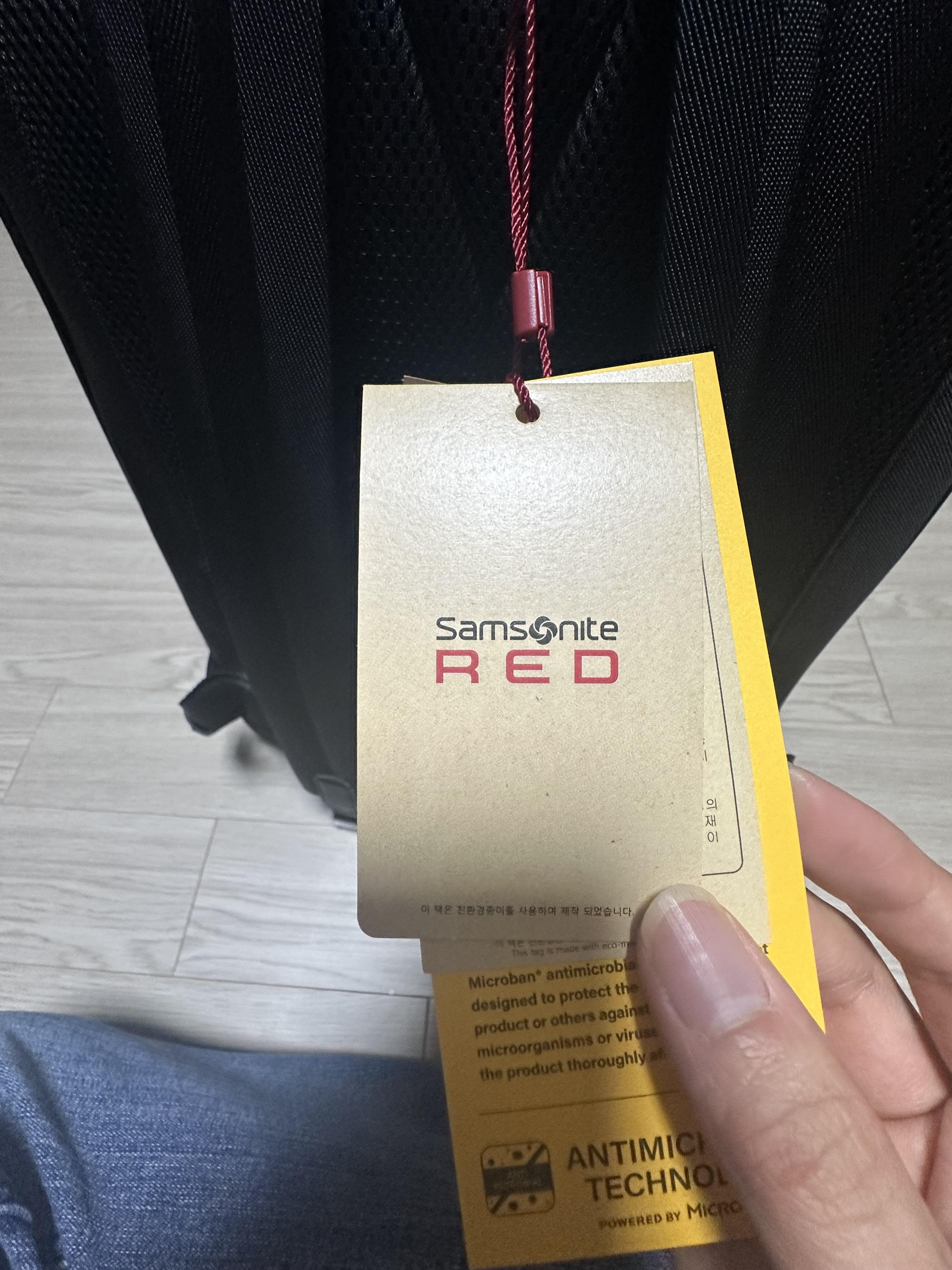 쌤소나이트 레드 보증서와 설명서는 가방 손잡이 부분에 이렇게 매달려있는데요. 요즘에는 명품이 아니더라도 가방이나 옷에 붙어있는 종이 조각들이 손상가지 않도록 쉽게 제거 할 수 있도록 만들어지는 경우가 많습니다. 혹시 새 가방이나 새 옷을 사셨다면 옷에 붙은 종이 제거 시 잘보셔서 제거 하시는것을 추천해요. 막 잡아 당기거나 가위로 자르다가 실수로 옷이 손상 될 수 있어요.