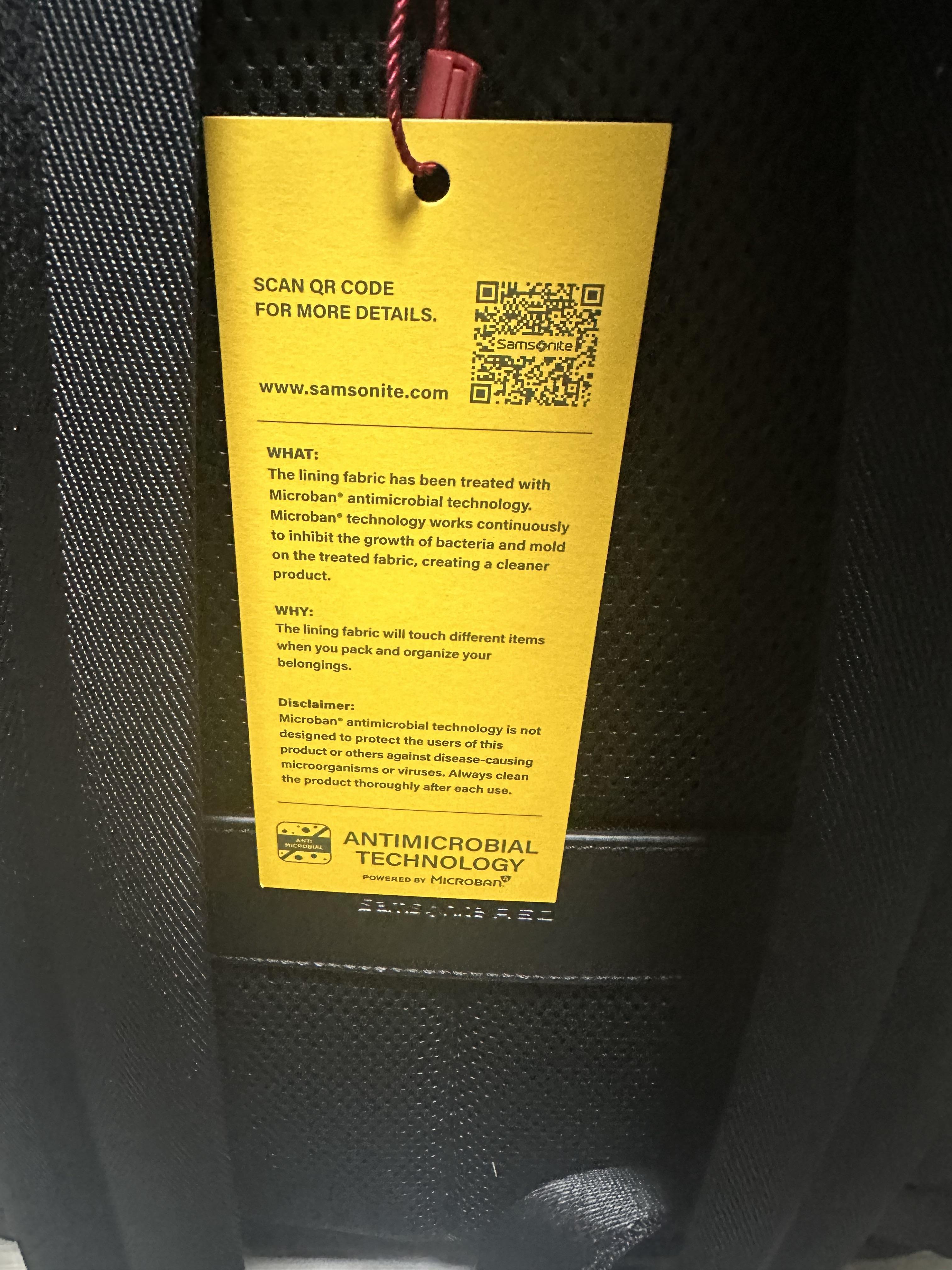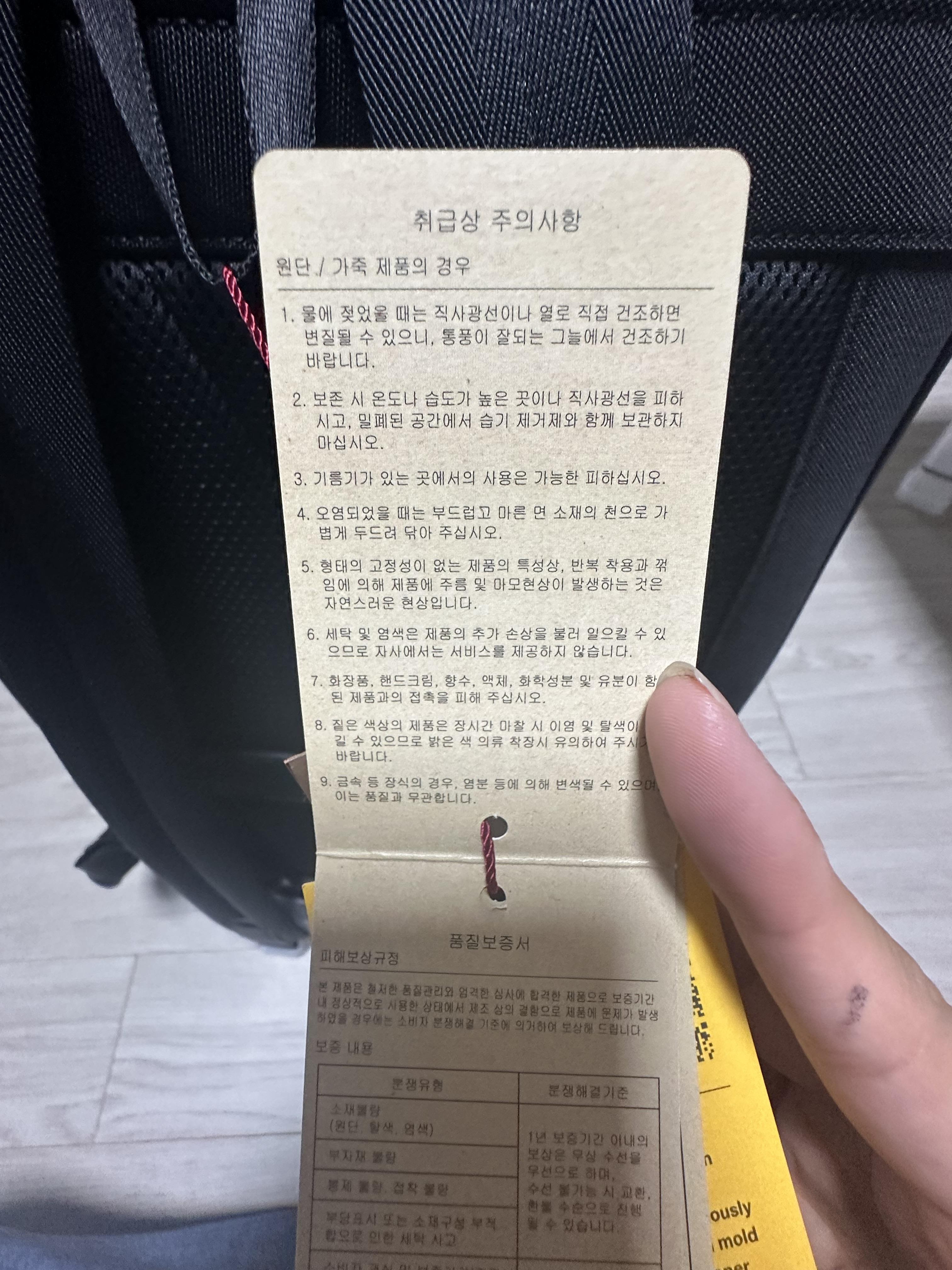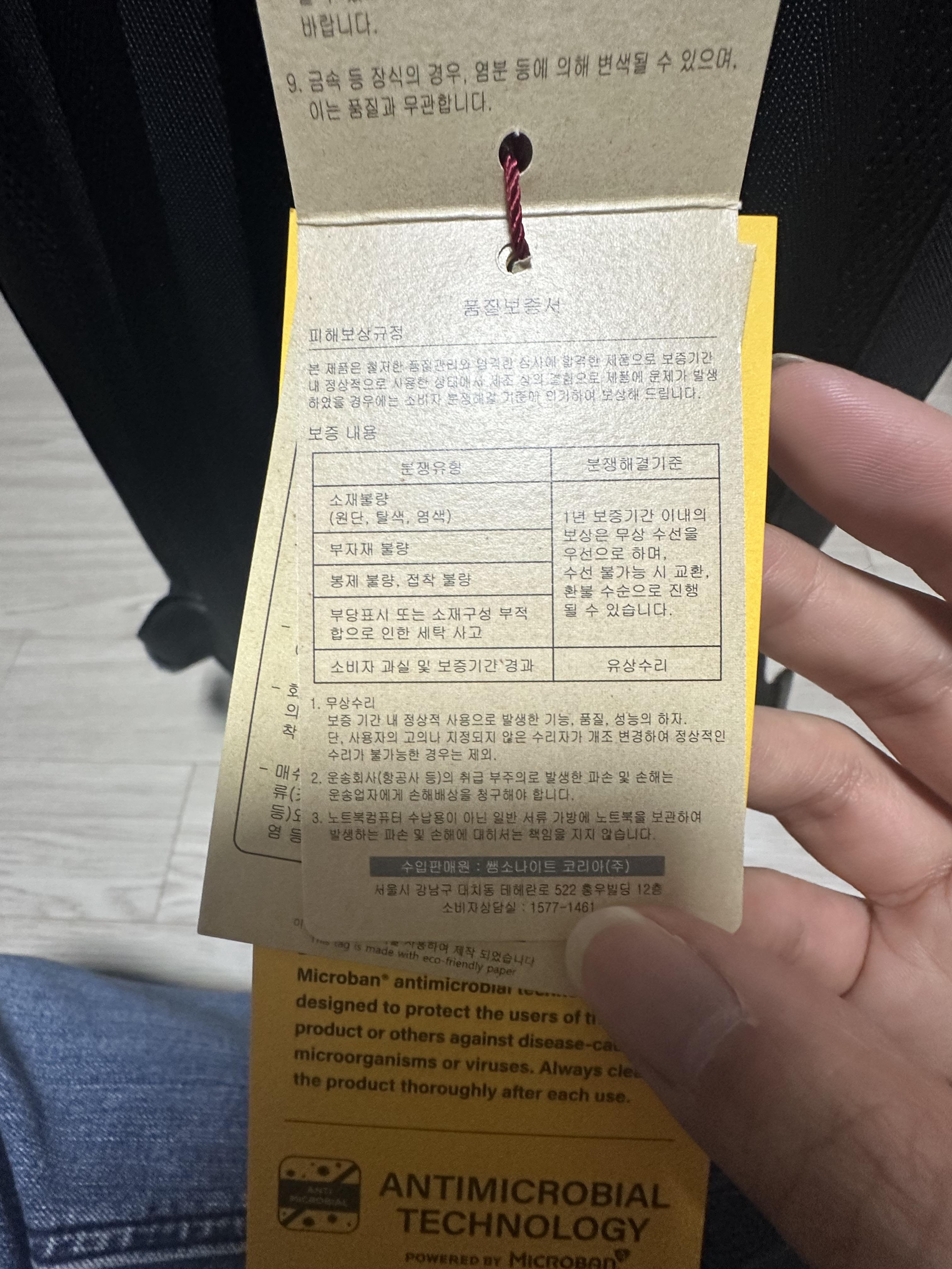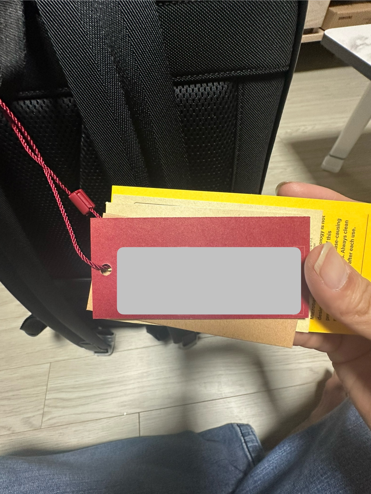 쌤소나이트 레드 보증서와 설명서는 가방 손잡이 부분에 이렇게 매달려있는데요. 요즘에는 명품이 아니더라도 가방이나 옷에 붙어있는 종이 조각들이 손상가지 않도록 쉽게 제거 할 수 있도록 만들어지는 경우가 많습니다. 혹시 새 가방이나 새 옷을 사셨다면 옷에 붙은 종이 제거 시 잘보셔서 제거 하시는것을 추천해요. 막 잡아 당기거나 가위로 자르다가 실수로 옷이 손상 될 수 있어요.