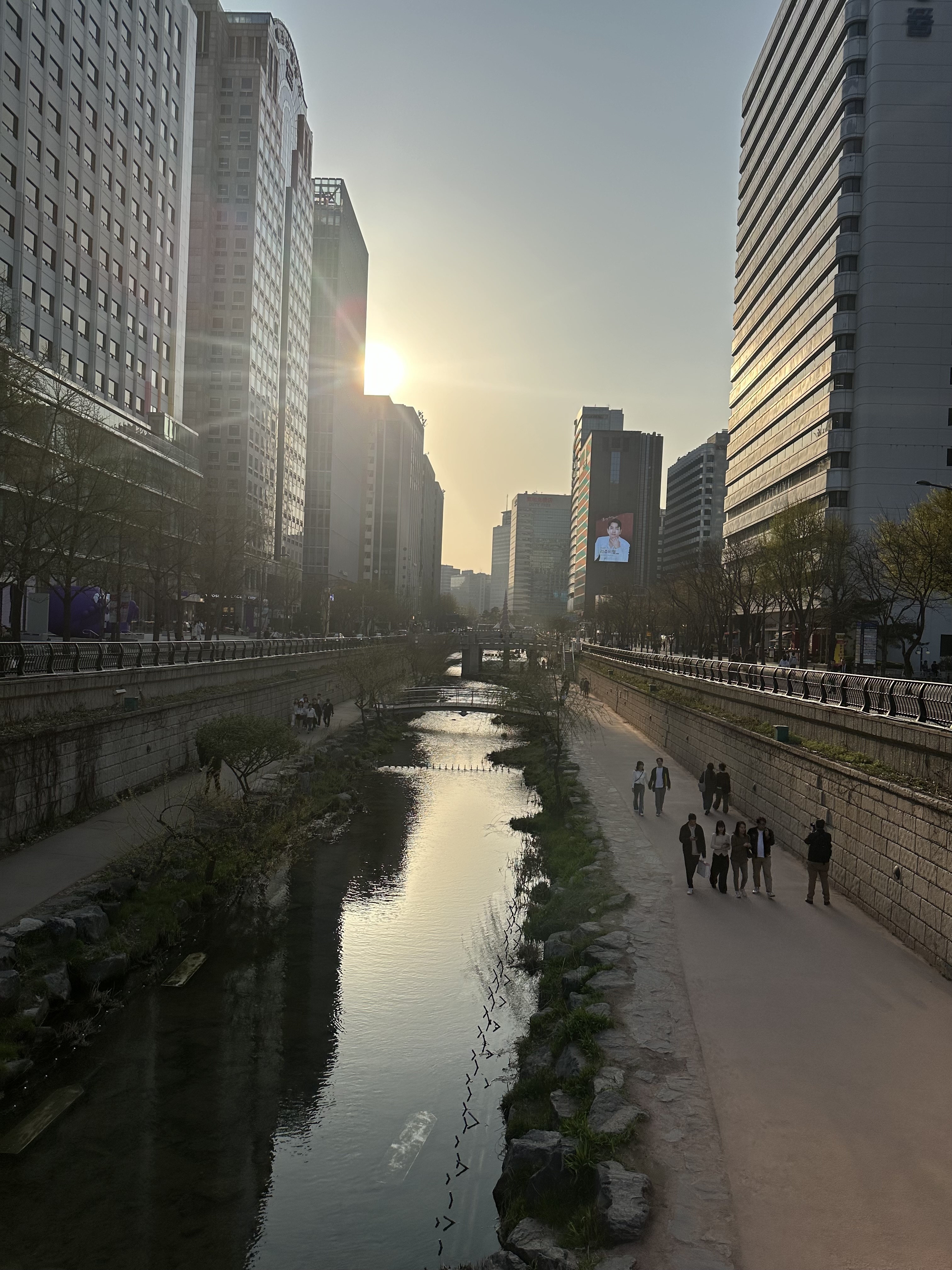 오후 반차를 내고 서울 명동거리에 도착했습니다. 화폐박물관을 구경하고 신세계백화점 본점에서 쌤쏘나이트 레드 백팩 가방을 구매하고 종로에 있는 청계천에 도착했을 때는 해가 천천히 지면서 일몰이 다가오고 있었습니다. 아직 퇴근시간 직전이라 그런지 해가 천천히 지고 있는 청계천에는 한산한 모습을 보이고 있었습니다. 퇴근시간이 되면 청계천과 종로거리는 퇴근길 인파로 붐비게 됩니다. 종로는 업무와 학업 그리고 즐기는 공간으로서 다양한 역할을 하기 때문에 항상 복잡한 도시였습니다.
