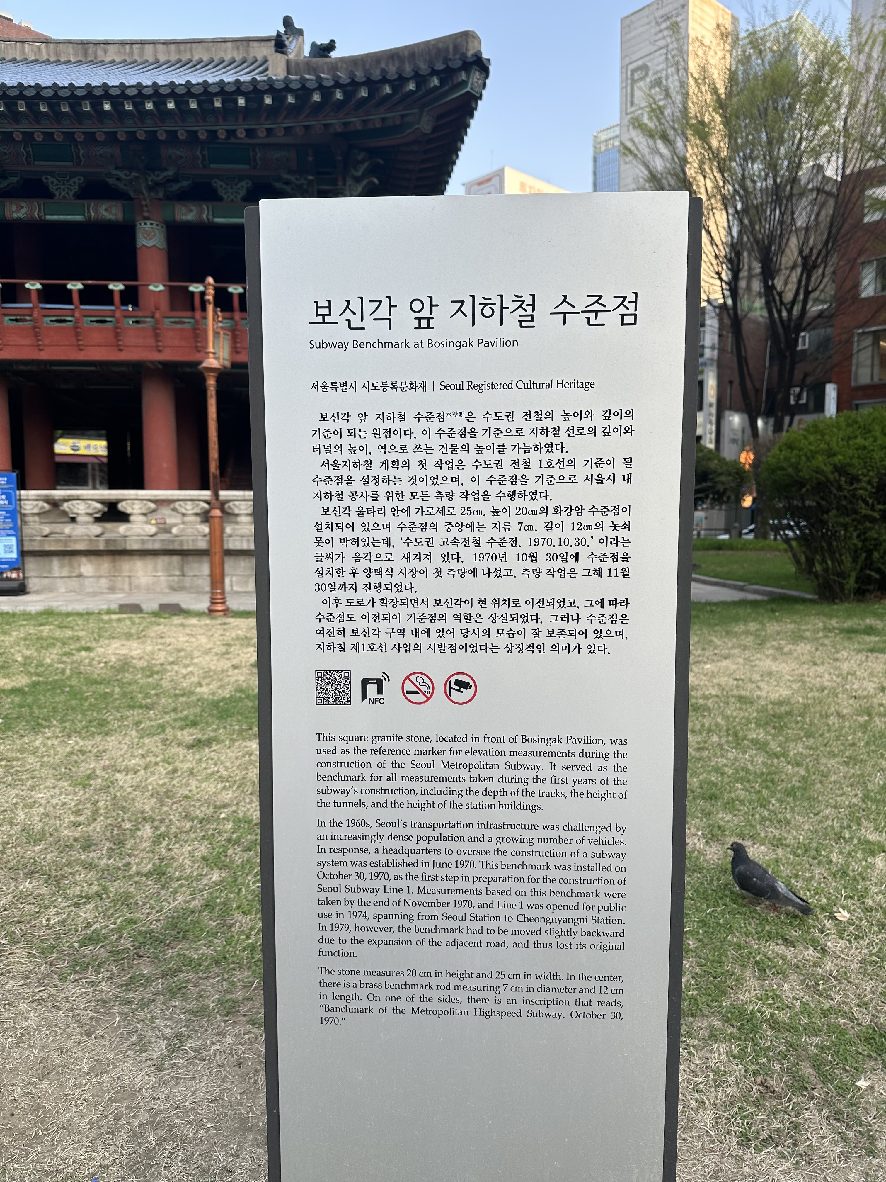 - 이후 도로가 확장되면서 보신각이 현 위치로 이전되었고 그에 따라 수준점도 이전되어 기준점의 역할을 상실되었다고 합니다. 그러나 수준점은 여전히 보신각 구역 내에 있어 당시의 모습이 잘 보존되어 있으며, 지하철 제1호선 사업의 시발점이었다는 상징적인 의미가 전해지고 있습니다.