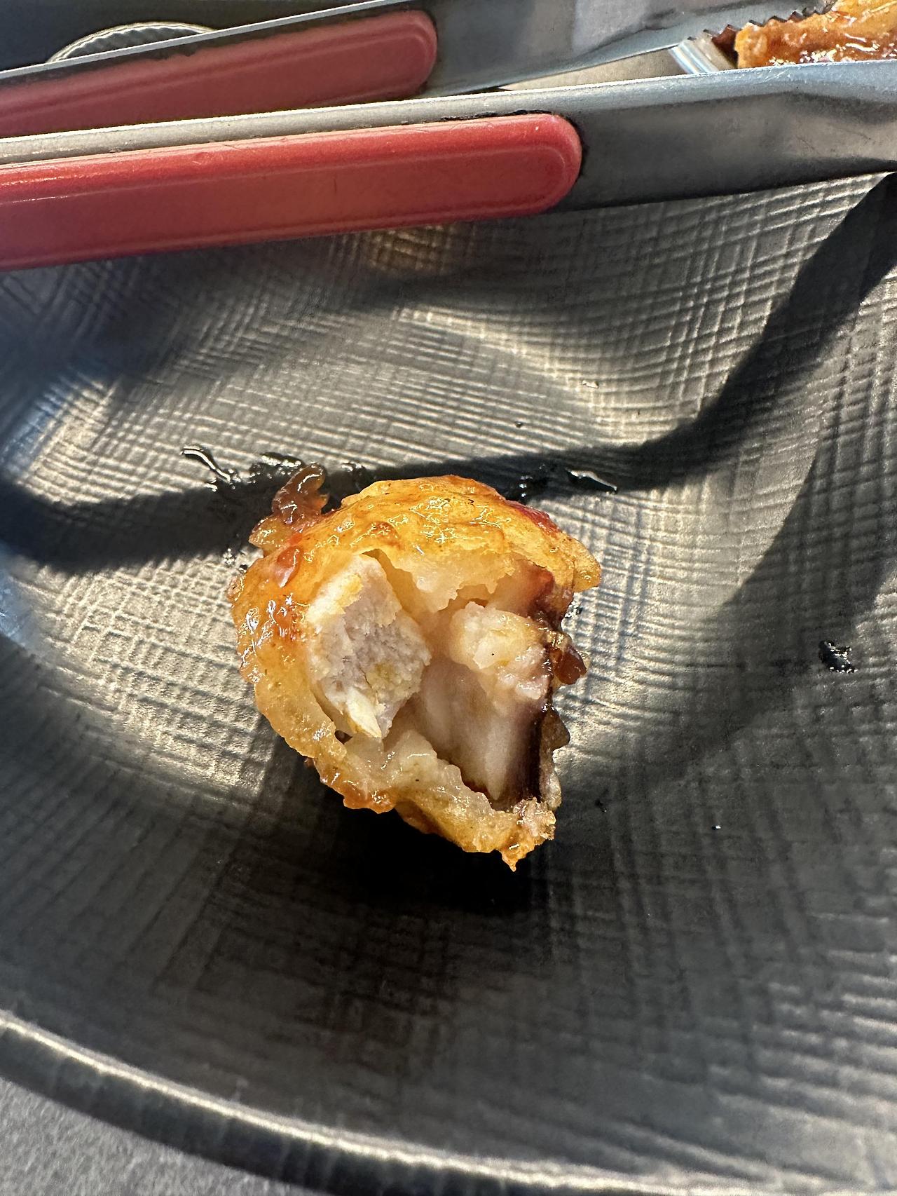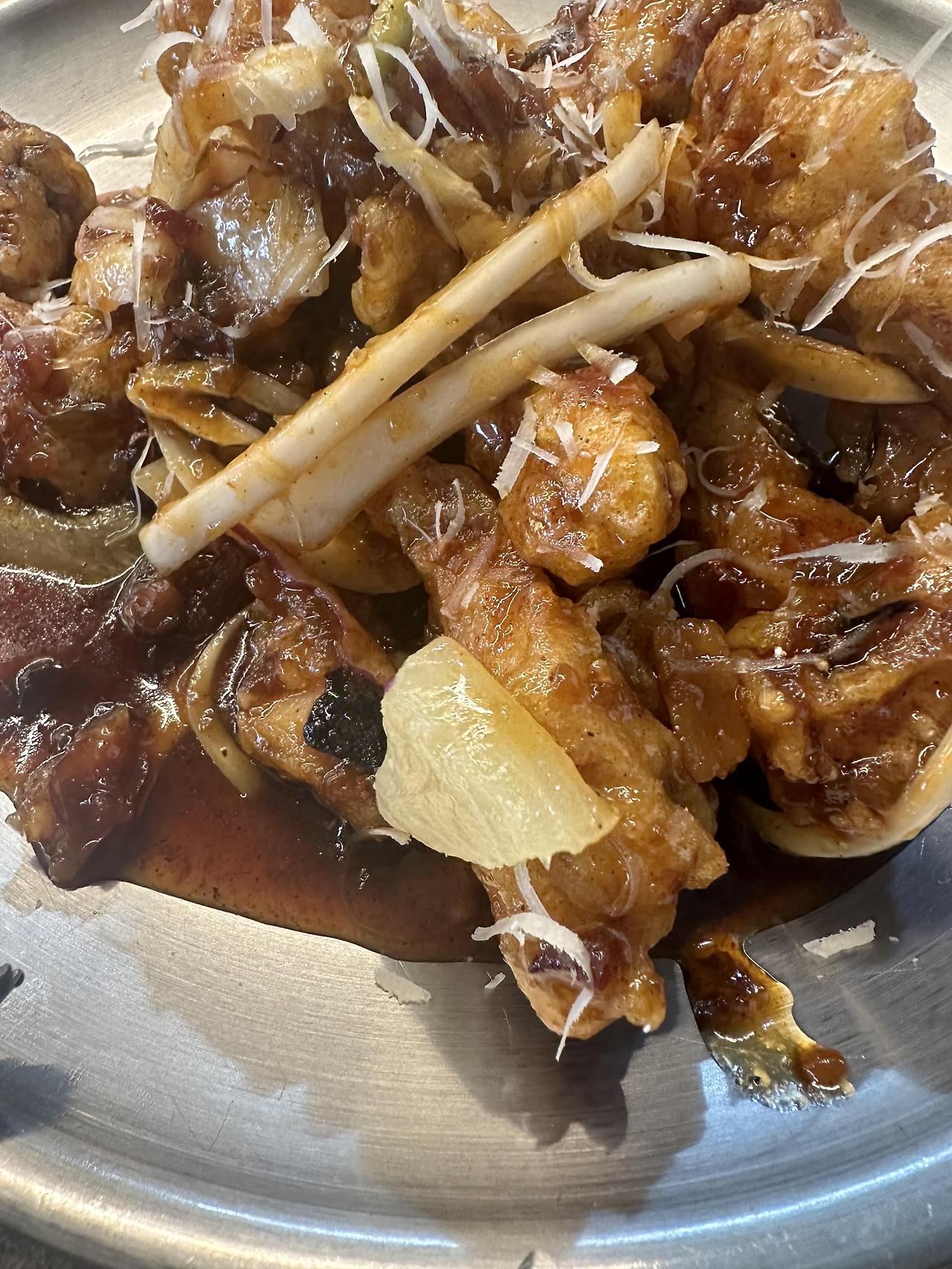 겉으로 봤을 때는 어디에서나 먹어보는 일반 탕수육처럼 보였습니다. 지난 연말 여행 통영항 근처 심가네 해물짬봉 기억날까요? 그때는 찍먹이라 양념이 묻지않은 탕수육 고기였는데요. 그때먹었던 탕수육 양념보다는 더 진하고 달다는 느낌이 보기만 해도 강하게 느껴졌습니다. 실제로 먹엇을 때 더 달고 맛있었습니다. 그리고 먹다보니 정말 문어가 들어있었습니다.