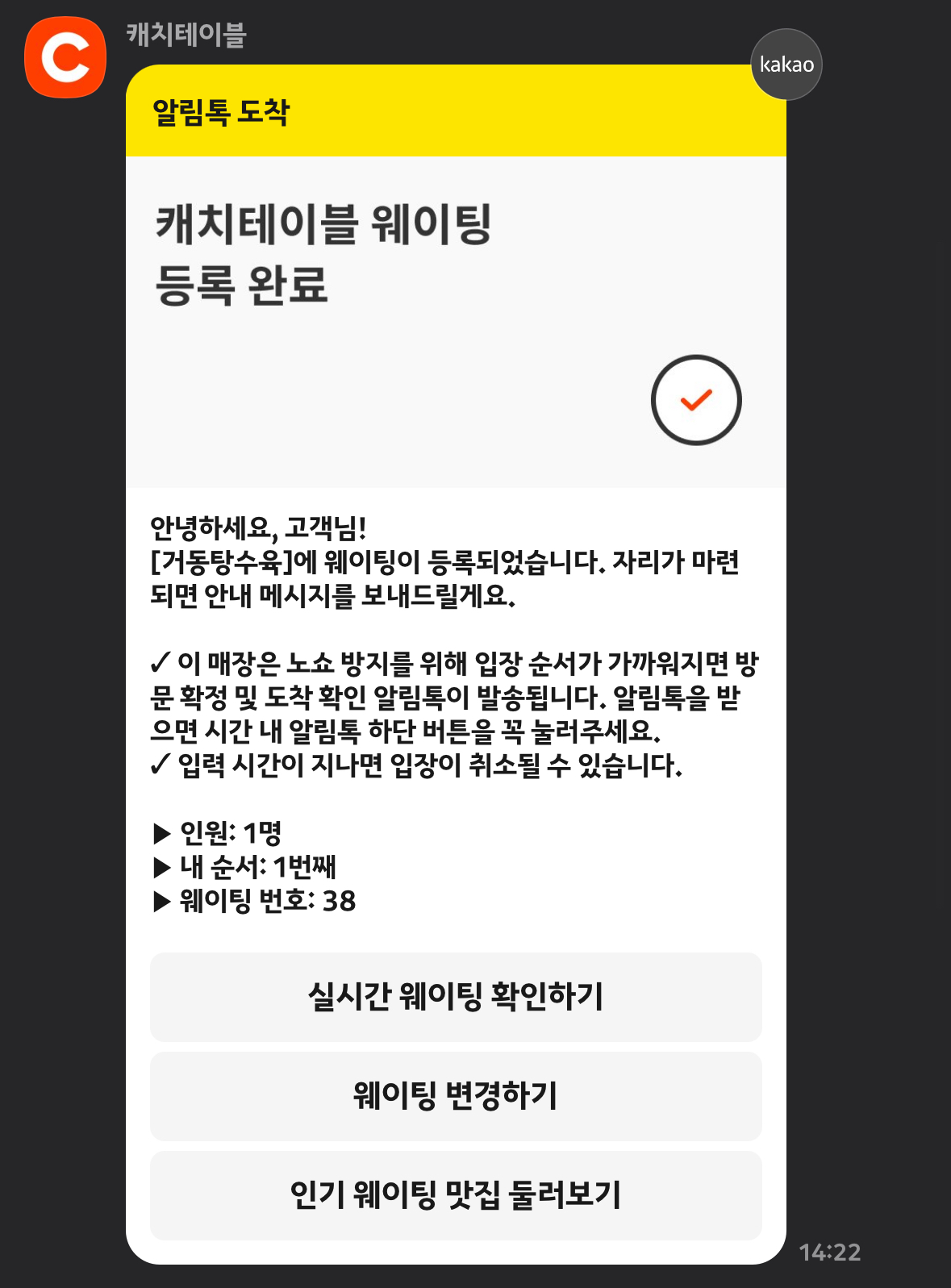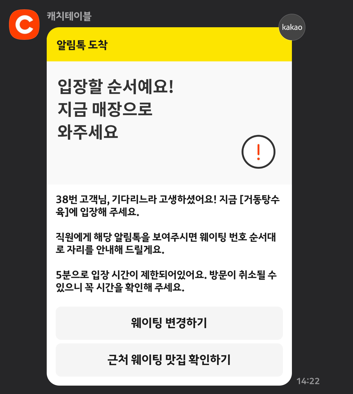 거동탕수육 앞에 키오스크를 통해 주문을 하면 핸드폰 카카오톡으로 알림톡을 보내줍니다. 그리고 입장이 가능해지면 알림톡으로 입장해달라고 받을 수 있습니다. 요즘은 어딜 가나 카카오톡 알림톡이 정말 유용하게 쓰이고 있습니다. 개발자로 일하고 있는 저도 고객들에게 알림톡을 보내는 경우가 많은데요. 문자 메세지는 이제는 잘 안보지만 카카오톡은 국민메신저라고 불릴만큼 안쓰는 사람이 없고 카카오톡 하나만으로 모든게 해결되다보니 알림톡을 안쓸수는 없는 것 같습니다. 그러나 핸드폰에서 알림톡 자체를 거부하거나 끊어놓을 수 있기 때문에 알림톡을 못보는 경우에는 매장에서 큰 불편이 있을 수 있을 것 같습니다.