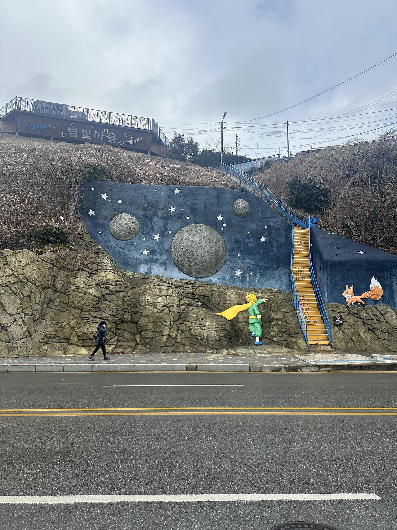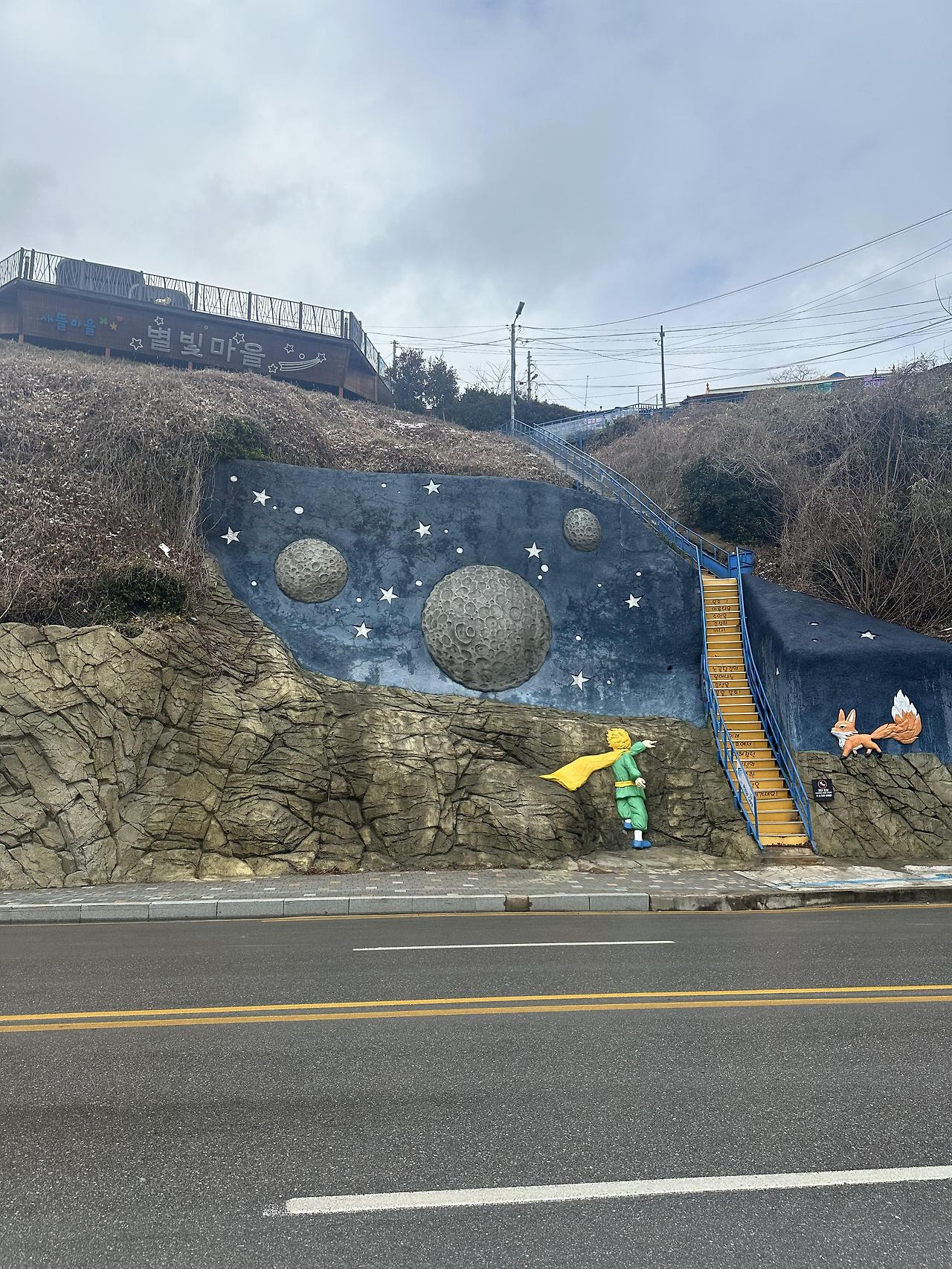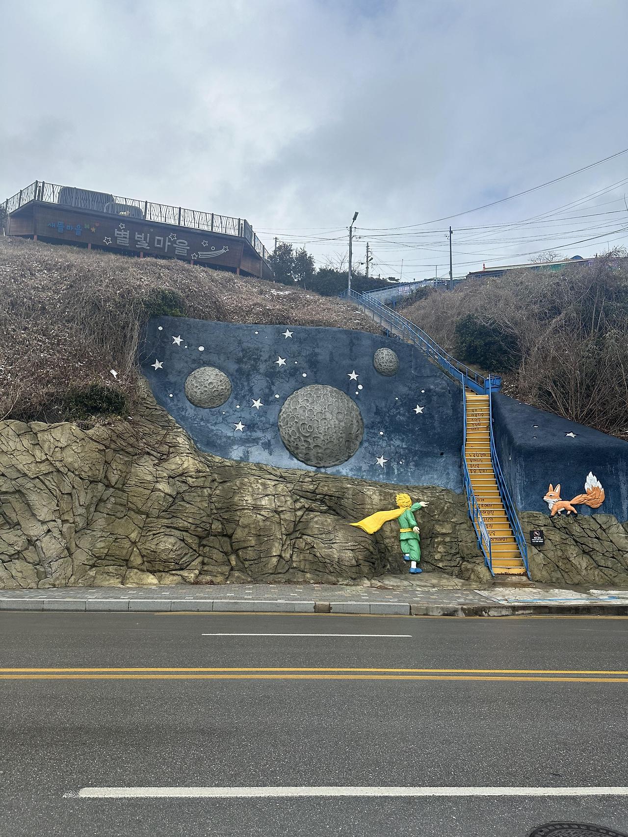 묵호항을 지나 논골담길 가는 길에는 별빛마을이라는 언덕을 발견 할 수 있습니다. 그리고 바위에에는 어린왕자 벽화가 그러져있는 것을 볼 수 있습니다. 묵호 뿐만 아니라 언덕위에 있는 달동네 마을은 벽화가 그러져있는 것을 볼 수 있습니다. 달동네라기보다는 벽화마을 이라고 많이 부릅니다. 대표적으로 묵호 외에도 퉁영 서피랑 마을과 동피랑 마을, 부산 남포동에 감천동 문화마을이 있습니다. 그 외에 서울에도 낙산공원과 홍제동 개미마을에서도 볼 수 있습니다.