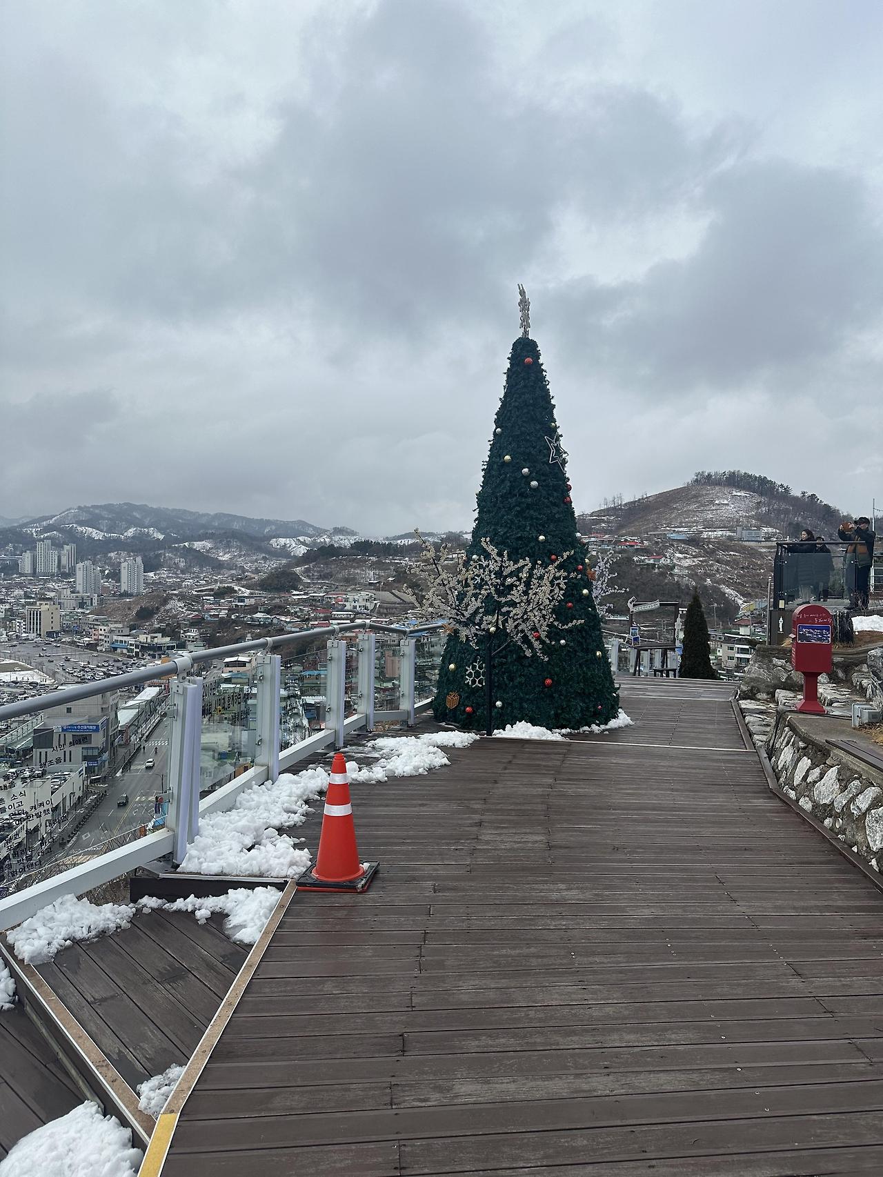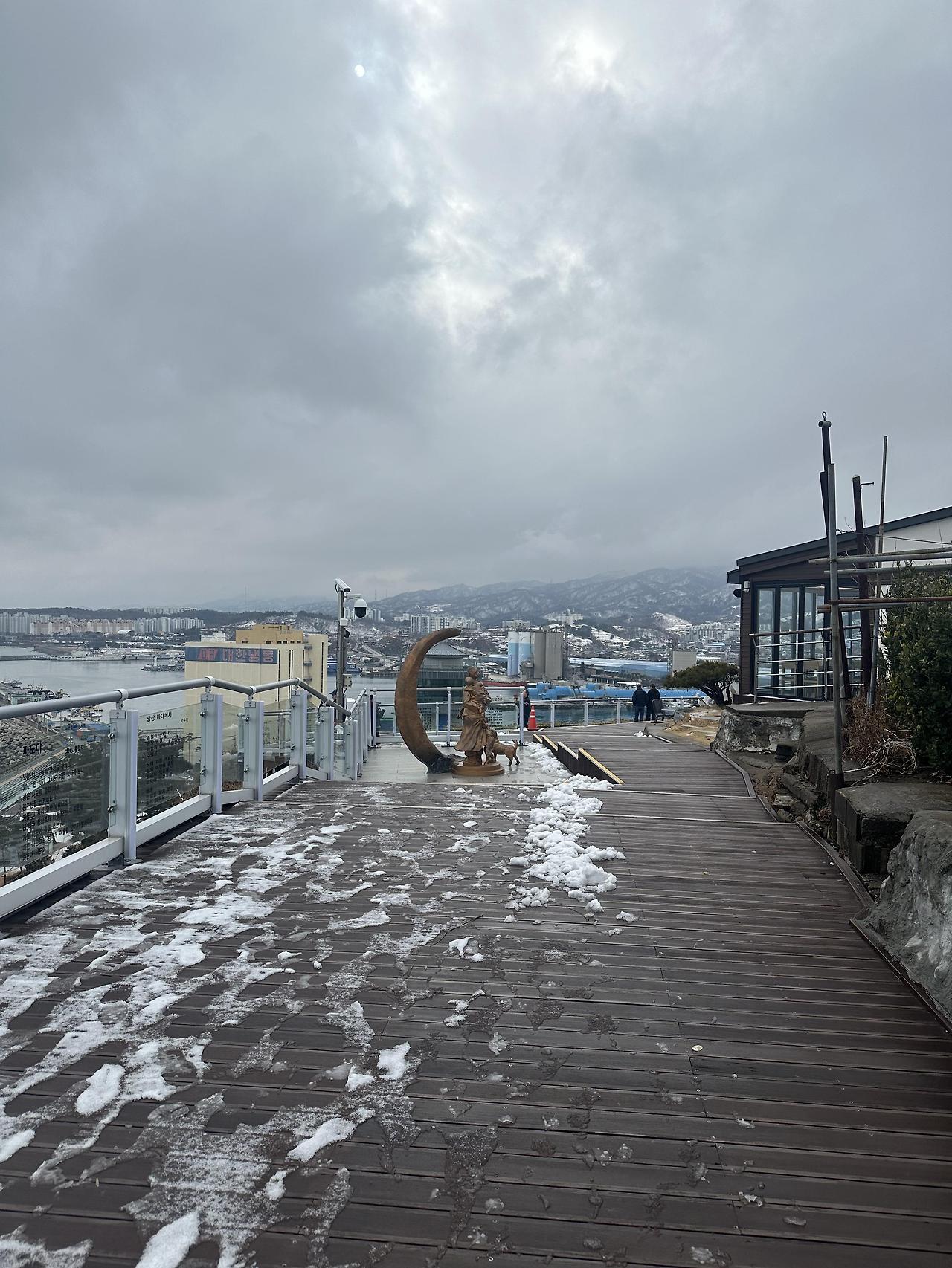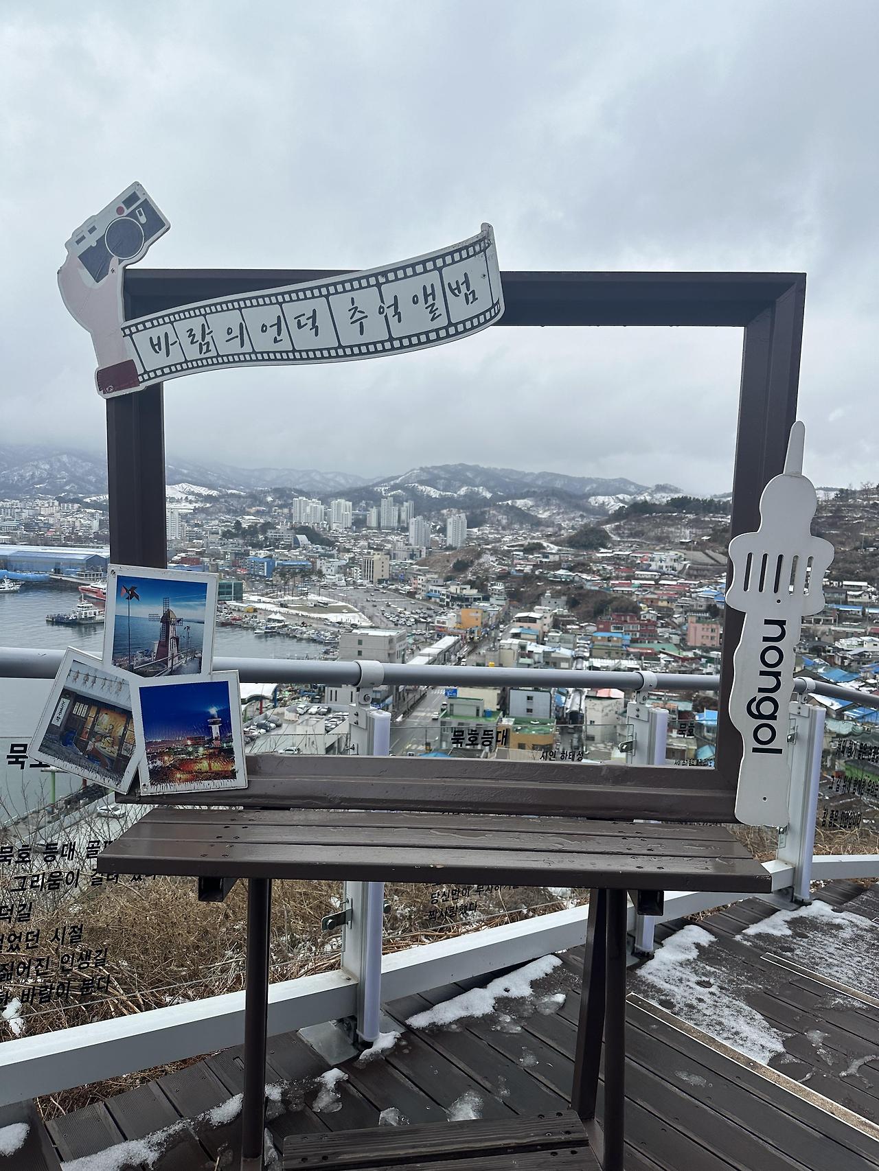 103LAB 게스트하우스에 캐리어만 맡긴채 금방 나왔습니다. 103LAB게스트하우스에서 몇발자국만 걸어올라가면 묵호 등대와 바람의 언덕이 나와요. 제가 있는 곳은 바람의 언덕이라는 곳인데요. 이 곳 바람의 언덕에서는 묵호항과 묵호시내 그리고 동해바다가 넓게 보입니다. 눈이 와서 그런지 설산이 묵호를 더 멋지게 보여주고 있습니다.