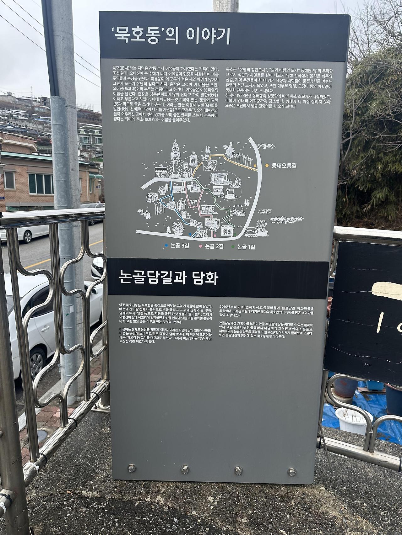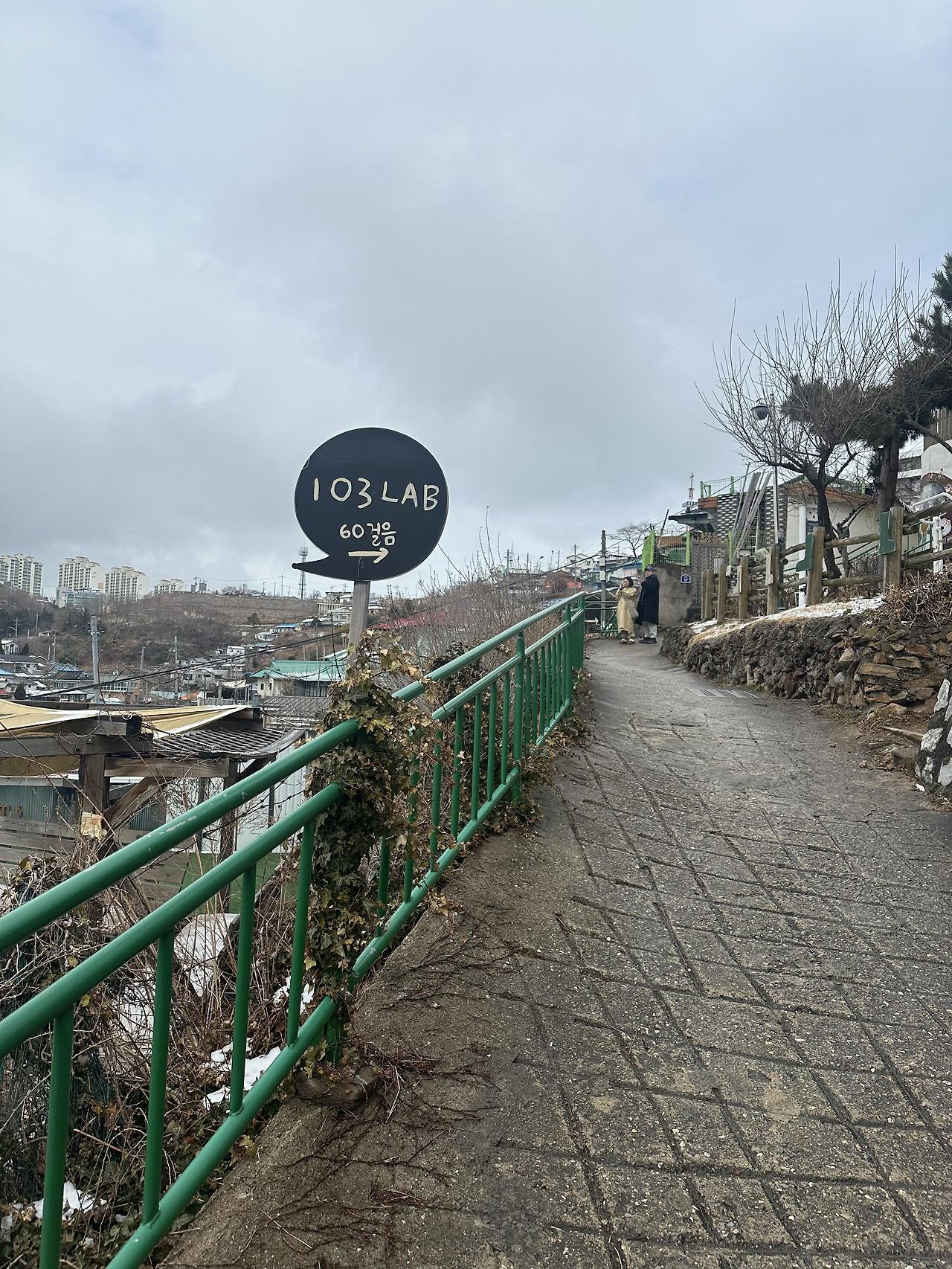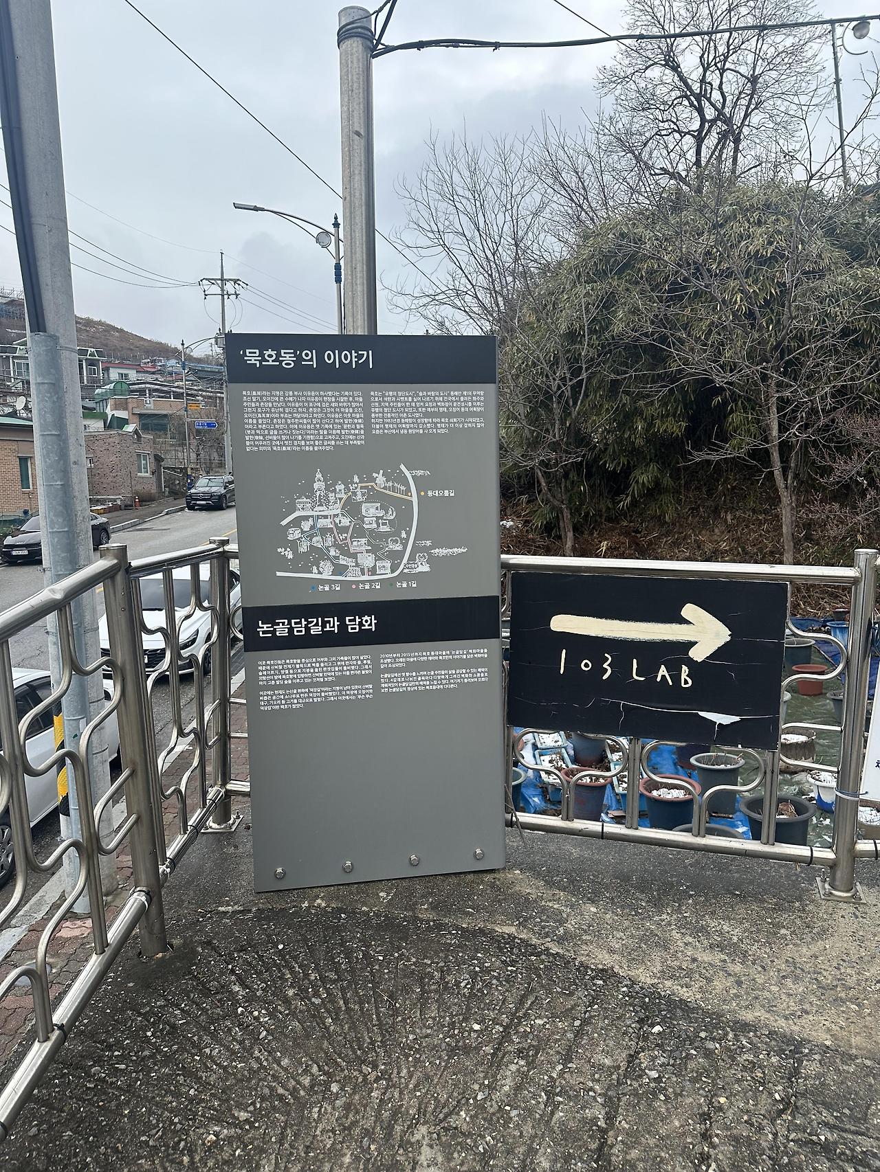 논골담길 언덕을 오르기 시작전에는 논골담길 유래에 대해서 보여주고 있습니다. 그리고 103LAB 게스트하우스 찾는 여행객들이 많은지 힘든 언덕을 올라가는 동안 103LAB 게스트하우스가 얼마나 남았는지 보여주고 있었습니다. 겨울에 방문해서 그런지 논골담길 언덕을 오르면 눈덮인 묵호의 모습을 볼 수 있었습니다.