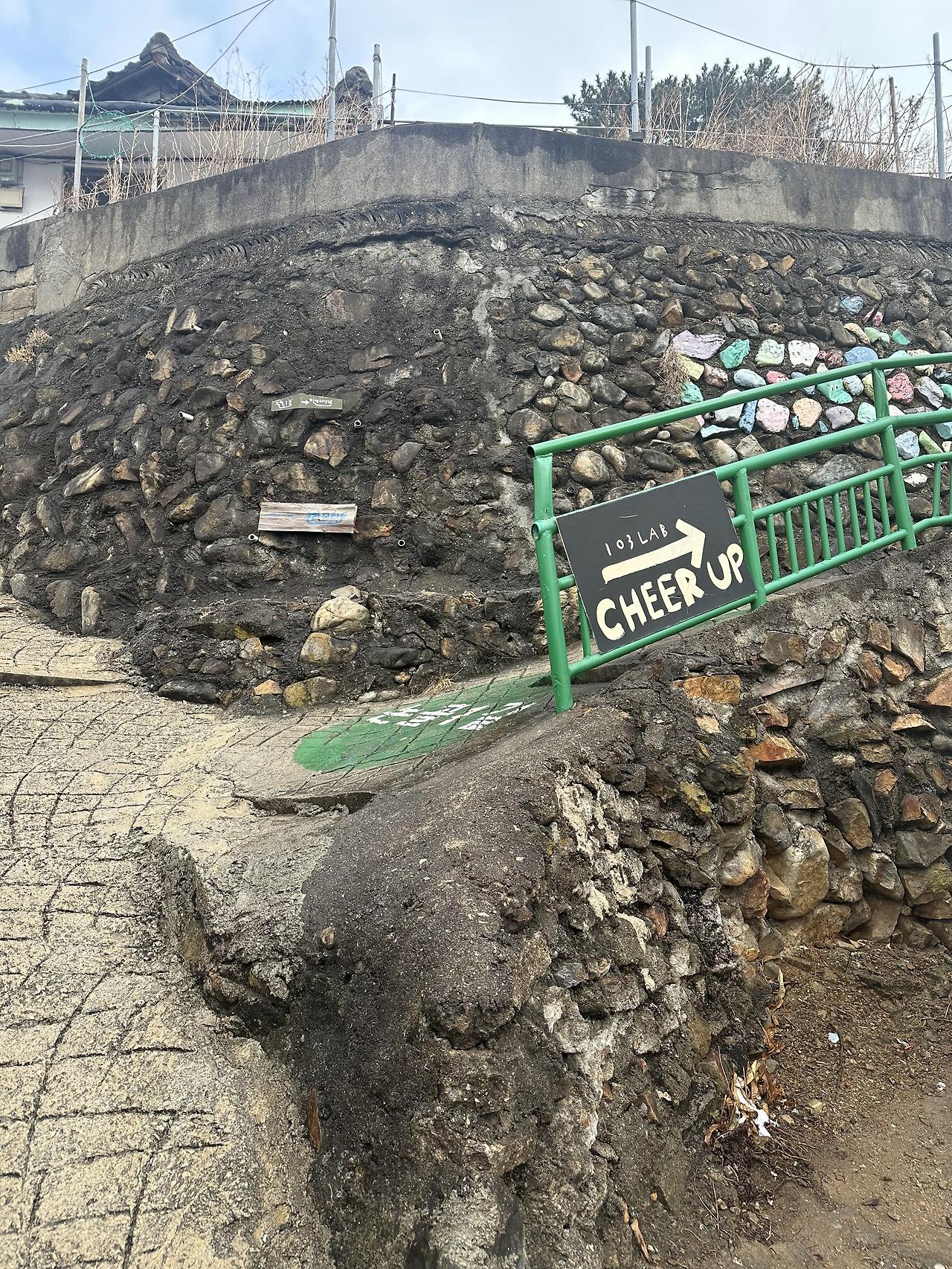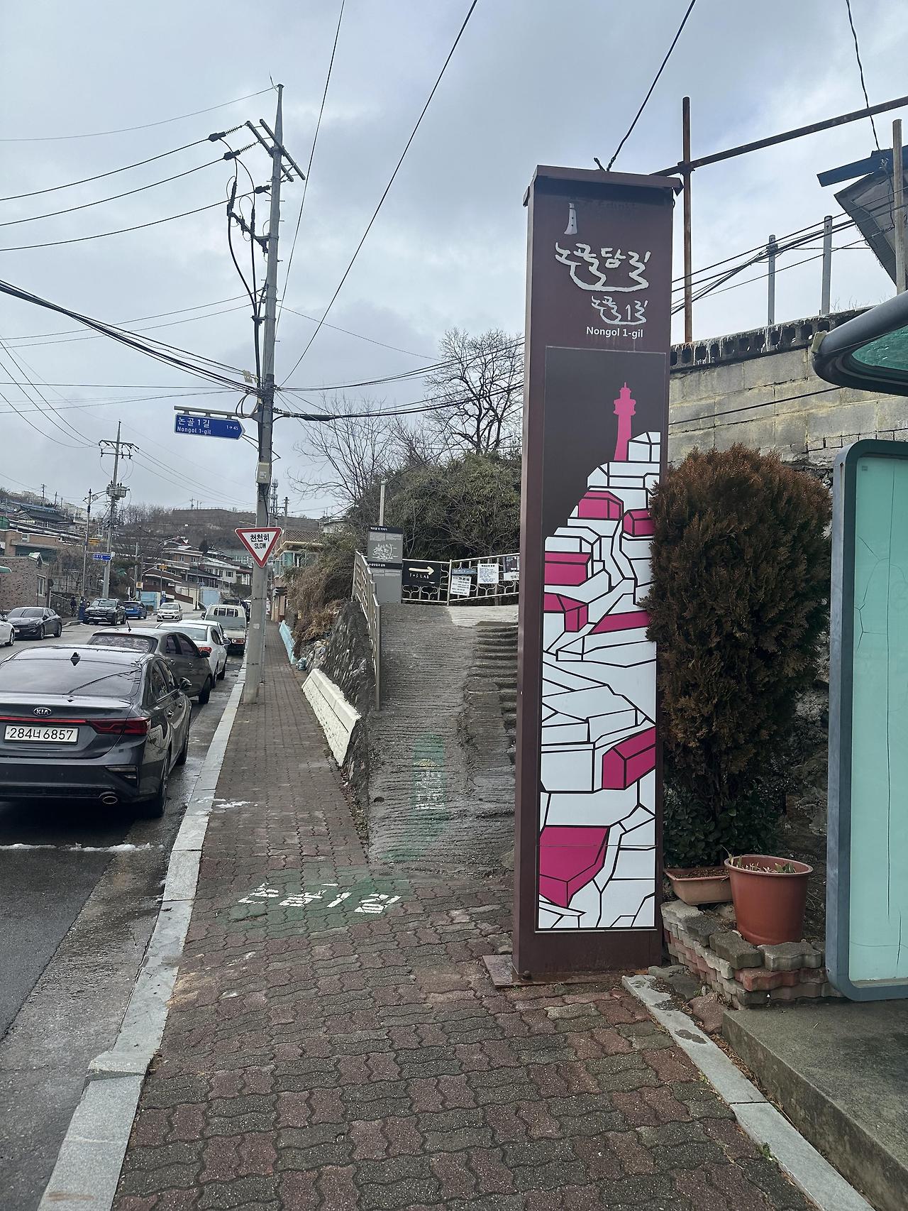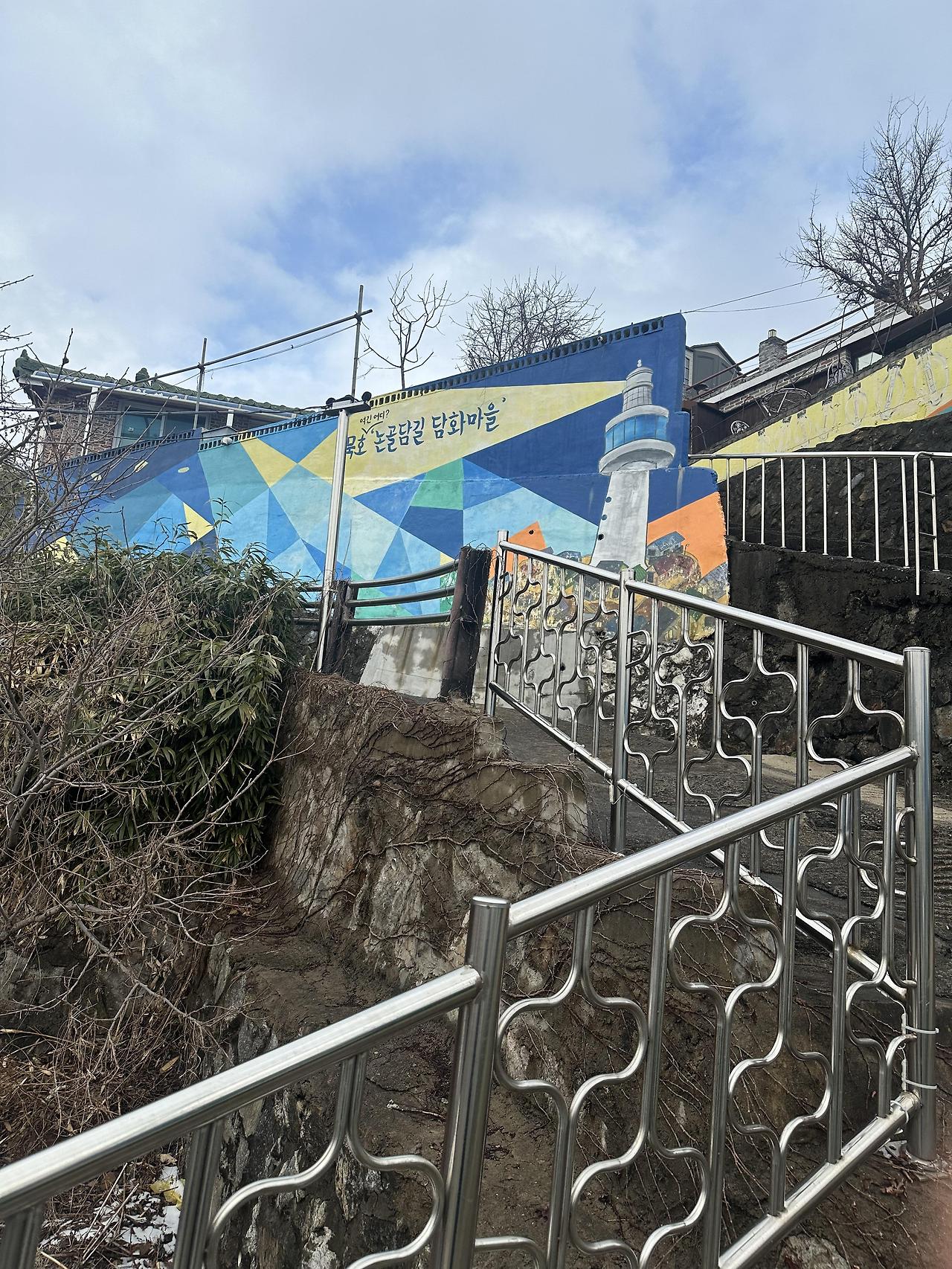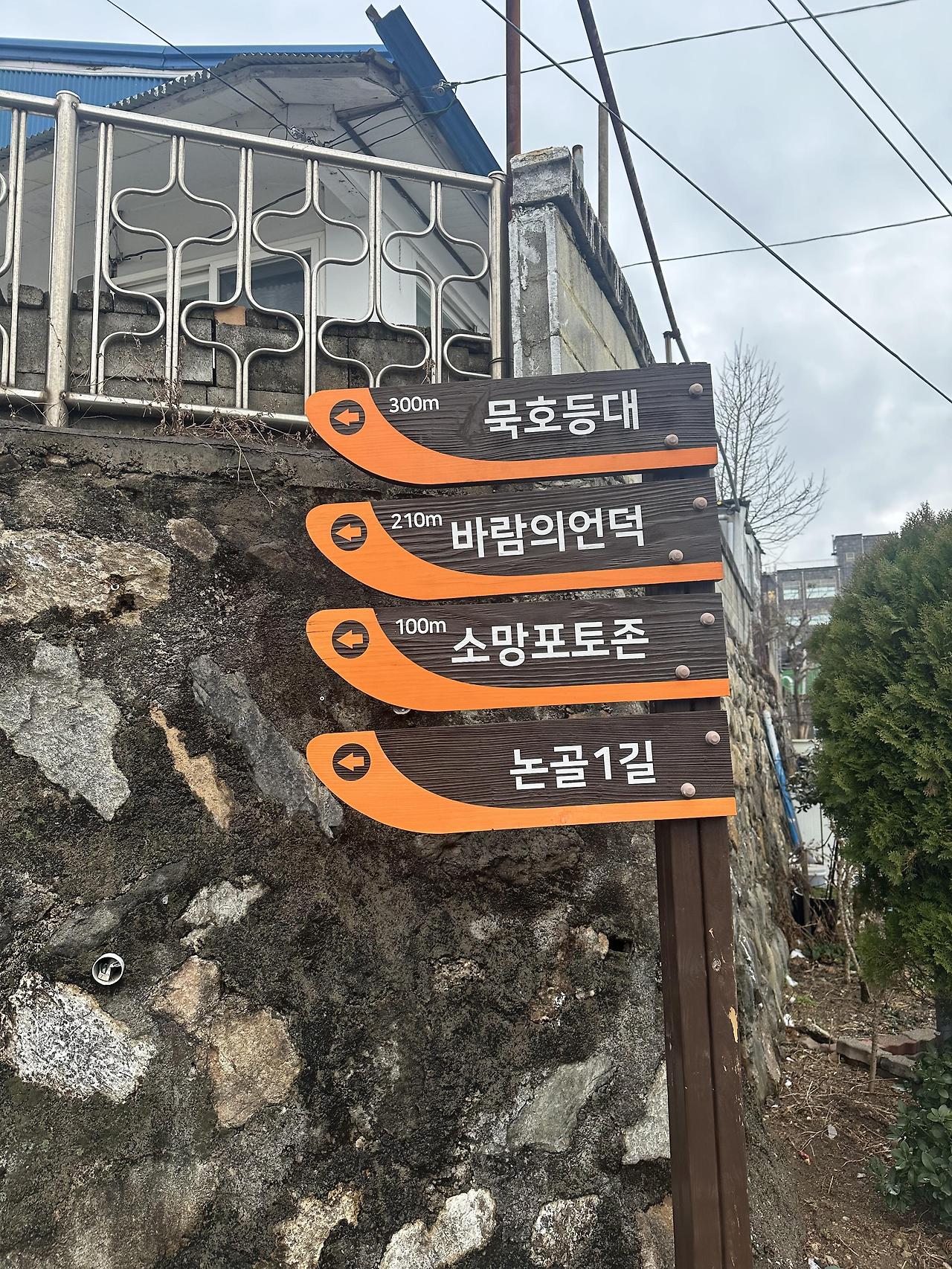 논골담길 언덕을 오르기 시작전에는 논골담길 유래에 대해서 보여주고 있습니다. 그리고 103LAB 게스트하우스 찾는 여행객들이 많은지 힘든 언덕을 올라가는 동안 103LAB 게스트하우스가 얼마나 남았는지 보여주고 있었습니다. 겨울에 방문해서 그런지 논골담길 언덕을 오르면 눈덮인 묵호의 모습을 볼 수 있었습니다.