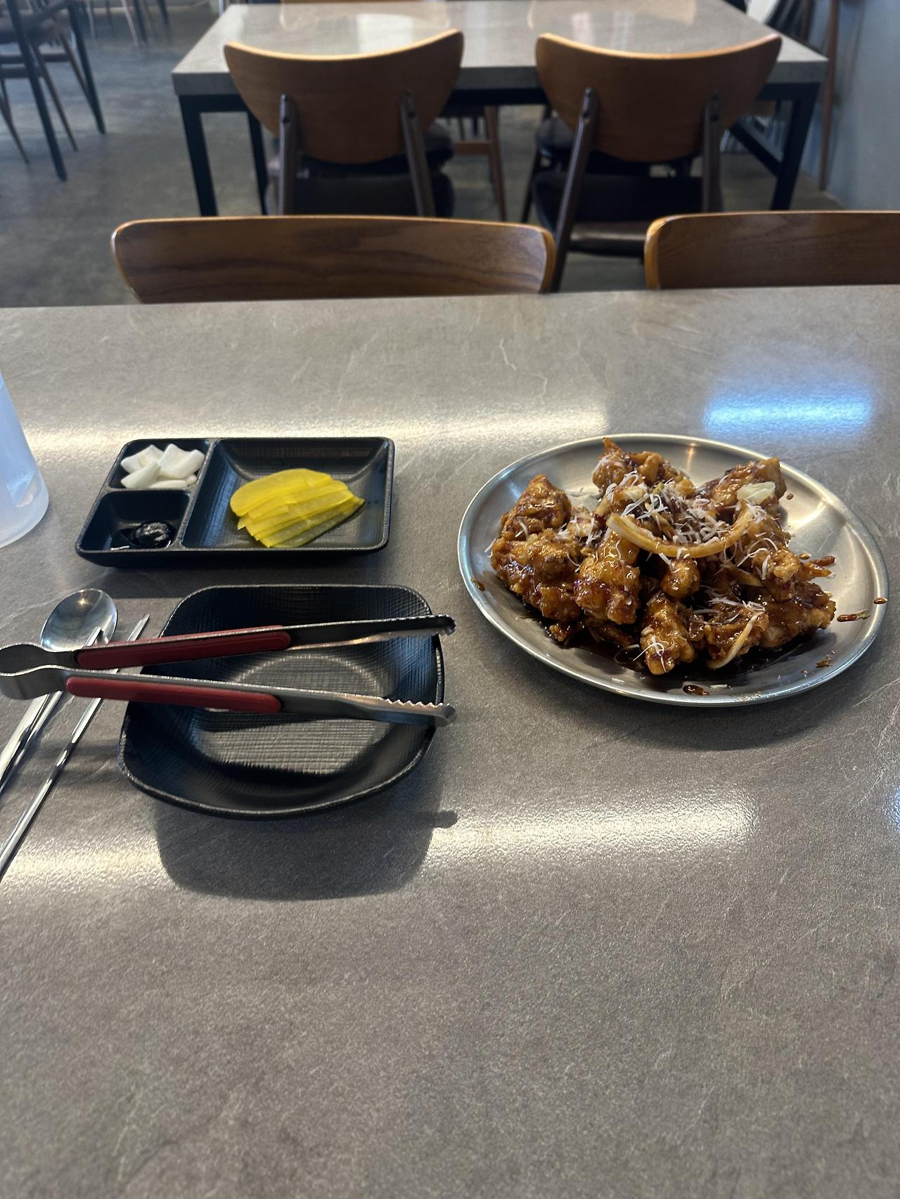 저는 거동탕수육 매콤한 맛 S사이즈를 시켰습니다. 반찬으로는 단무지와 양파 그리고 생수 한병정도였습니다. 오래 기다릴 줄 알았는데 5분도 채 걸리지 않아 나왔습니다.