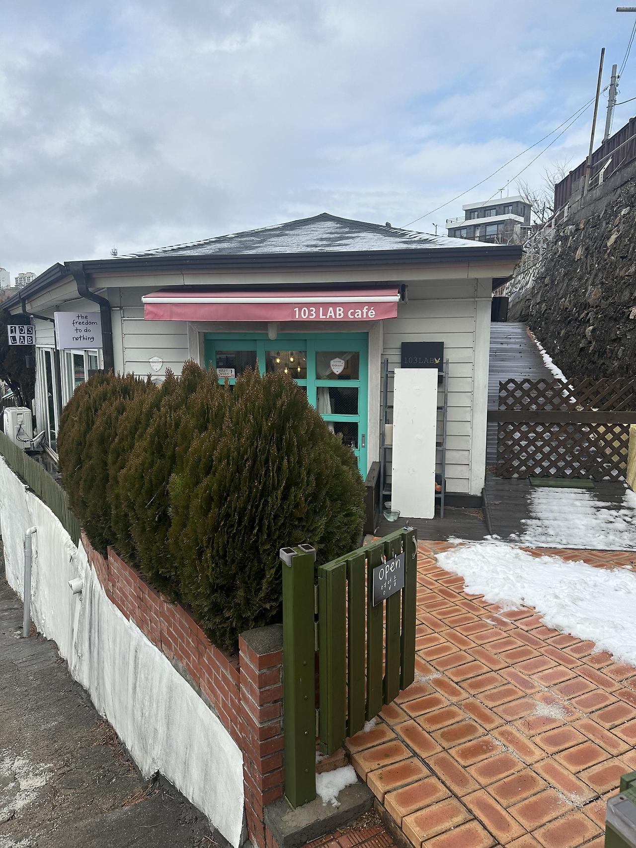 논골담길 언덕을 10분정도 걸어 올라가면 작은 집을 발견할 수 있습니다. 드디어 103LAB 게스트하우스에 도착한 것입니다. 저는 도착 후 입실시간이 되지 않아 캐리어만 맡기고 나오게 되었습니다. 103LAB 게스트하우스는 정말 조용하게 힐링할 수 있는 게스트하우스입니다. 뚜벅이 여행을 혼자 하는 저는 조용하고 힐링할 수 있는 숙소를 자주 찾는데요. 작년 상반기와 하반기 연말에 갔던 통영에 슬로비게스트와 보편적스테이처럼 조용하고 힐링하기 좋았습니다. 보통 게스트하우스는 파티를 통해 친목도 다지는데요. 103LAB게스트하우스는 처음 등장과 함께 조용한 묵호에 어울리는듯 힐링 숙소라고도 말할 수 있습니다. 카페와 게스트하우스를 운영하고 있습니다. 다른 게스트하우스는 다르게 쉬러 오는 여행객들이 있기 때문에 사장님도 엄격한 입퇴실과 함께 숙박객 관리가 철저합니다. 내부 규칙을 지키지 않을 경우 다음 번 이용에 제한도 따르는 숙소입니다. 이후 후기에서 103LAB 게스트하우스의 장점에 대해 더 말씀드리겠지만 정말 조용한 숙소이기때문에 혼자 오는 여행객들에게는 최고입니다. 만약 연인과 친구와 함께 한다면 103LAB게스트하우스도 좋지만 논골담길에 다양한 숙소와 뷰를 자랑하는 곳도 많으니 여러곳을 알아보는 것도 추천드려요.