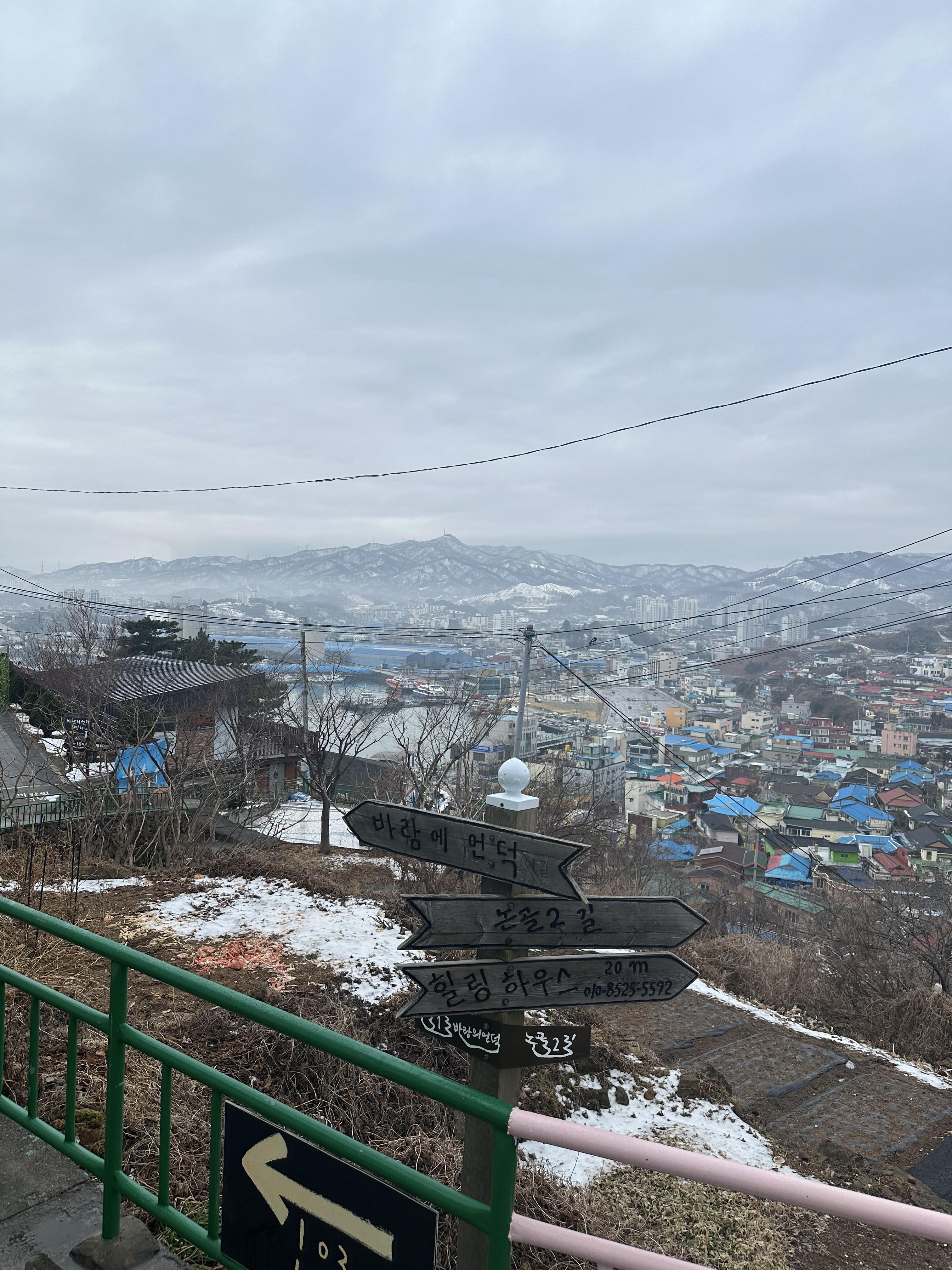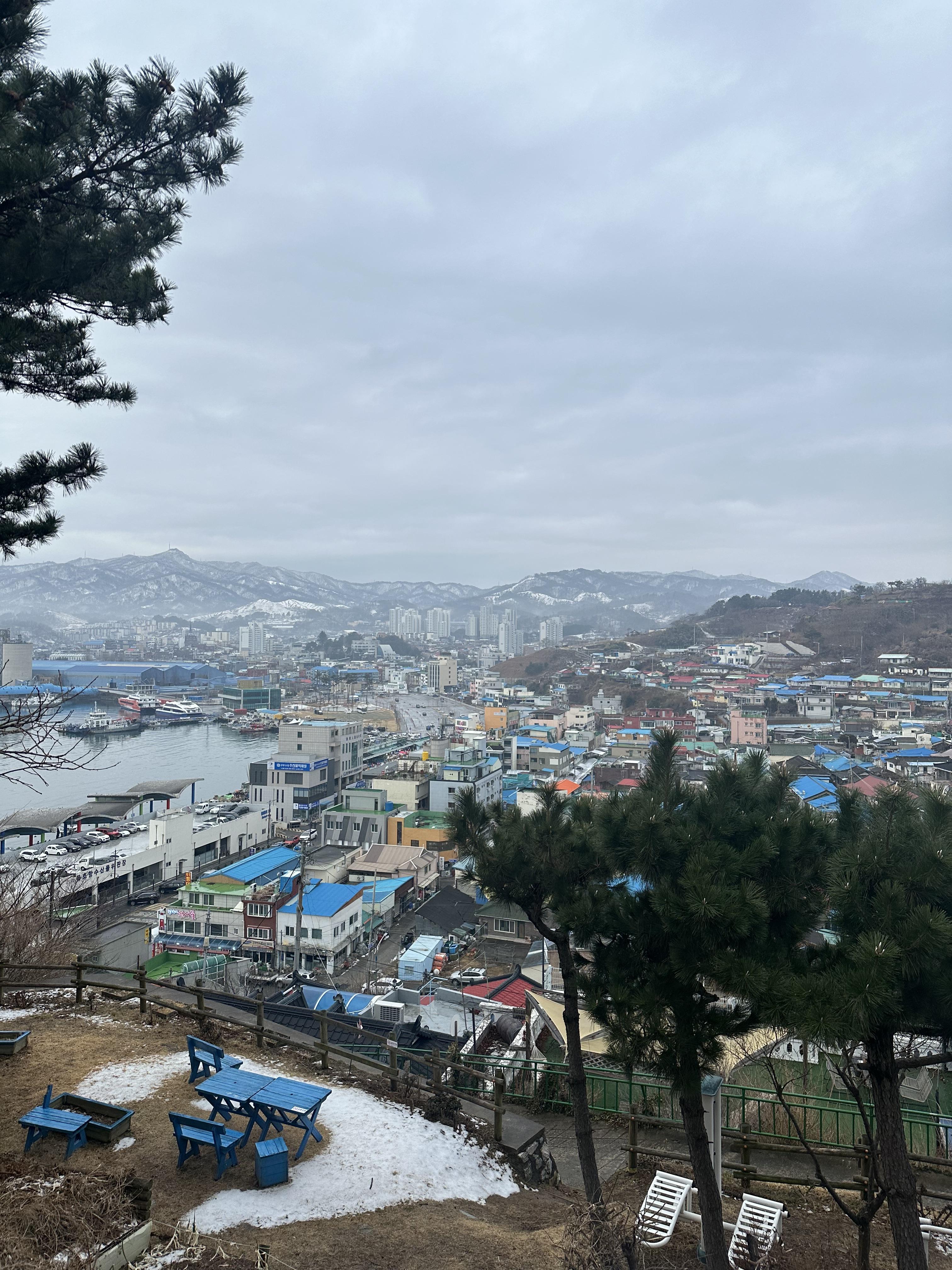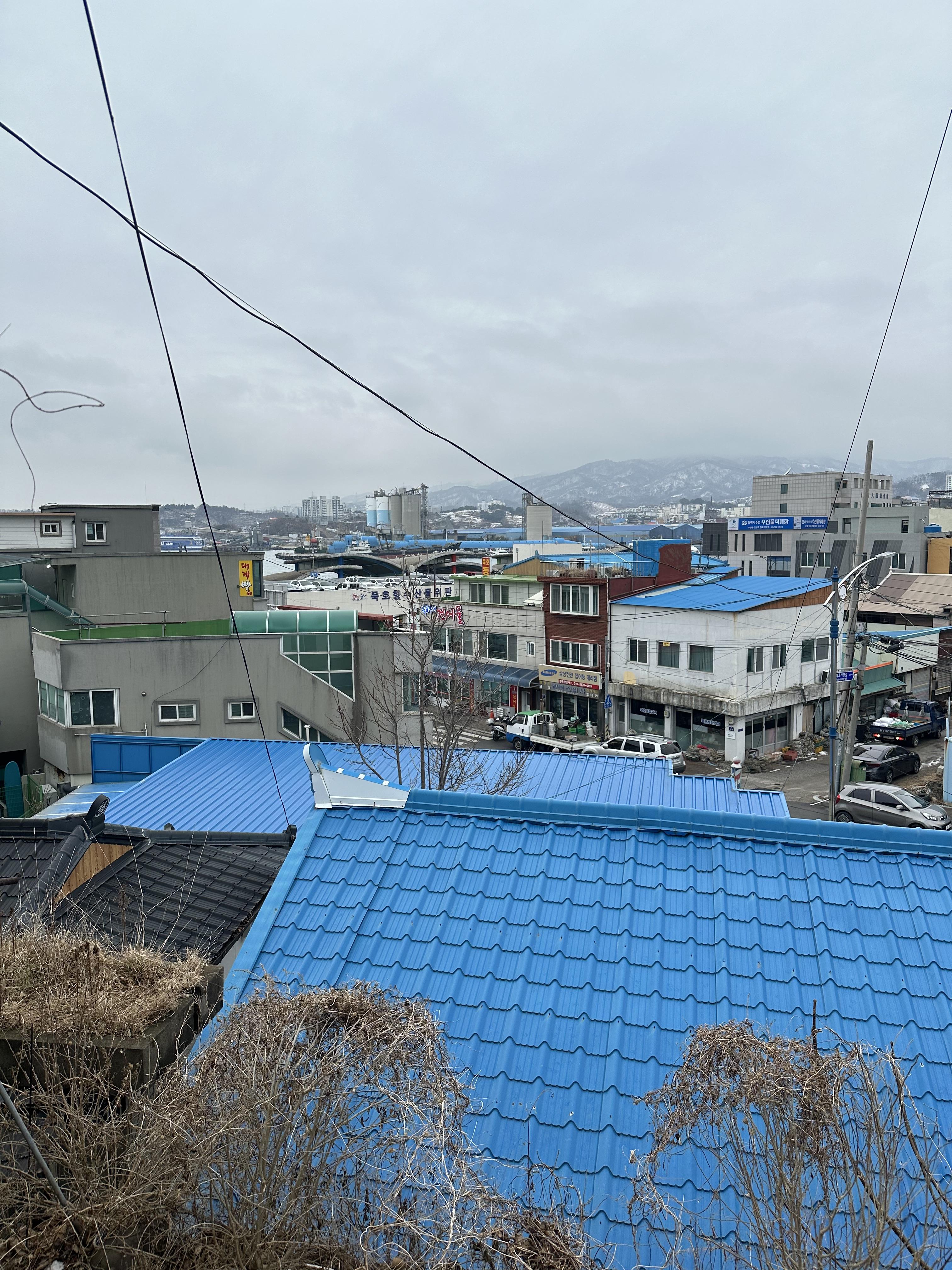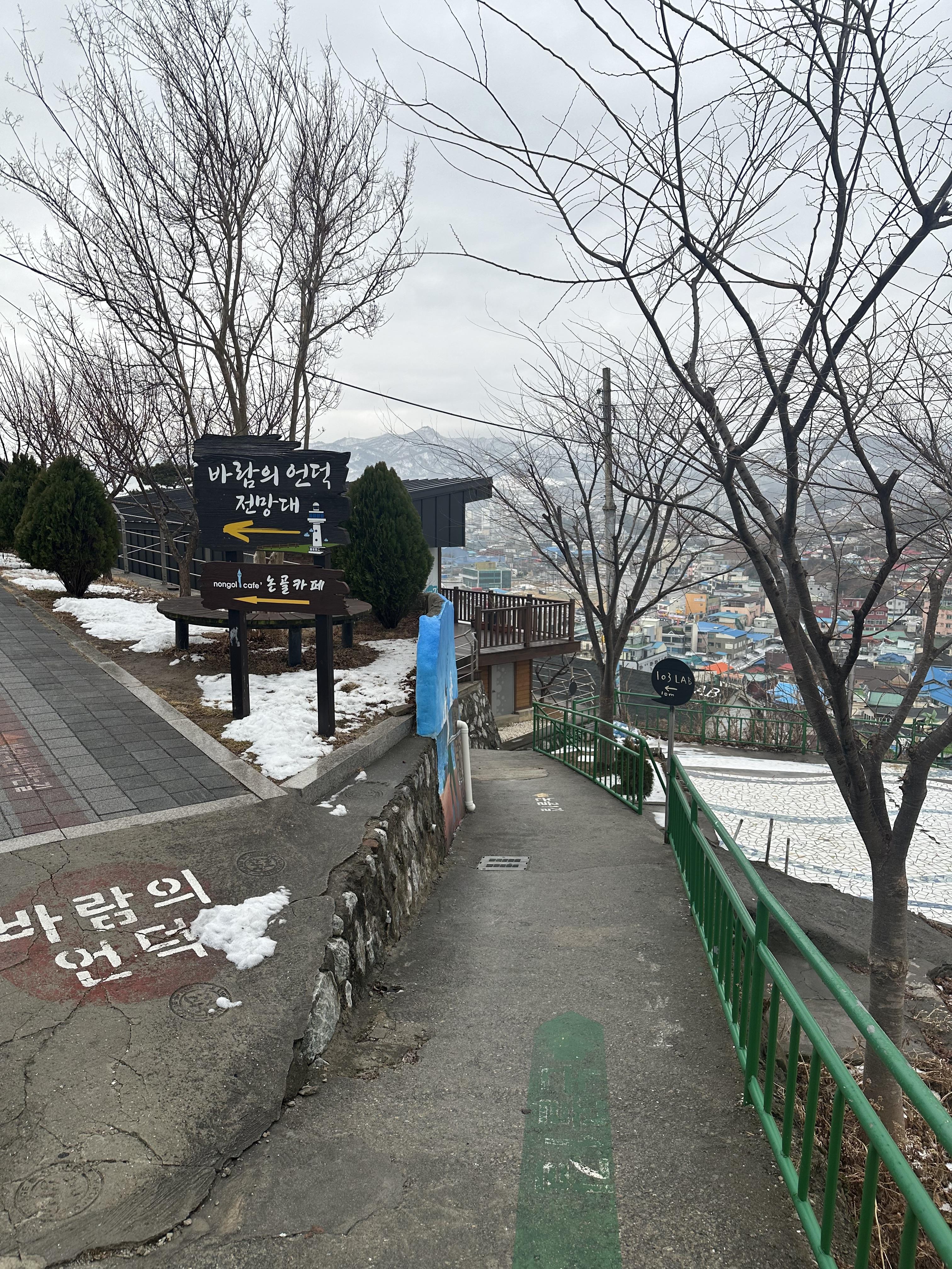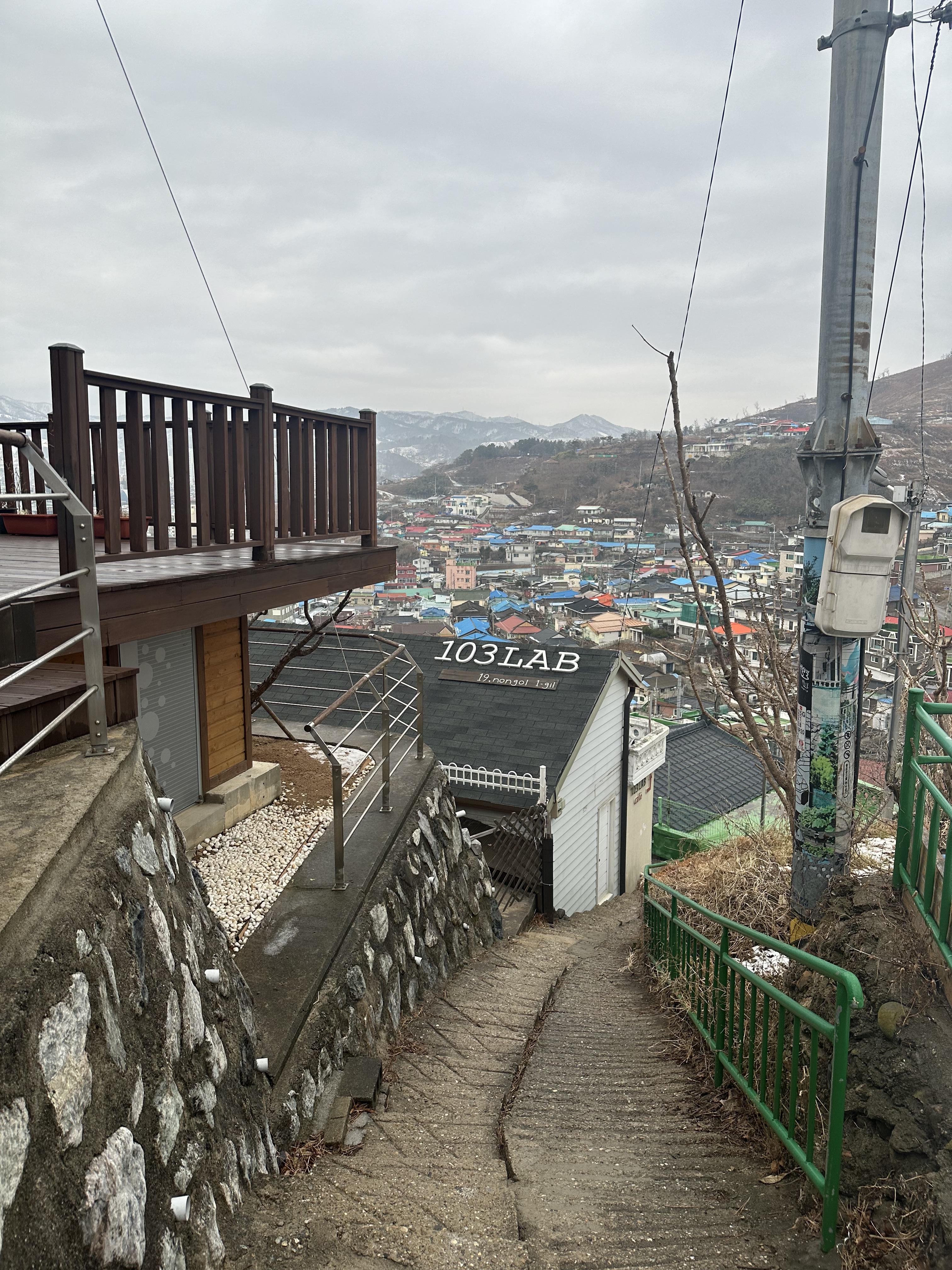 논골담길 벽화마을을 구경하고는 묵호 바람의언덕과는 반대방향으로 묵호 등대로 올라가서 반대편으로 해서 103LAB 게스트하우스로 돌아왔습니다. 겨울이라 그런지 멀리 보이는 산과 마을에는 눈이 쌓인 것을 볼 수 있었습니다. 그러나 최근에 지구온난화 등으로 수도권과 남해안에서는 눈이 많이 안오고 아쉽지만 이렇게 묵호에서 멋진 풍경을 보았습니다.103LAB 게스트하우스에서는 바람의 언덕가 묵호 등대는 서로 연결되어있어서 어느 방향으로 가든 갈 수 있었습니다.