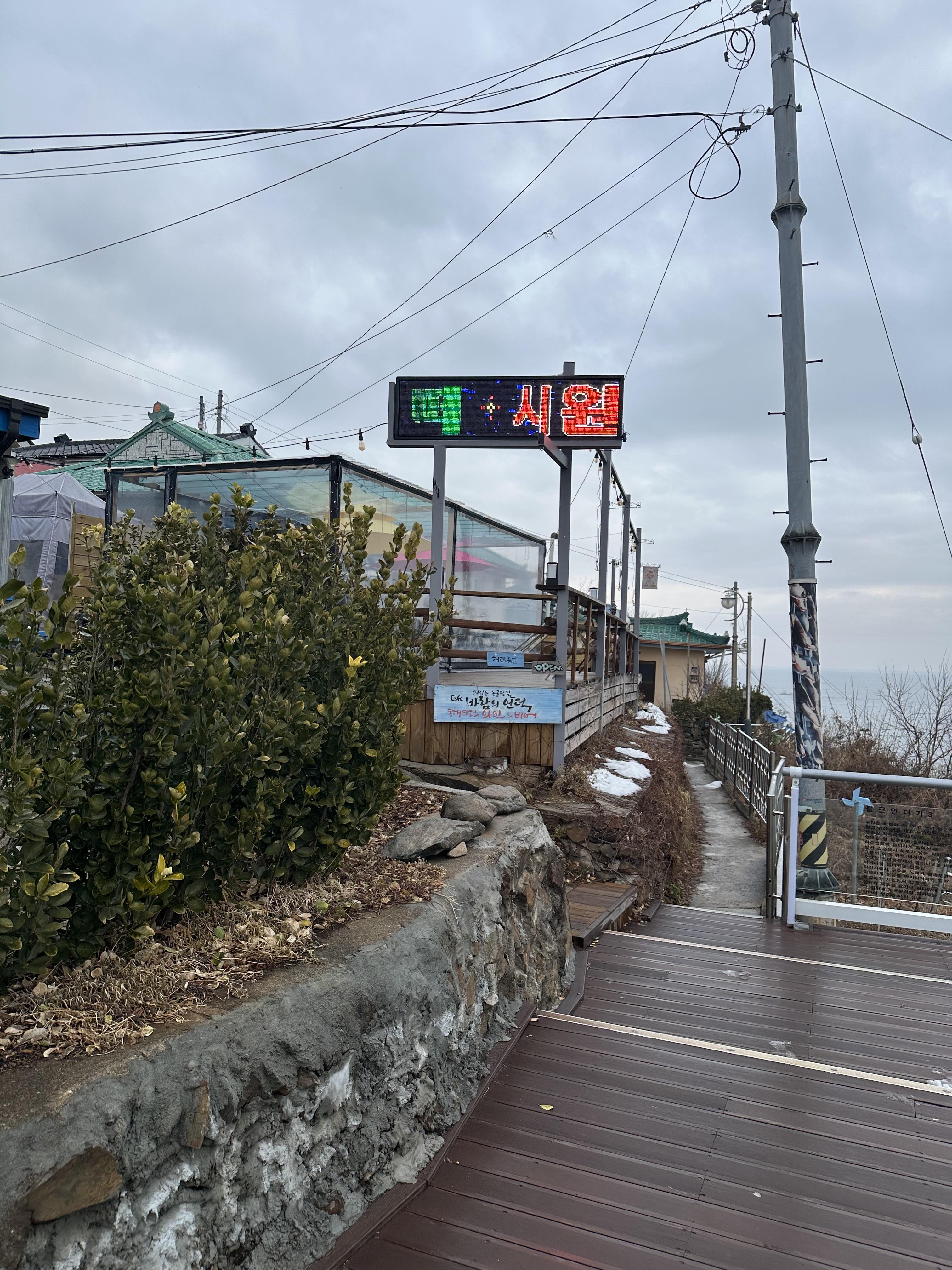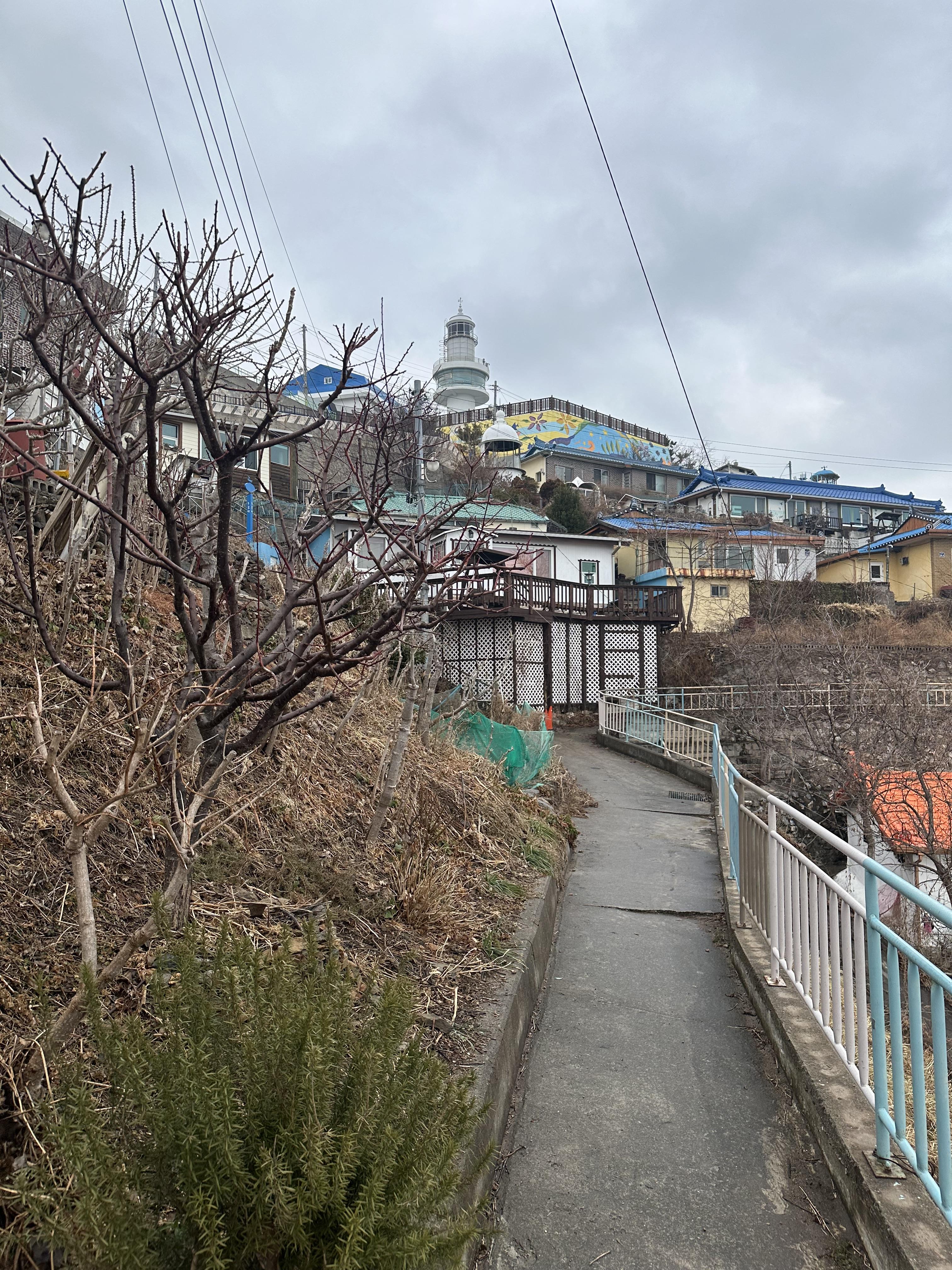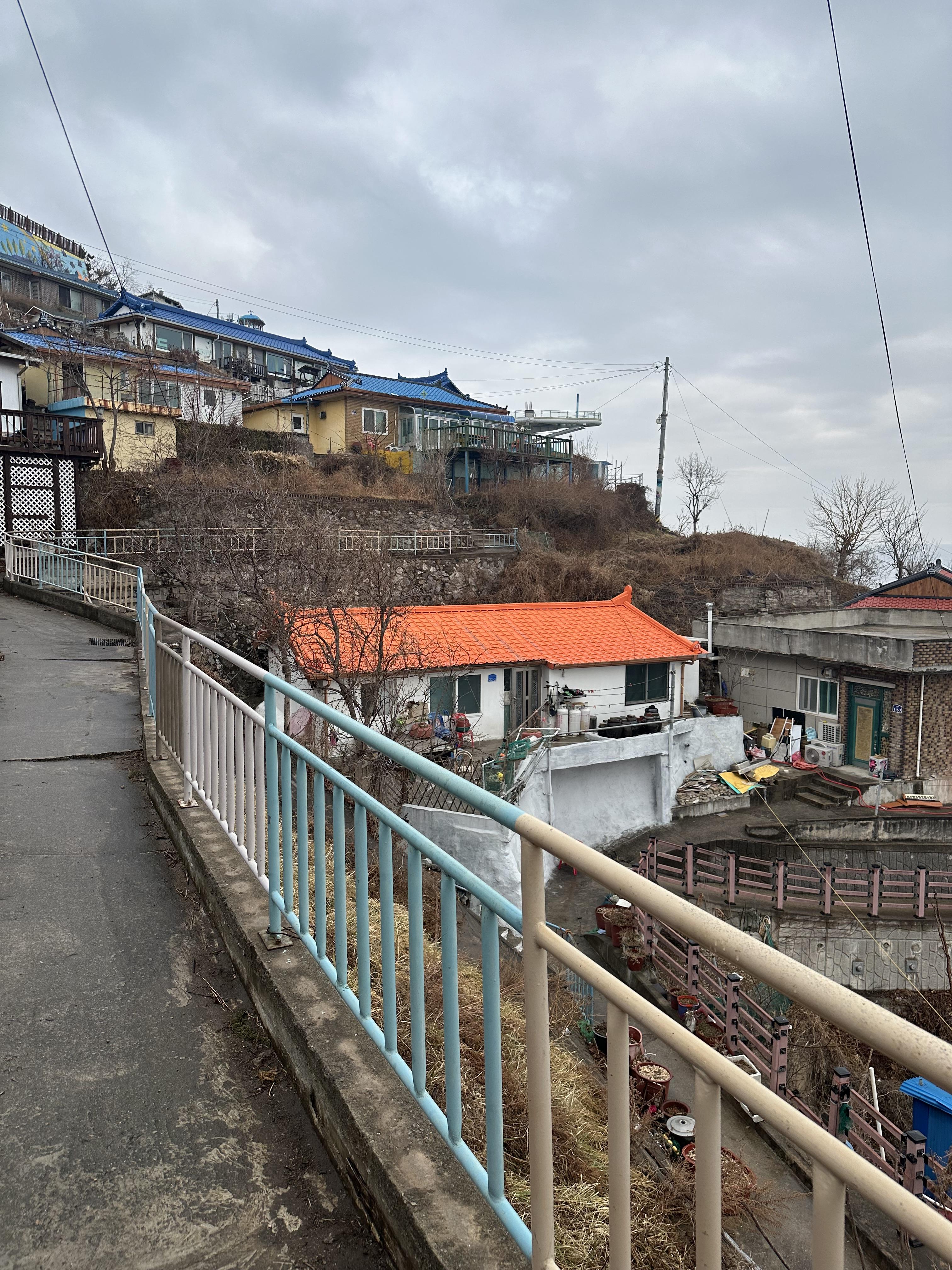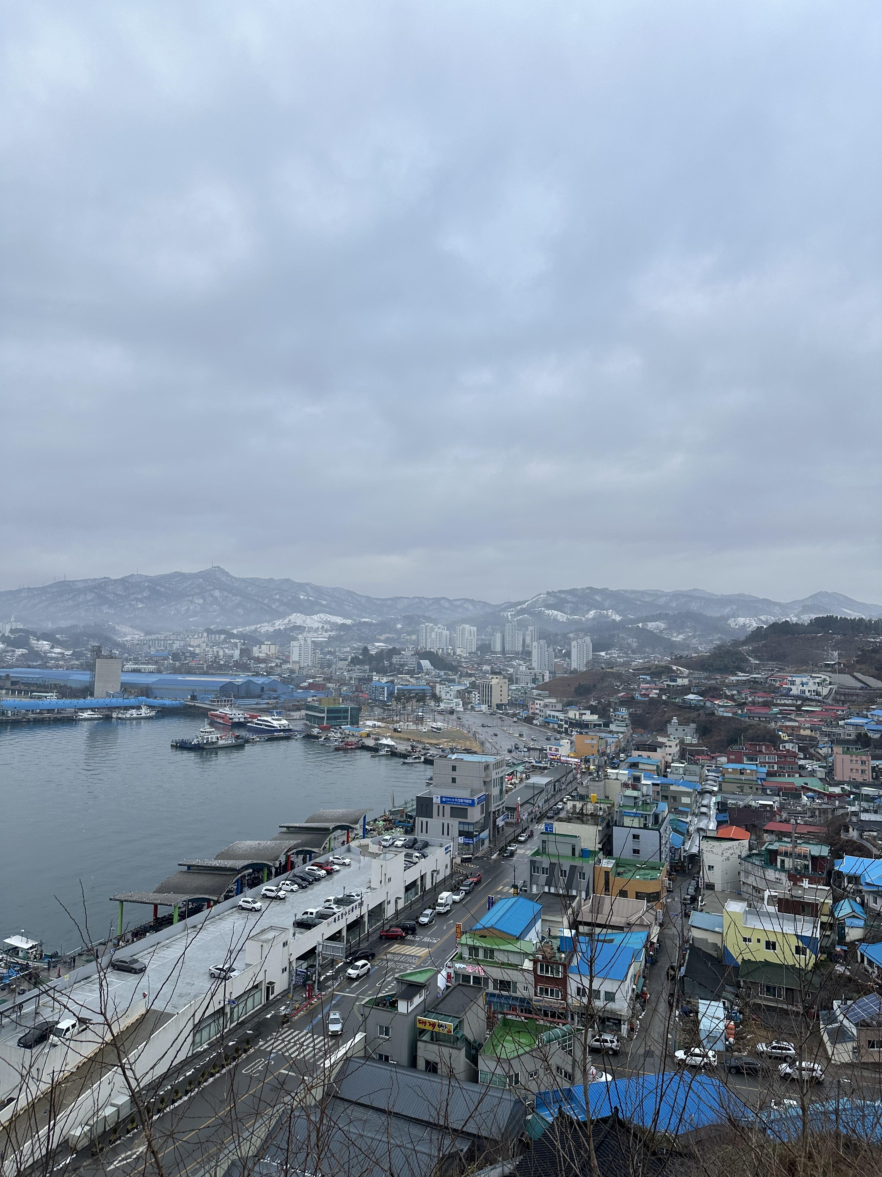 논골담길 벽화마을을 구경하고는 묵호 바람의언덕과는 반대방향으로 묵호 등대로 올라가서 반대편으로 해서 103LAB 게스트하우스로 돌아왔습니다. 겨울이라 그런지 멀리 보이는 산과 마을에는 눈이 쌓인 것을 볼 수 있었습니다. 그러나 최근에 지구온난화 등으로 수도권과 남해안에서는 눈이 많이 안오고 아쉽지만 이렇게 묵호에서 멋진 풍경을 보았습니다.103LAB 게스트하우스에서는 바람의 언덕가 묵호 등대는 서로 연결되어있어서 어느 방향으로 가든 갈 수 있었습니다.