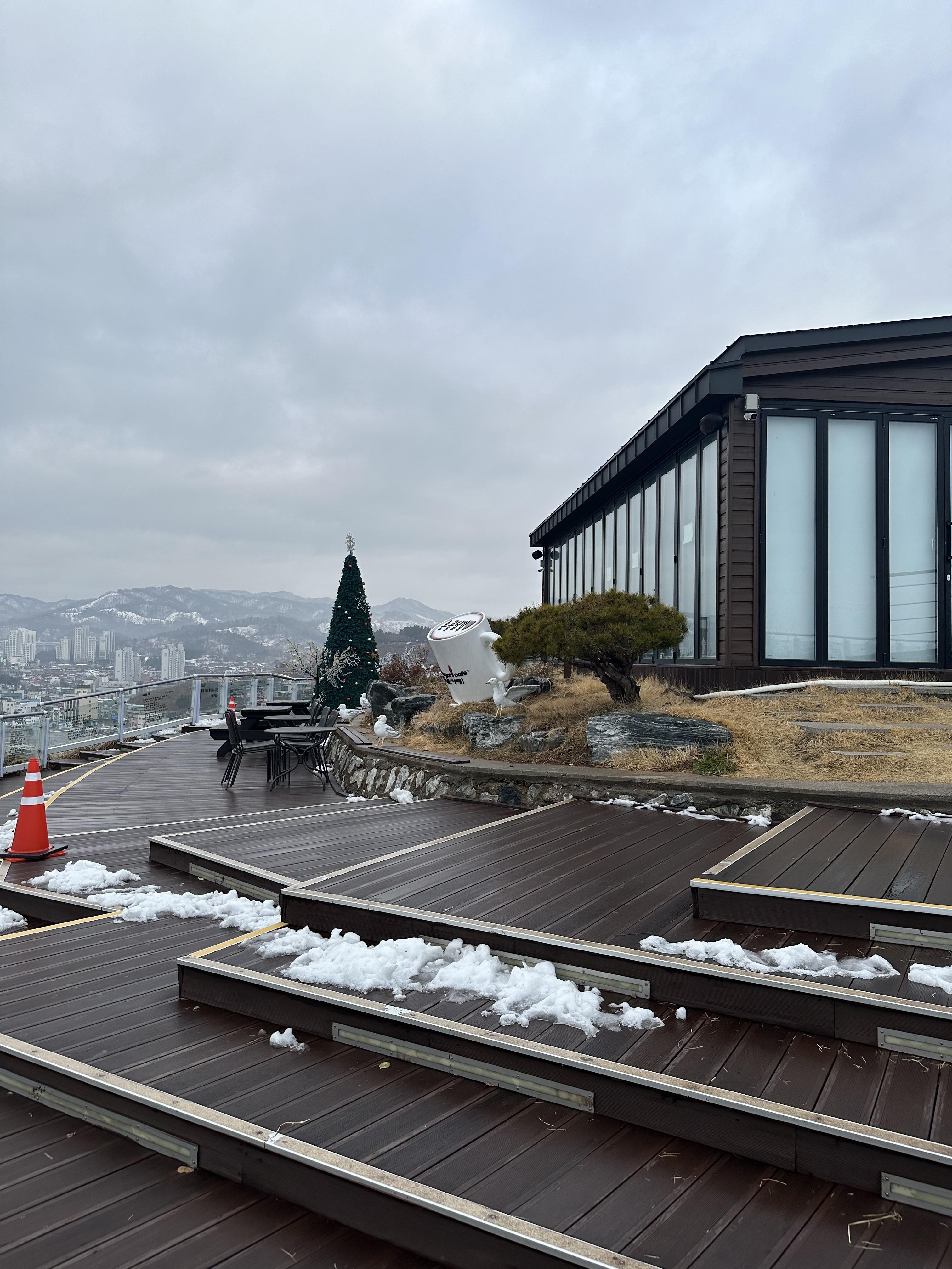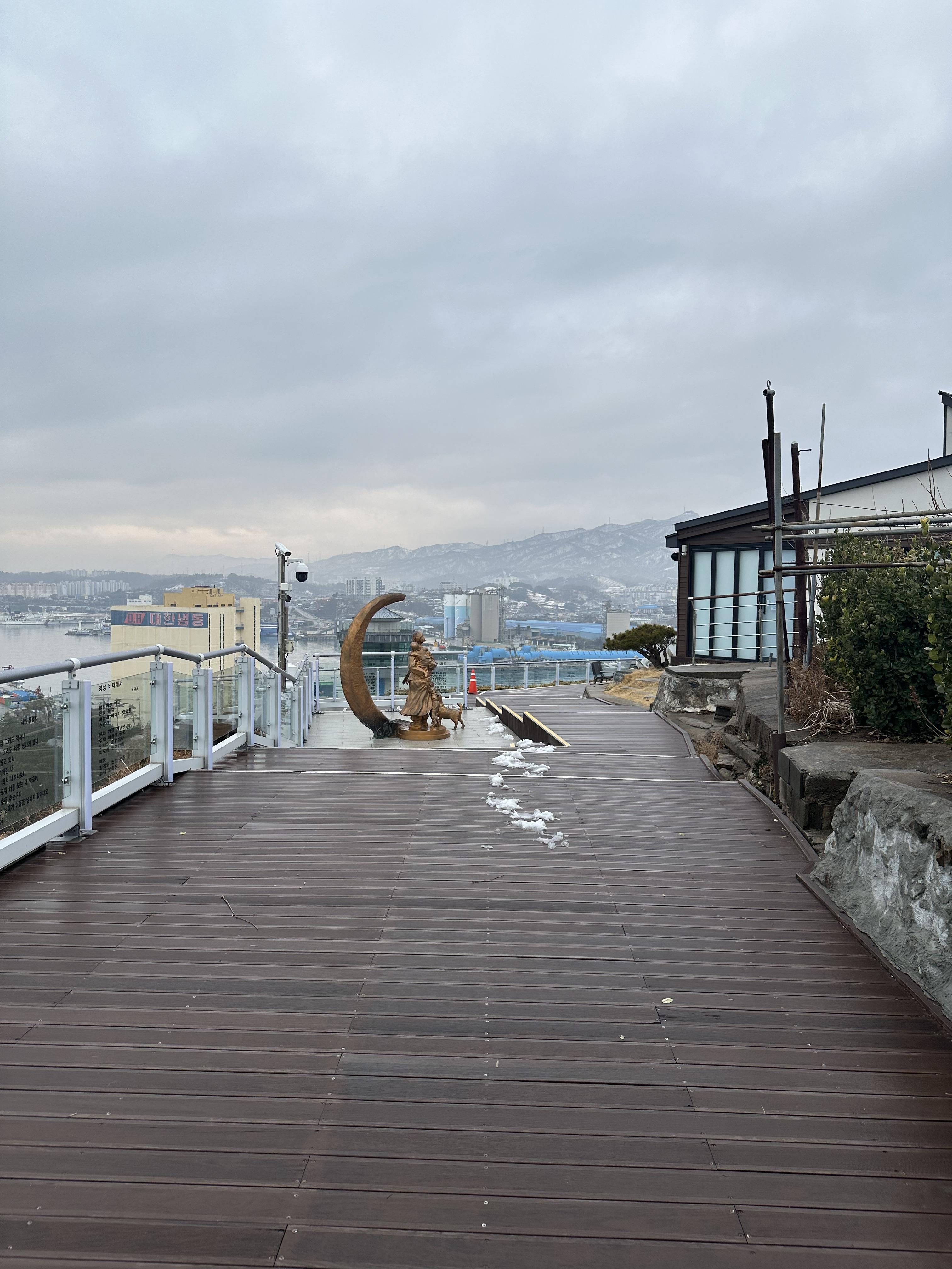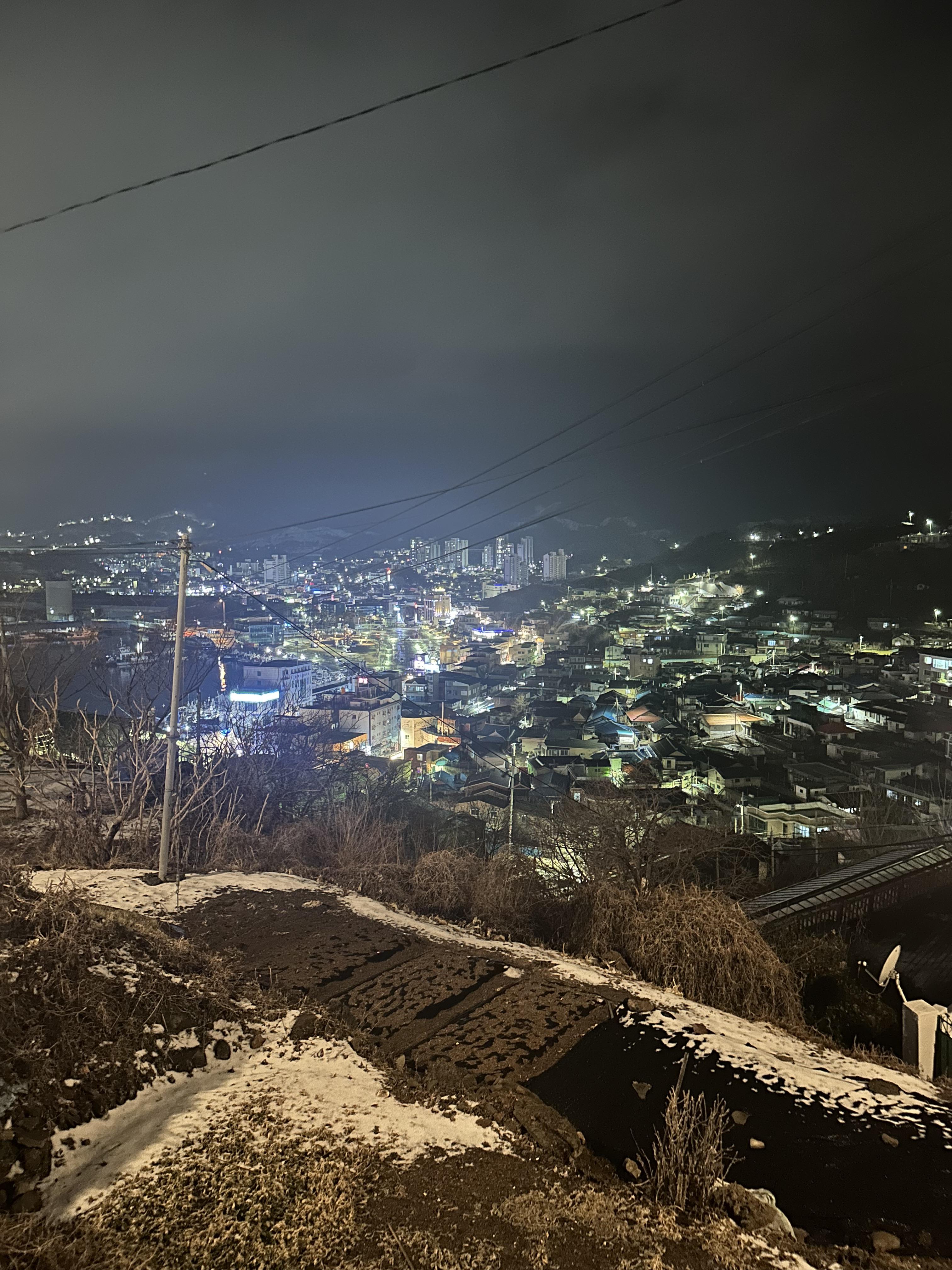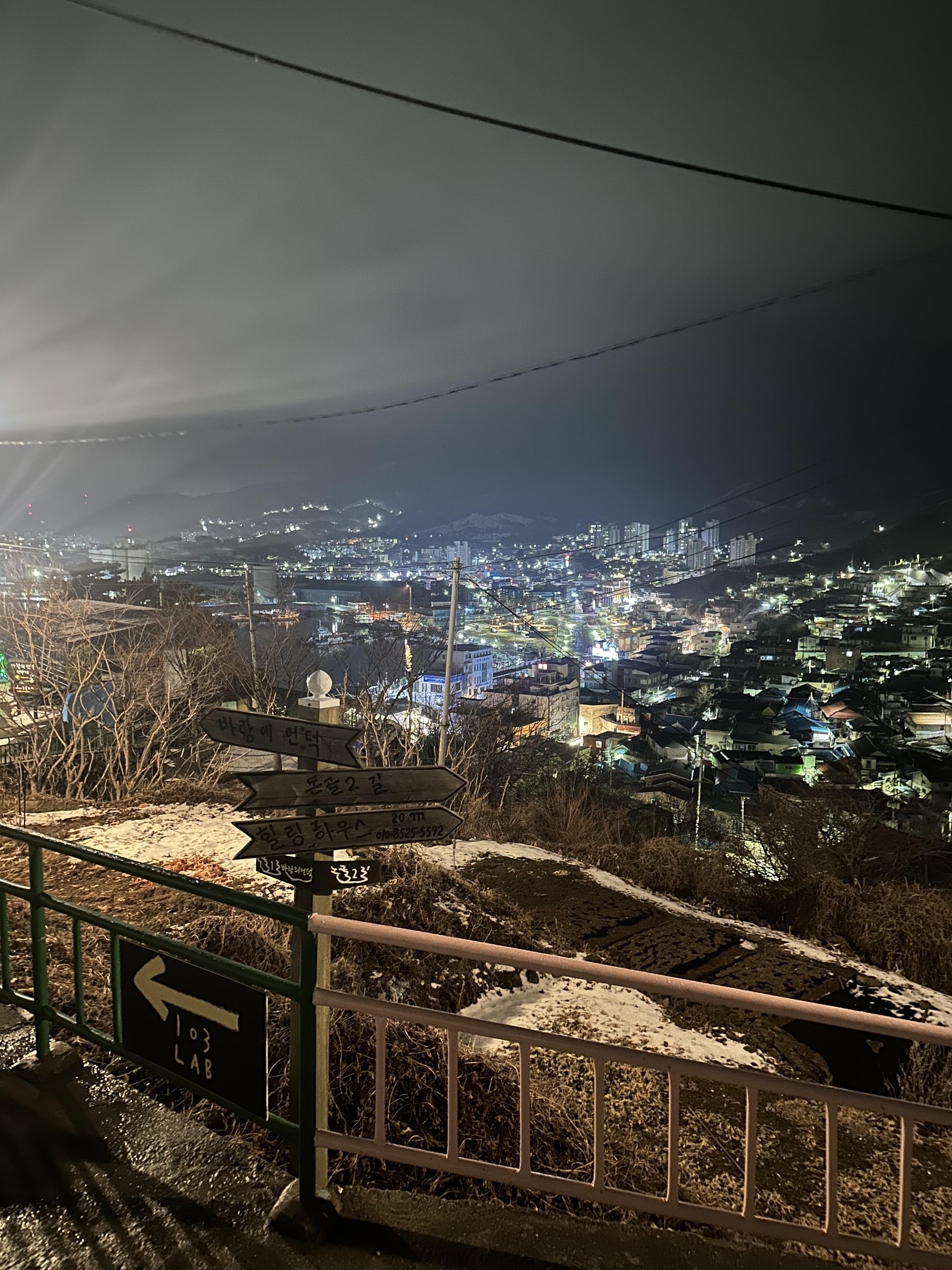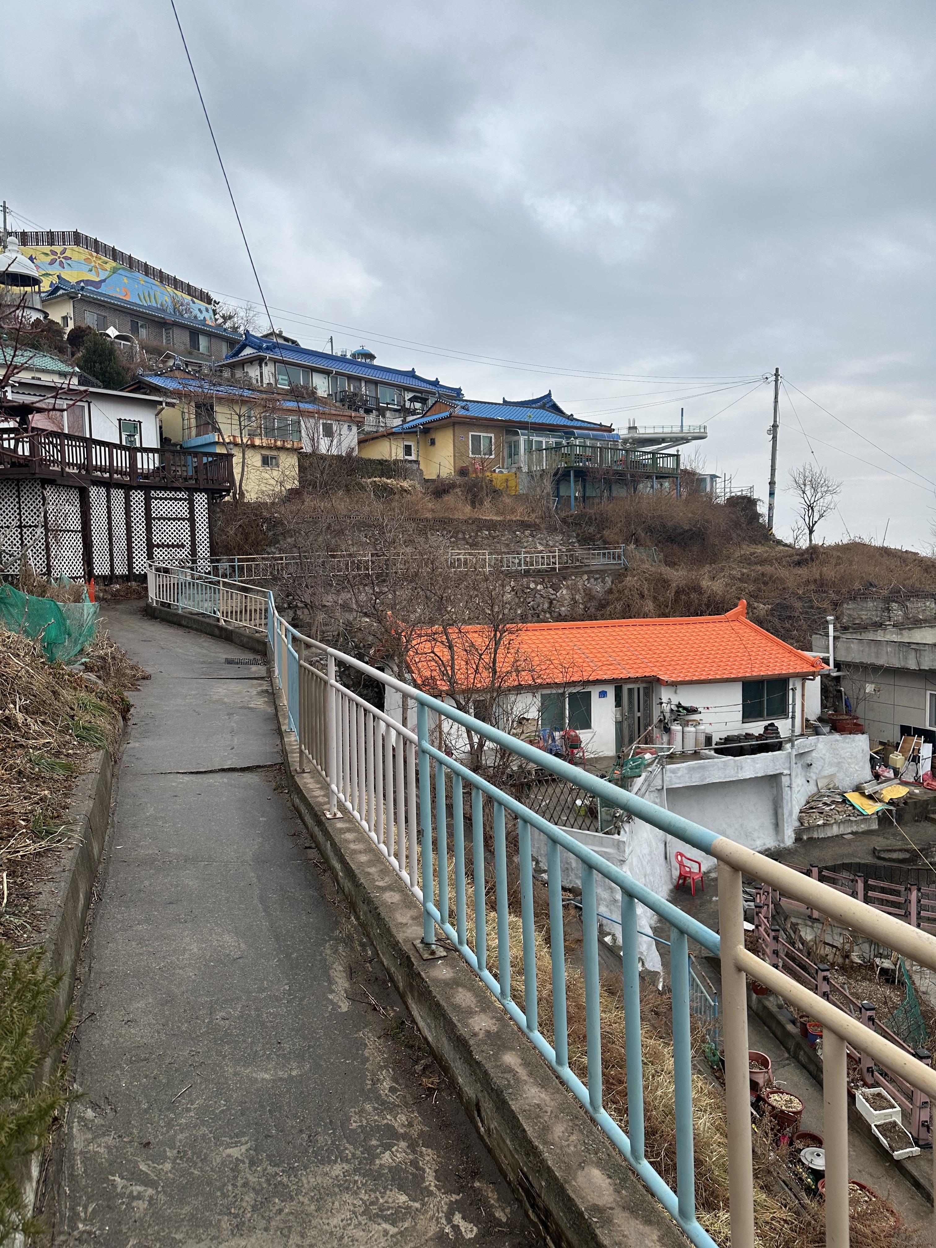 논골담길 벽화마을을 구경하고는 묵호 바람의언덕과는 반대방향으로 묵호 등대로 올라가서 반대편으로 해서 103LAB 게스트하우스로 돌아왔습니다. 겨울이라 그런지 멀리 보이는 산과 마을에는 눈이 쌓인 것을 볼 수 있었습니다. 그러나 최근에 지구온난화 등으로 수도권과 남해안에서는 눈이 많이 안오고 아쉽지만 이렇게 묵호에서 멋진 풍경을 보았습니다.103LAB 게스트하우스에서는 바람의 언덕가 묵호 등대는 서로 연결되어있어서 어느 방향으로 가든 갈 수 있었습니다.