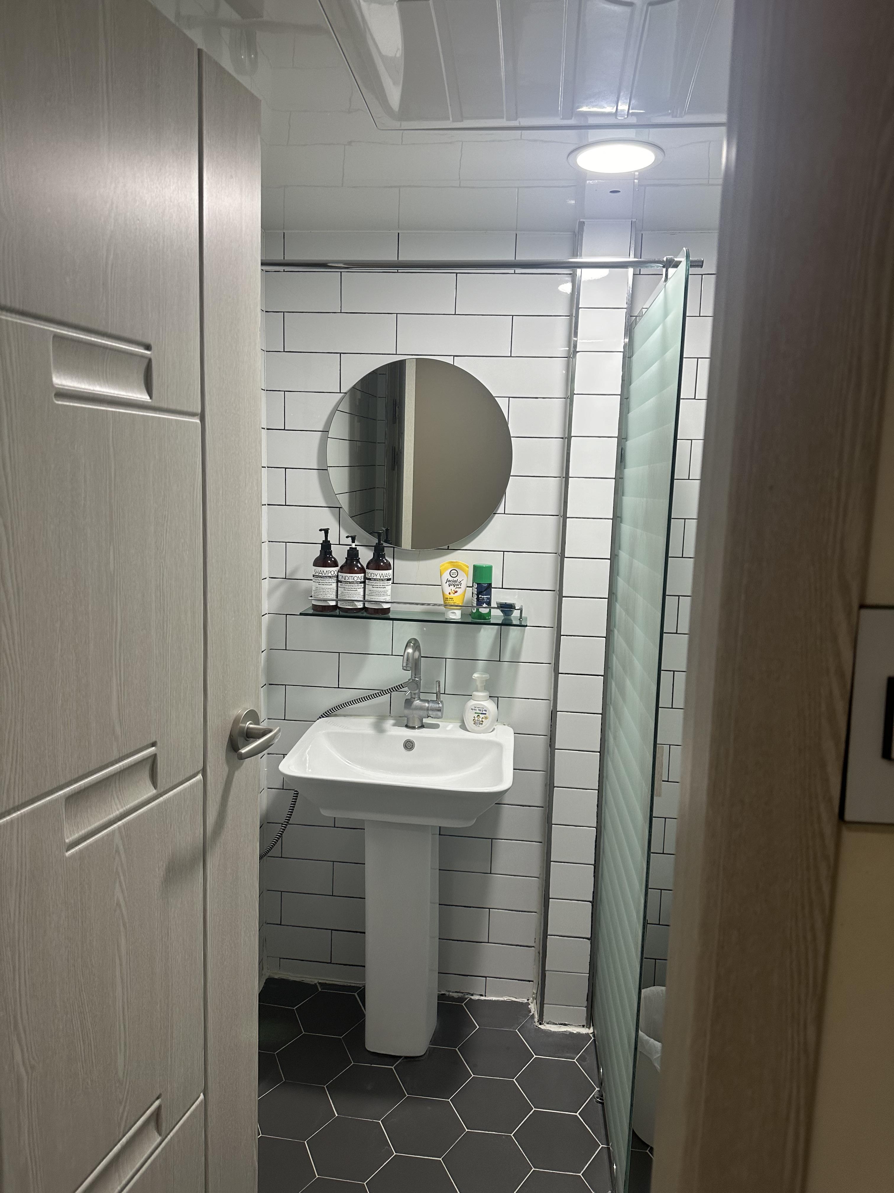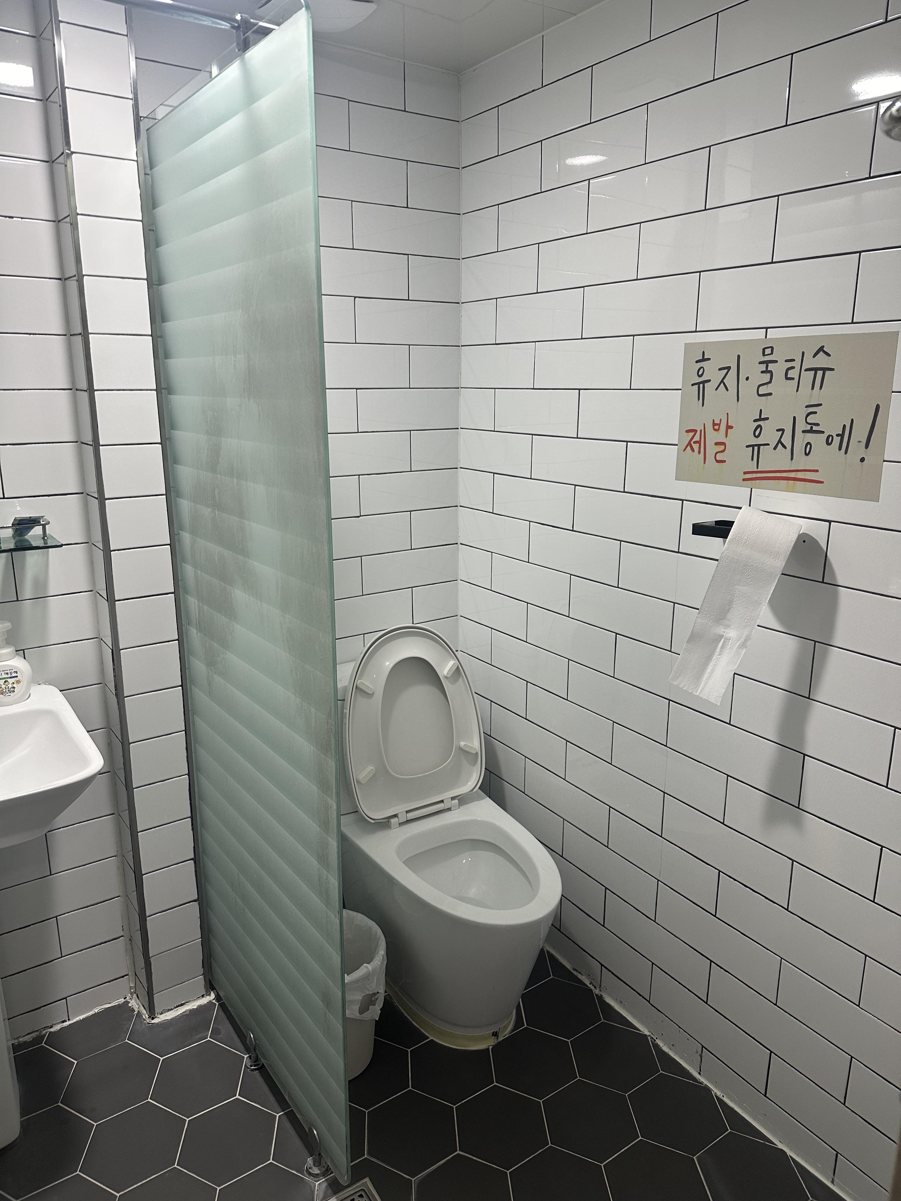 화장실은 변기와 샤워공간에는 칸막이로 구분되어있었습니다. 6인실 객실이라 6명이 모두 입실 할경우 화장실이 비좁을 수 있을것 같습니다. 이날에는 저포함해서 2명이었기 때문에 화장실 이용하는데는 큰 어려움은 없었습니다. 기본적으로 샴푸, 트리트먼트, 린스, 바디워시, 핸드어시 정도는 화장실에 배치되어있었습니다. 게스트하우스의 단점은 아무래도 공용으로 쓰기 때문에 화장실이나 샤워시 오랫동안 이용 시 다른 게스트들이 불편할 수도 있는것이 단점같습니다. 조금더 편하게 이용한다면 좀 더 일찍일어나서 미리 미리 샤워 및 볼일을 본다면 불편하지 않을 것같습니다.