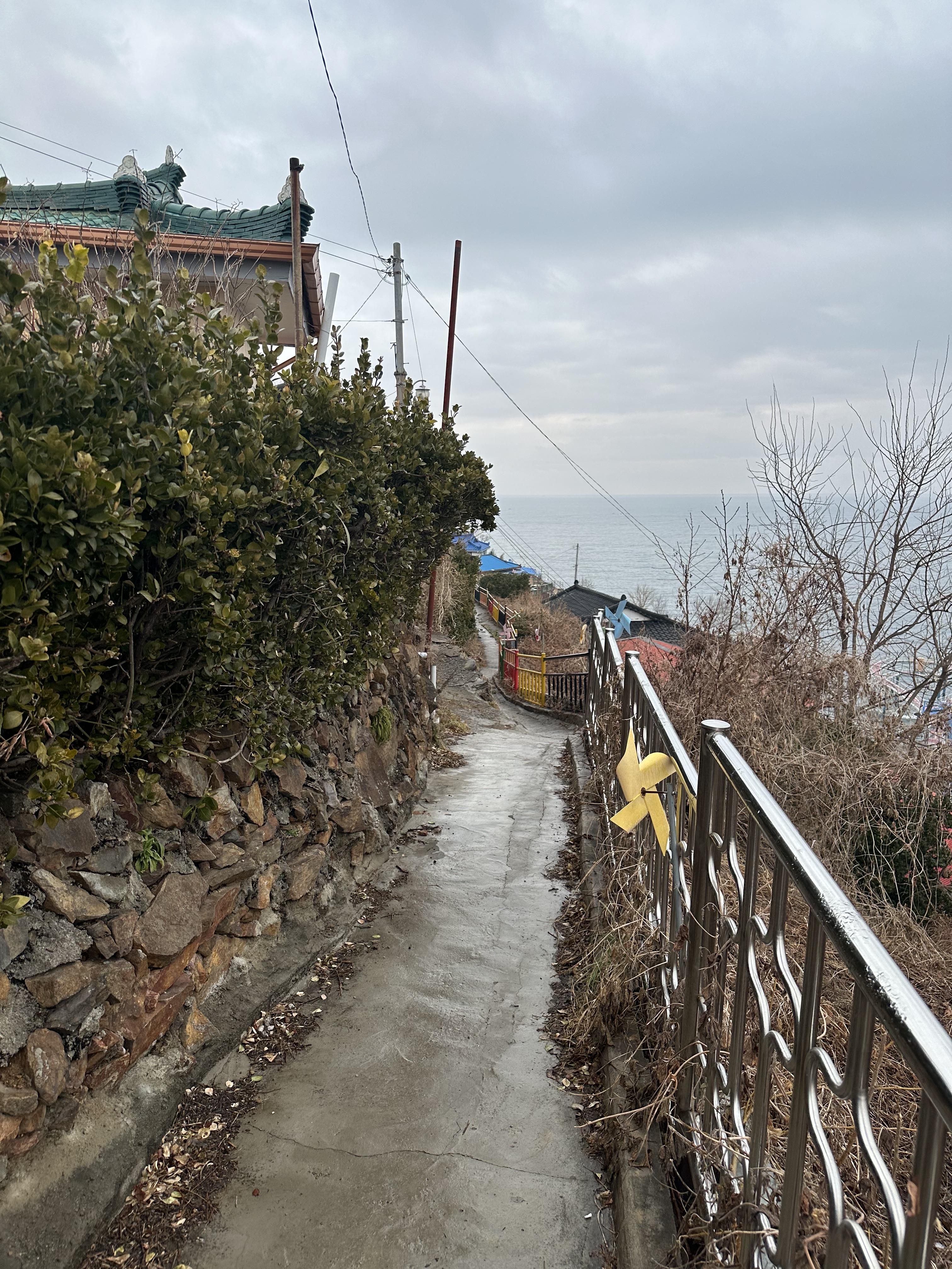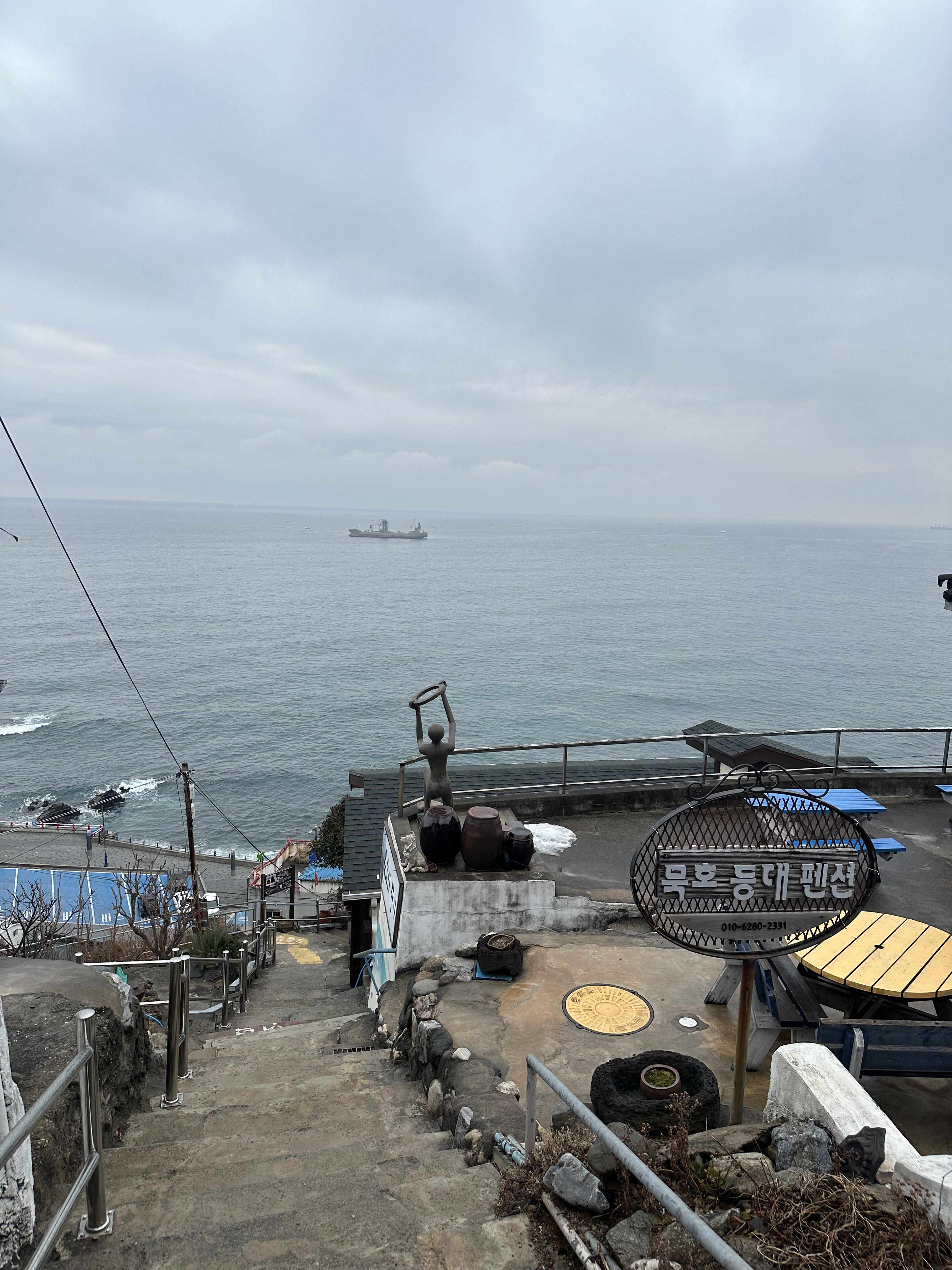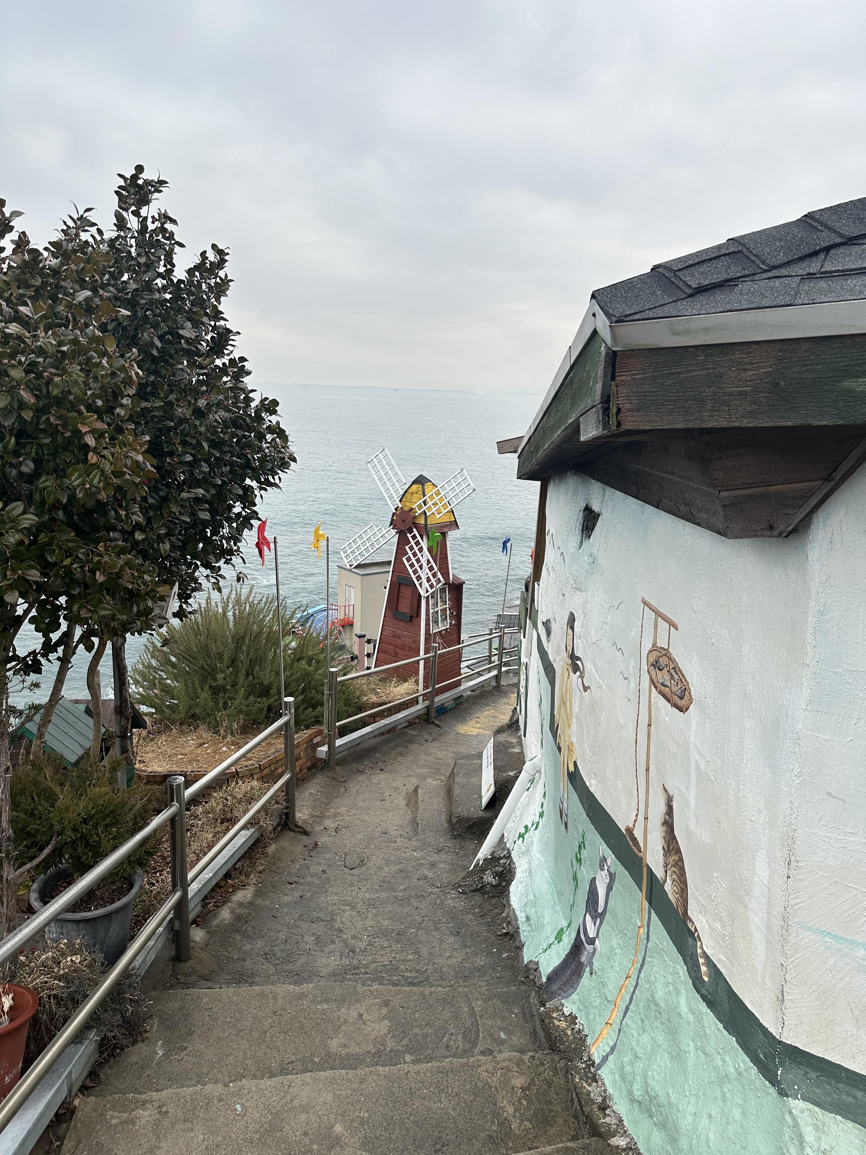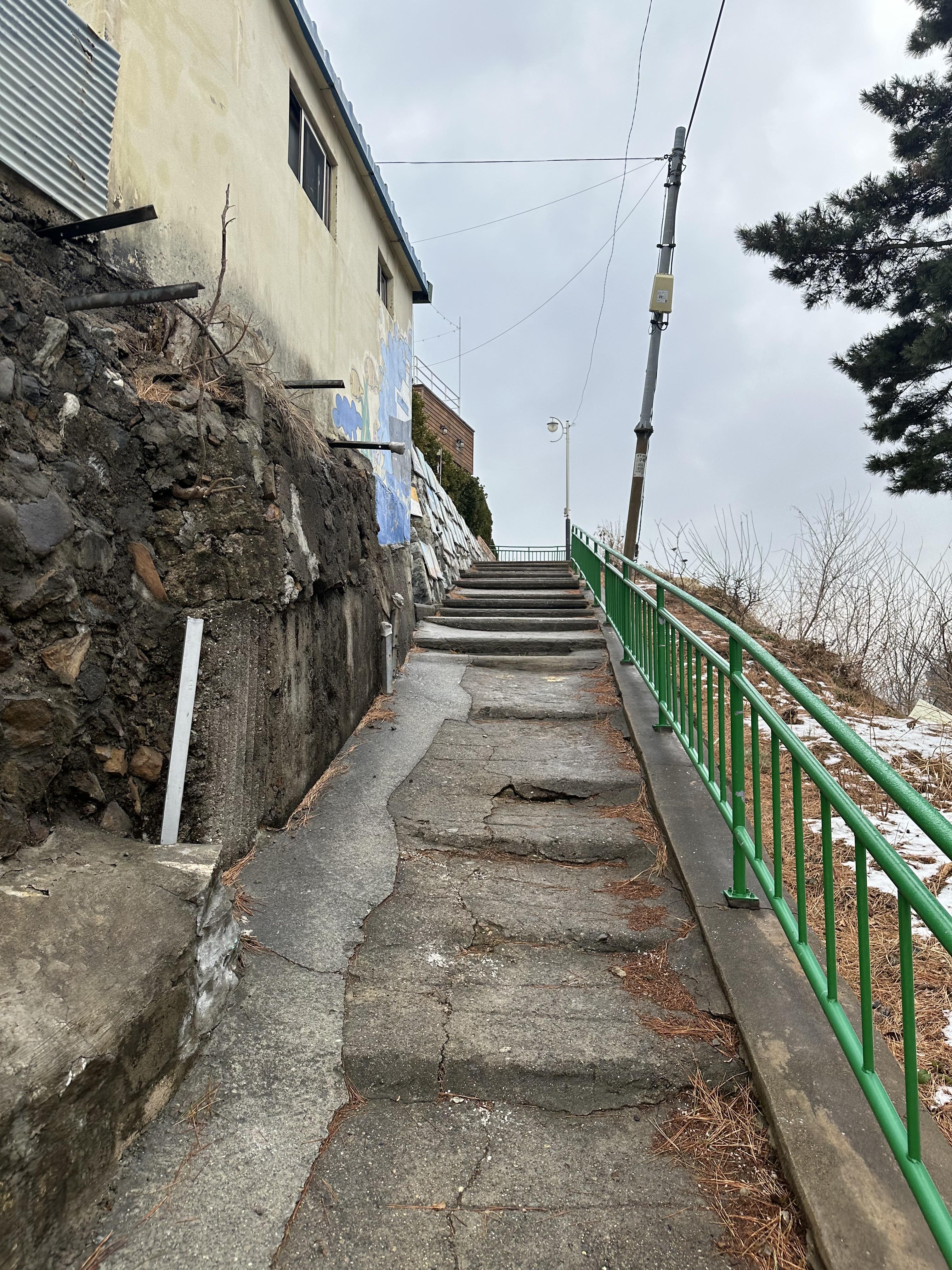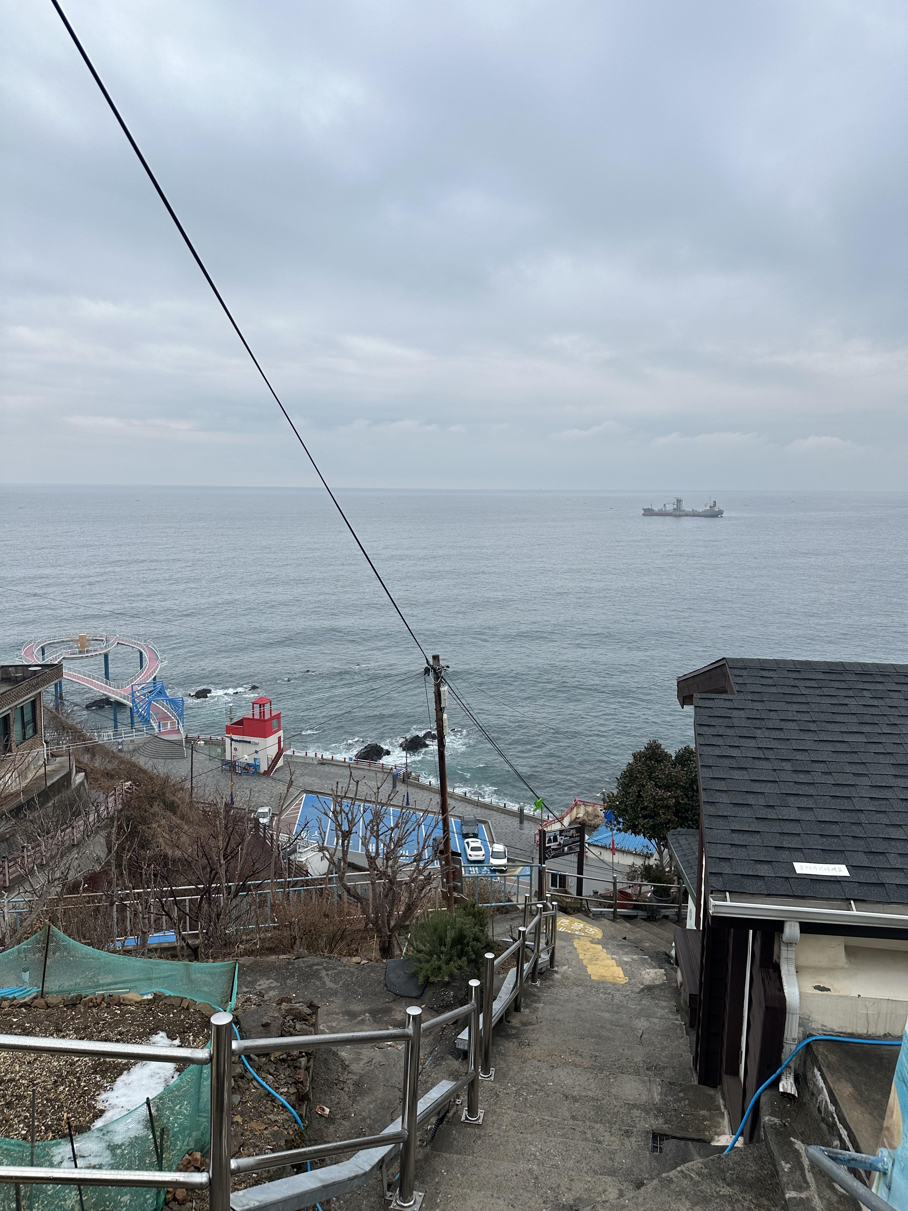 도미토리룸에서 샤워 후 다시 산책을 나갔는데요. 이번에는 묵호 바람의 언덕을 지나서 논골담길 마을로 갔습니다. 통영의 서피랑과 동피랑 마을처럼 묵호 논골달김에도 벽화마을이었습니다. 마을 벽면에 그림이 글러져있고 오르는 계단에도 그림이 그러져있었습니다. 묵호 논골담길의 매력이라면 동해바다 옆으로 높은 언덕위에 마을이 있는 것이 포인트 같습니다. 이렇게 바다를 보며 지나가는데 그 풍경이 아름다웠습니다. 낮에는 시야가 잘 보이기 때문에 괜찮지만 혹시 늦은시간에는 묵호 등대 큰도로 위주로 다니시고 마을 주변을 다닐 때는 추락의 위험도 있으니 잘 보면서 천천히 걷기 바랍니다.