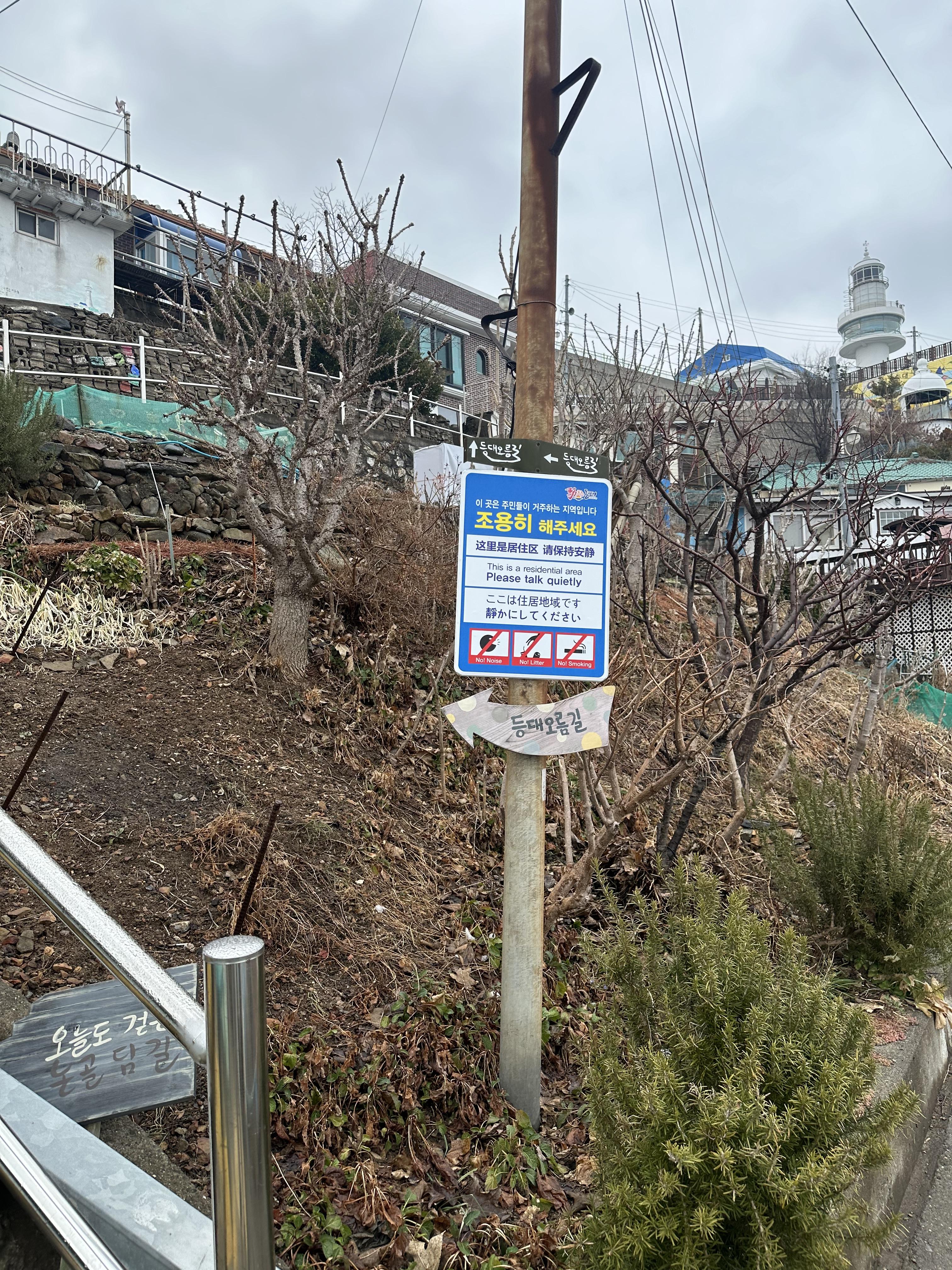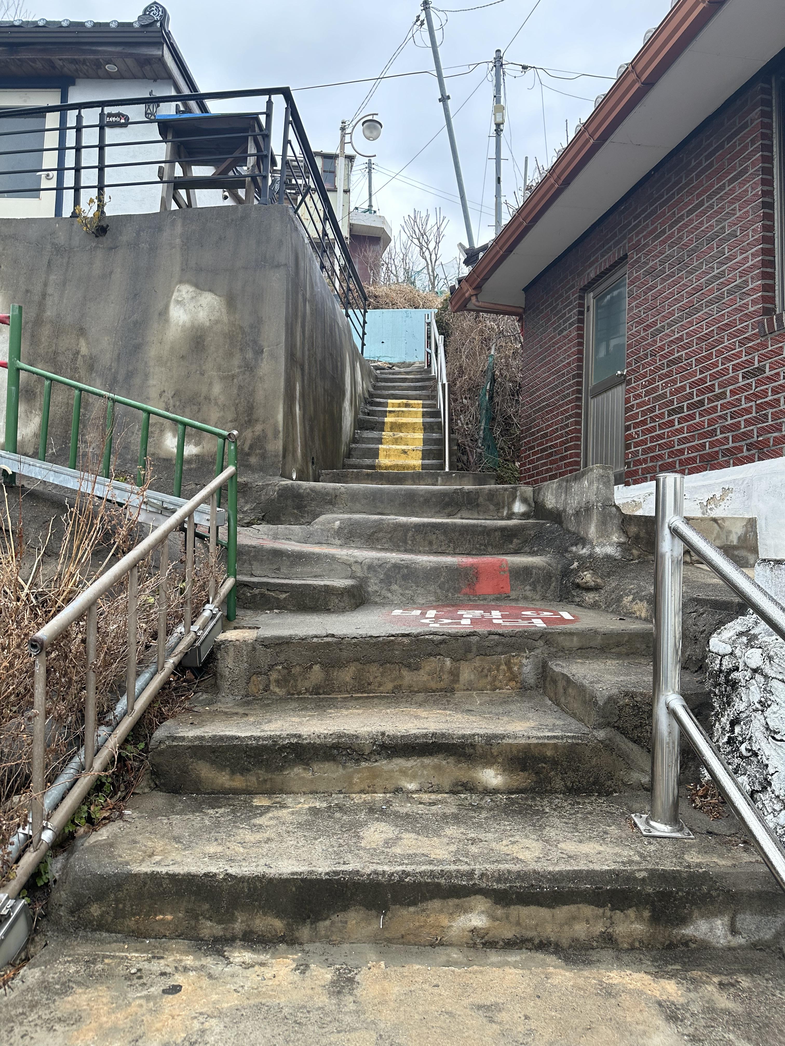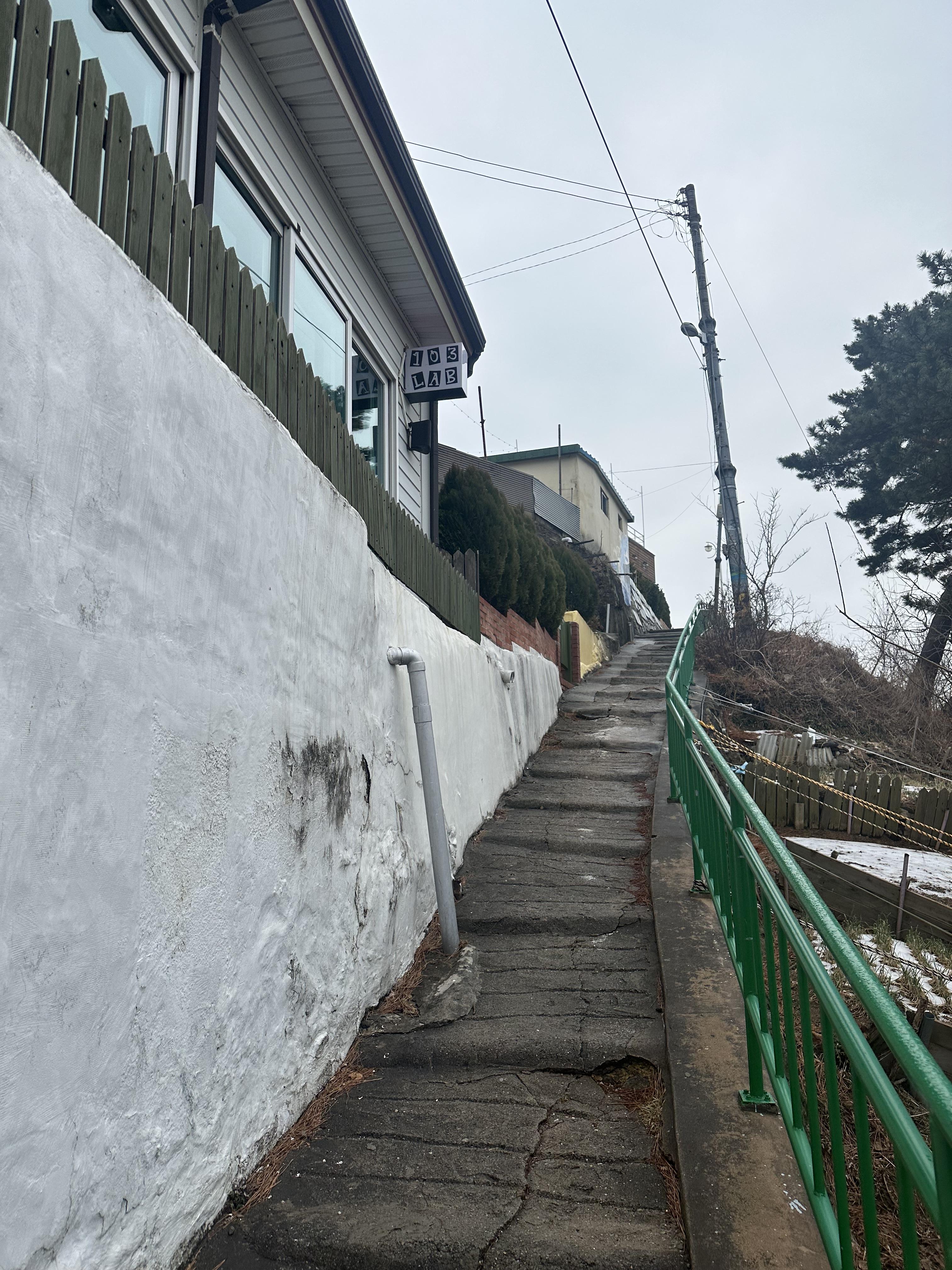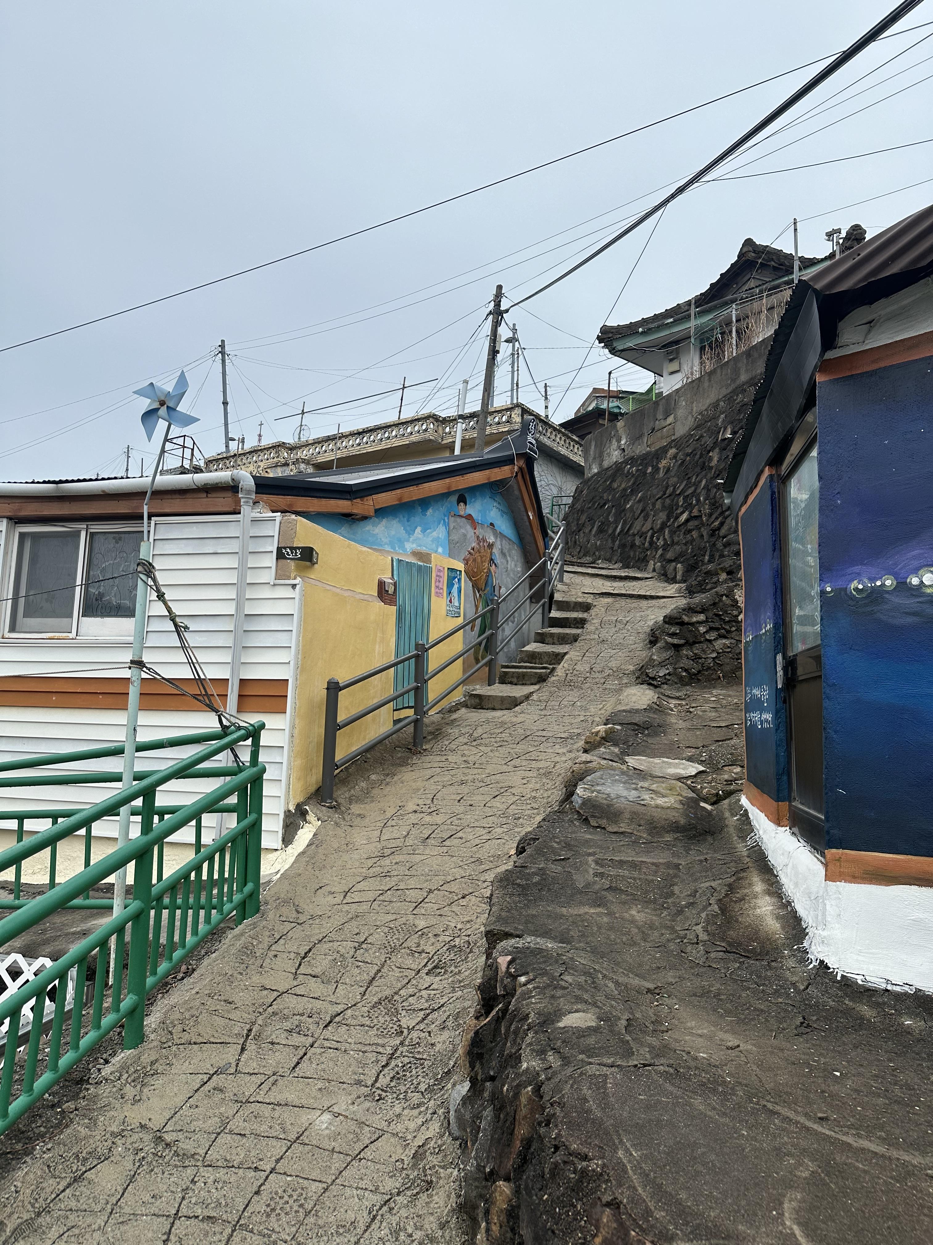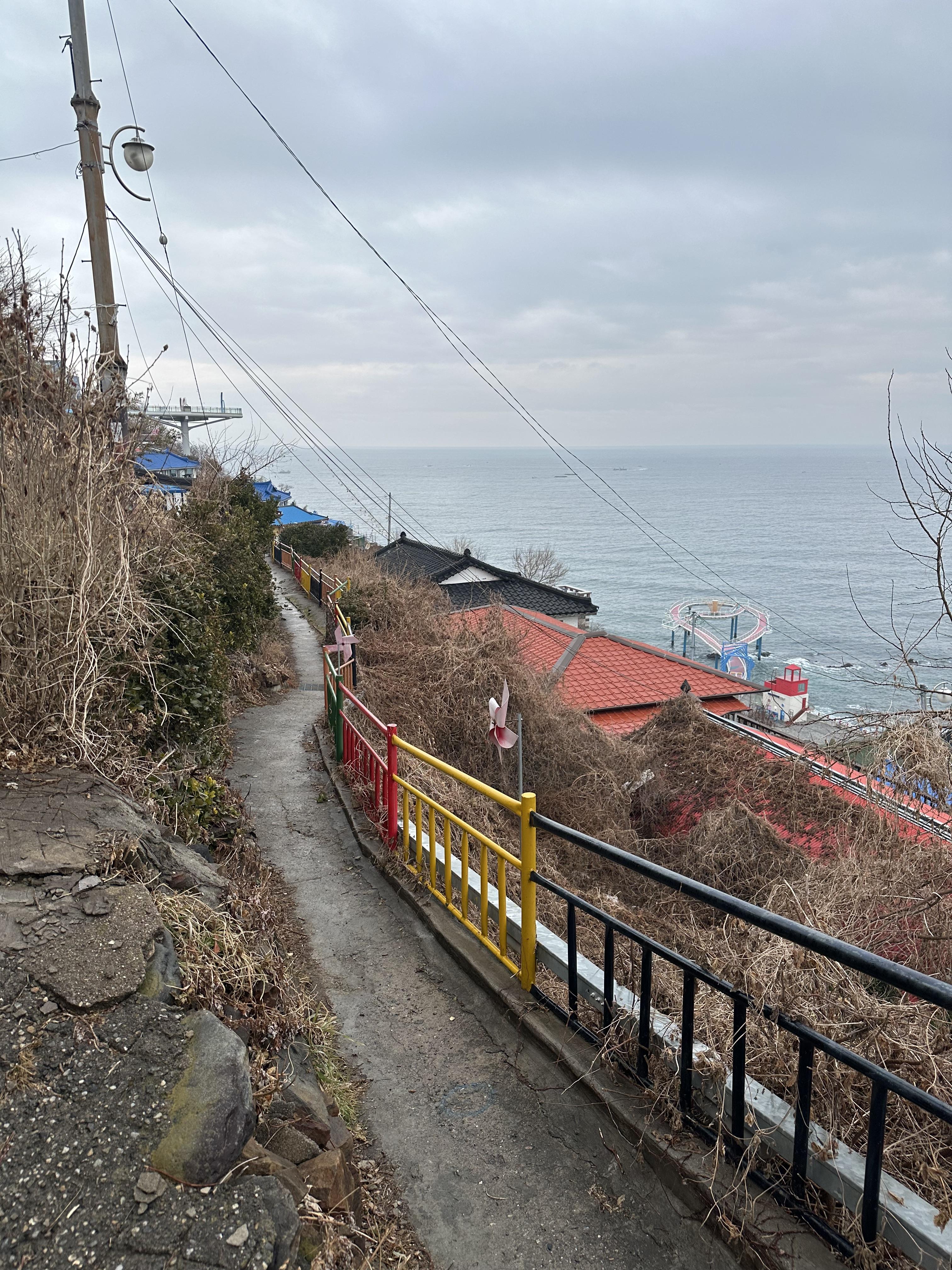 도미토리룸에서 샤워 후 다시 산책을 나갔는데요. 이번에는 묵호 바람의 언덕을 지나서 논골담길 마을로 갔습니다. 통영의 서피랑과 동피랑 마을처럼 묵호 논골달김에도 벽화마을이었습니다. 마을 벽면에 그림이 글러져있고 오르는 계단에도 그림이 그러져있었습니다. 묵호 논골담길의 매력이라면 동해바다 옆으로 높은 언덕위에 마을이 있는 것이 포인트 같습니다. 이렇게 바다를 보며 지나가는데 그 풍경이 아름다웠습니다. 낮에는 시야가 잘 보이기 때문에 괜찮지만 혹시 늦은시간에는 묵호 등대 큰도로 위주로 다니시고 마을 주변을 다닐 때는 추락의 위험도 있으니 잘 보면서 천천히 걷기 바랍니다.